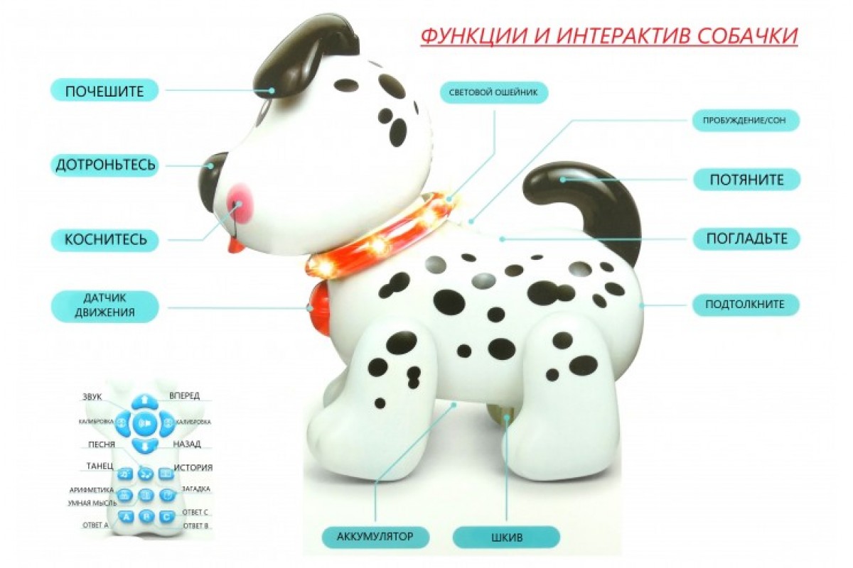 Собачка реагирует на прикосновения , действия и элементы указаны на картинке. Помимо этого управлять собачкой можно с помощью пульта управления , запрограммируйте ее для себя и наслаждайтесь играми!
