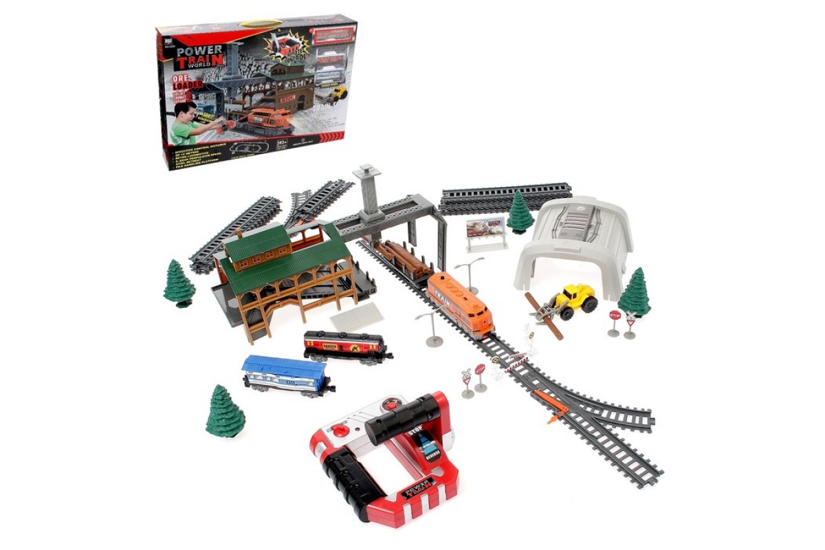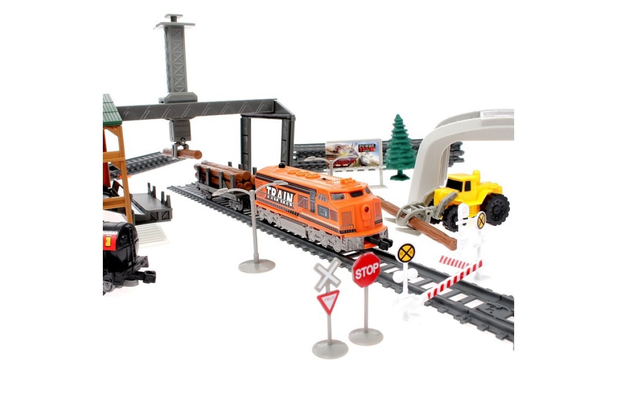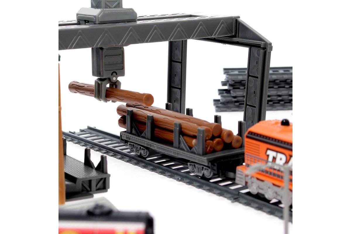 - В набор входит: 1 головной вагон, 3 грузовых вагона, рельсы (32 шт.), бревна, 1 погрузчик, станция, тунель и элементы декора.