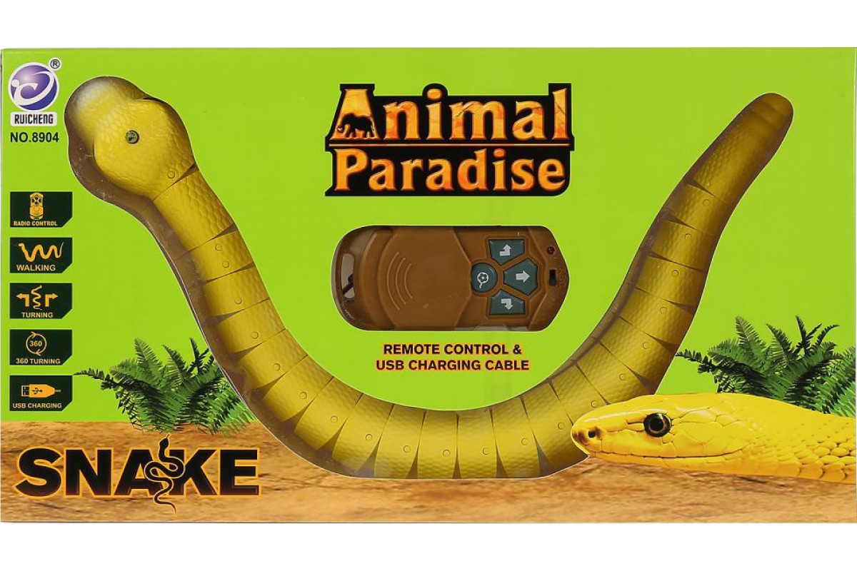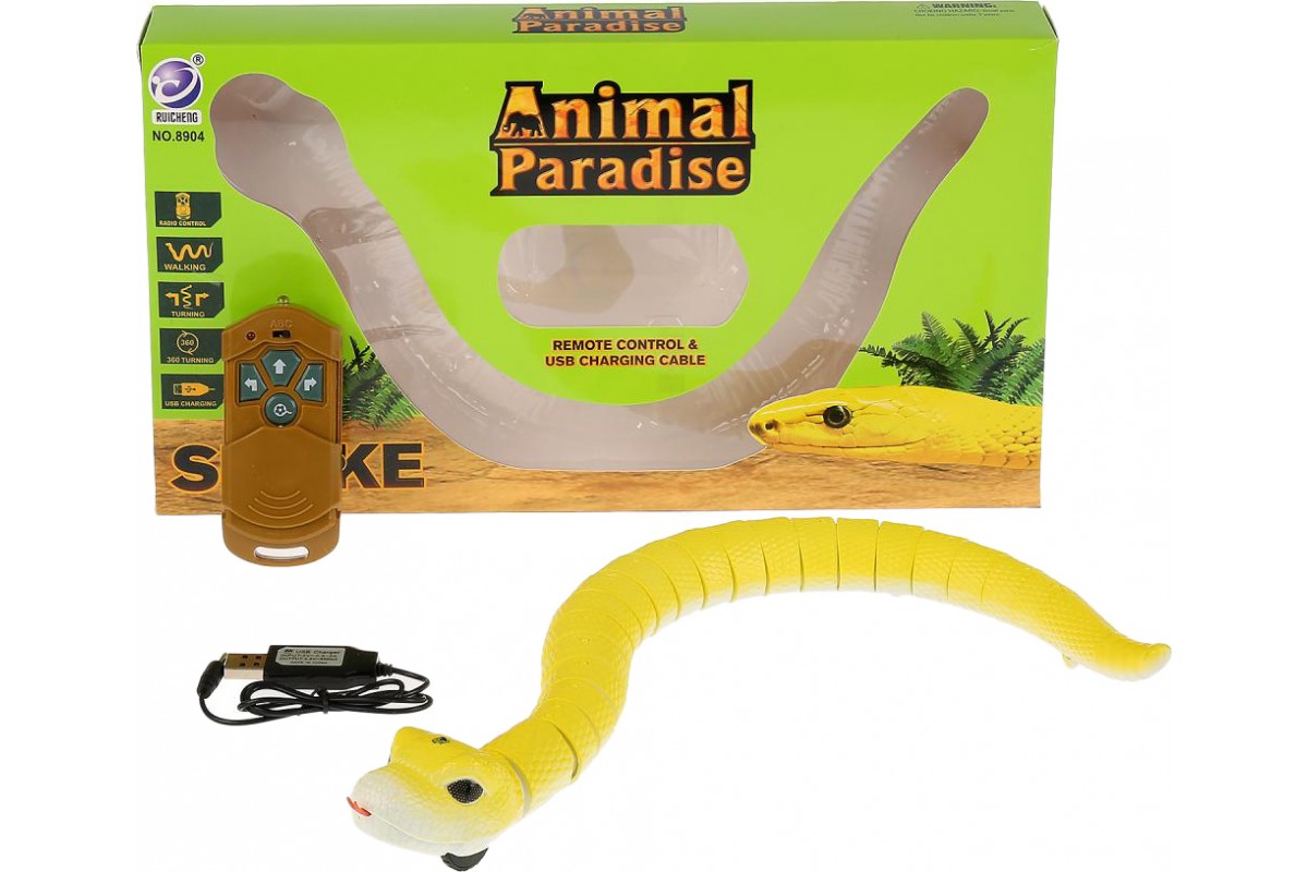 Радиоуправляемая желтая змея RuiCheng - RUI-8904-YELLOW - это змея на пульте управления 8904, которая ползает как настоящая! Игрушка изготовлена из высококачественного и экологически чистого материала. Управляется с помощью инфракрасного пульта ДУ. Змея может двигаться вперед, вправо, влево, по кругу. Работает от аккумуляторной батареи (входит в комплект). Пульт дистанционного управления работает от 2-х батареек типа ''АА'' 1.5V (не входят в комплект).
