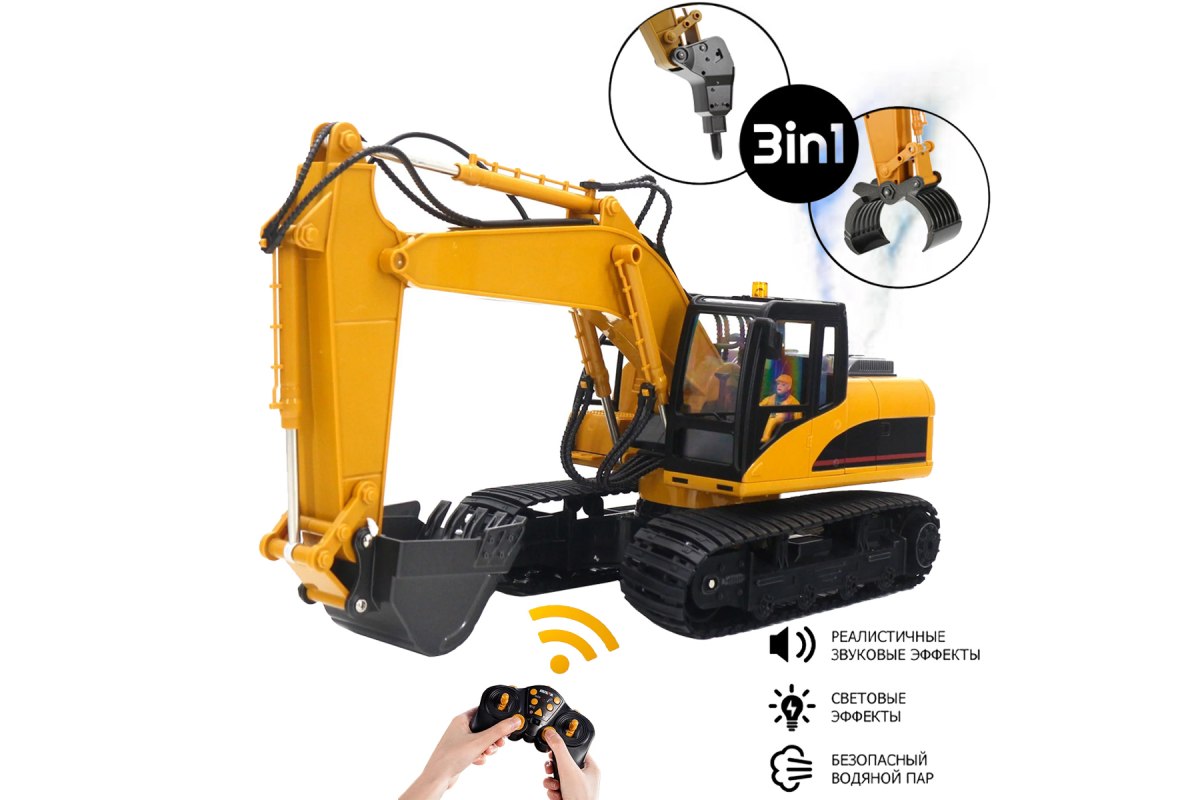 Радиоуправляемый экскаватор HUINA 3in1 с паром (ковш, отбойник, захват бревен) 1:14 - HN1535-1 - это копия настоящего экскаватора, отличный пример современной и функциональной строительной техники для детей. В комплекте сменные насадки для создания сразу трех моделей: HN1550, HN1560 и HN1570.