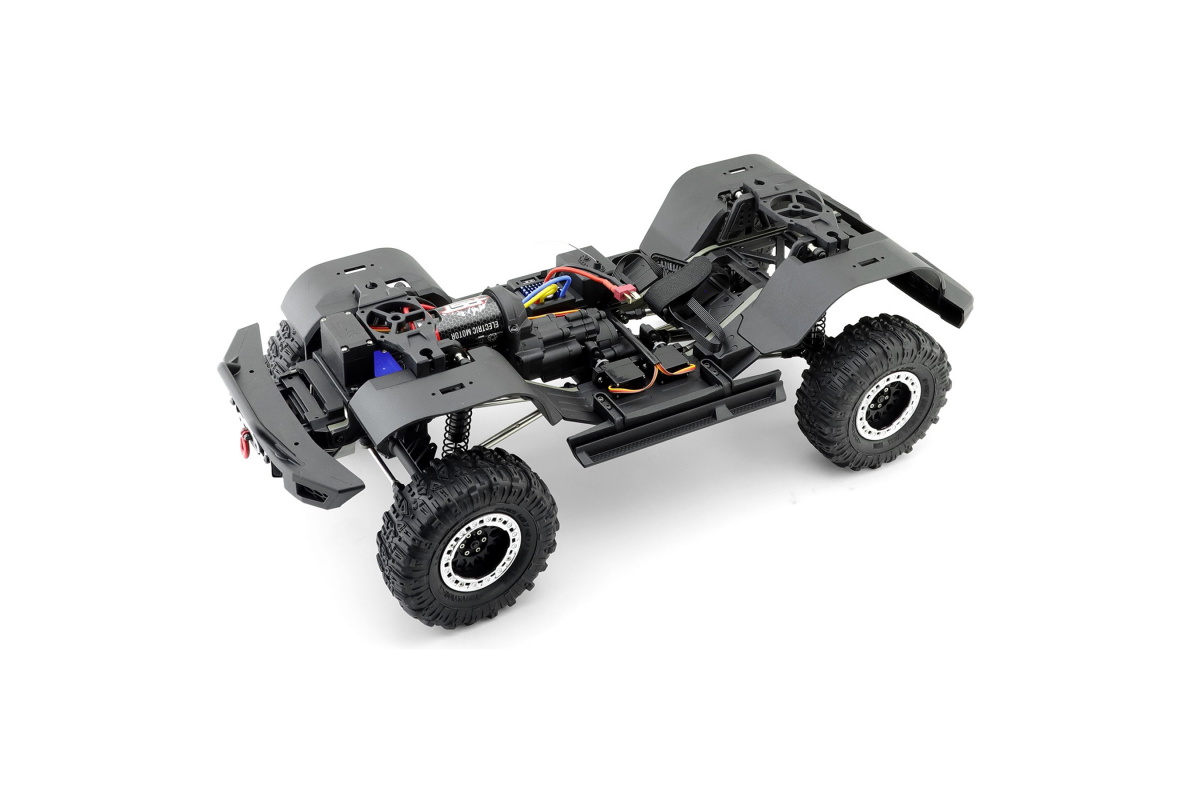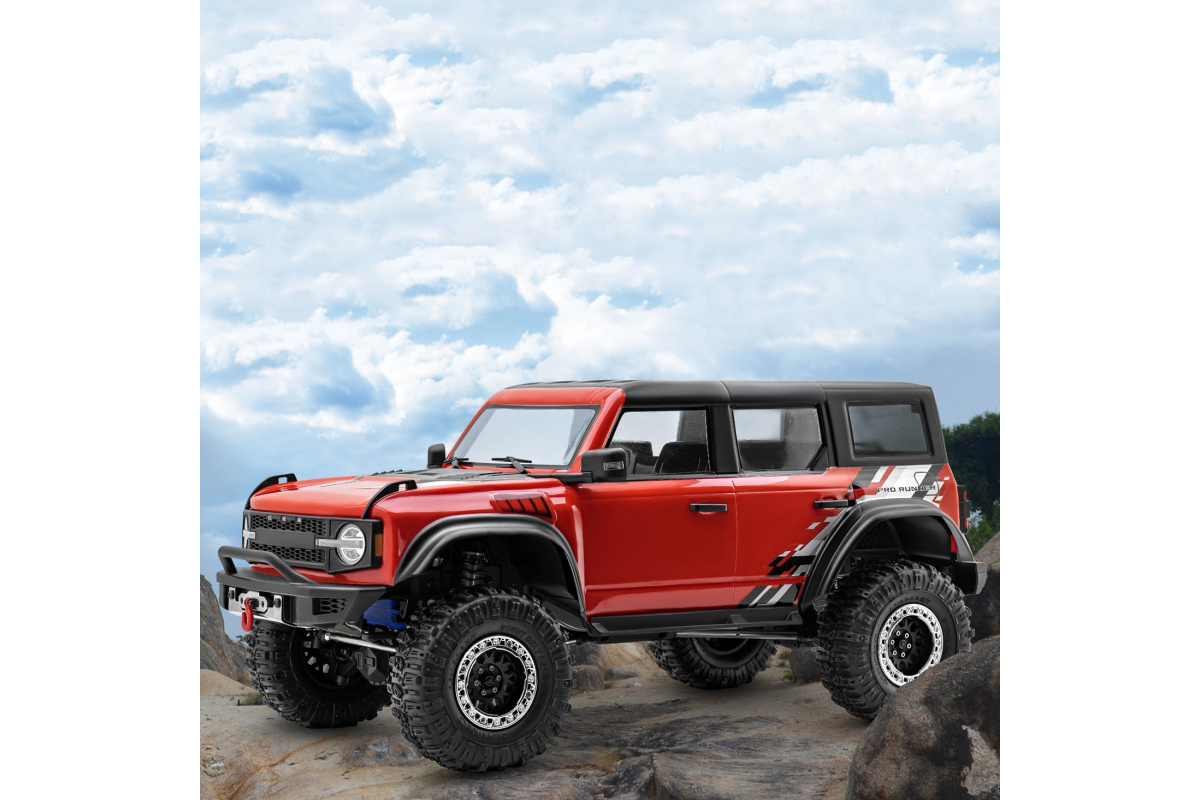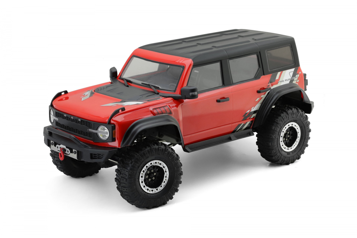 Модель имеет портальные мосты, двухскоростную коробку передач, 4WD, функцию блокировки задней оси и свободно переключаемый передний привод, режим разных скоростей между передним и задним приводом для восхождения. Pro Runner оснащен на заводе лебедкой с функцией разблокировки, задний мост в корпусе для поперечной устойчивости, светодиоды, 6-канальный передатчик, двигателем с очень плавным ходом.