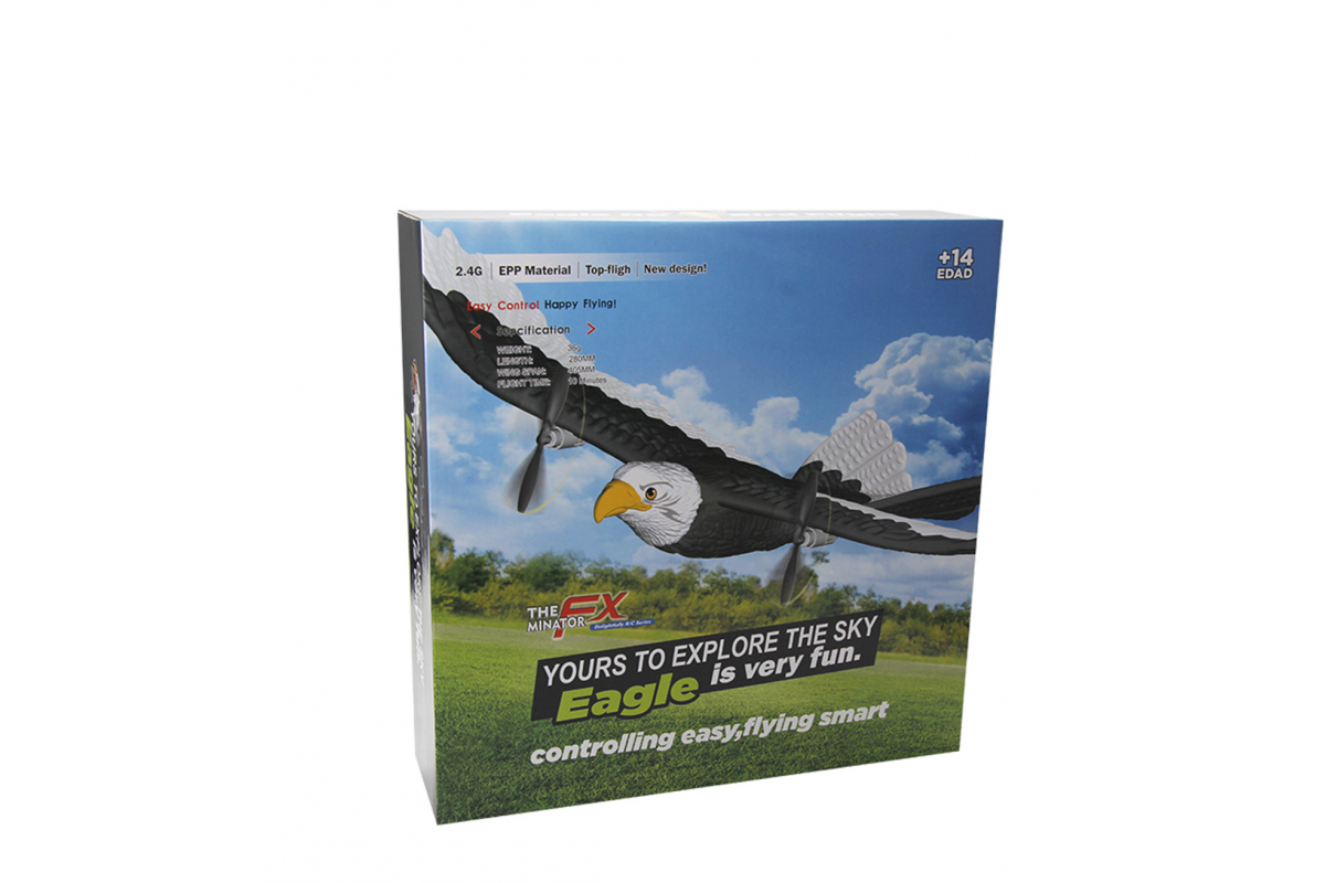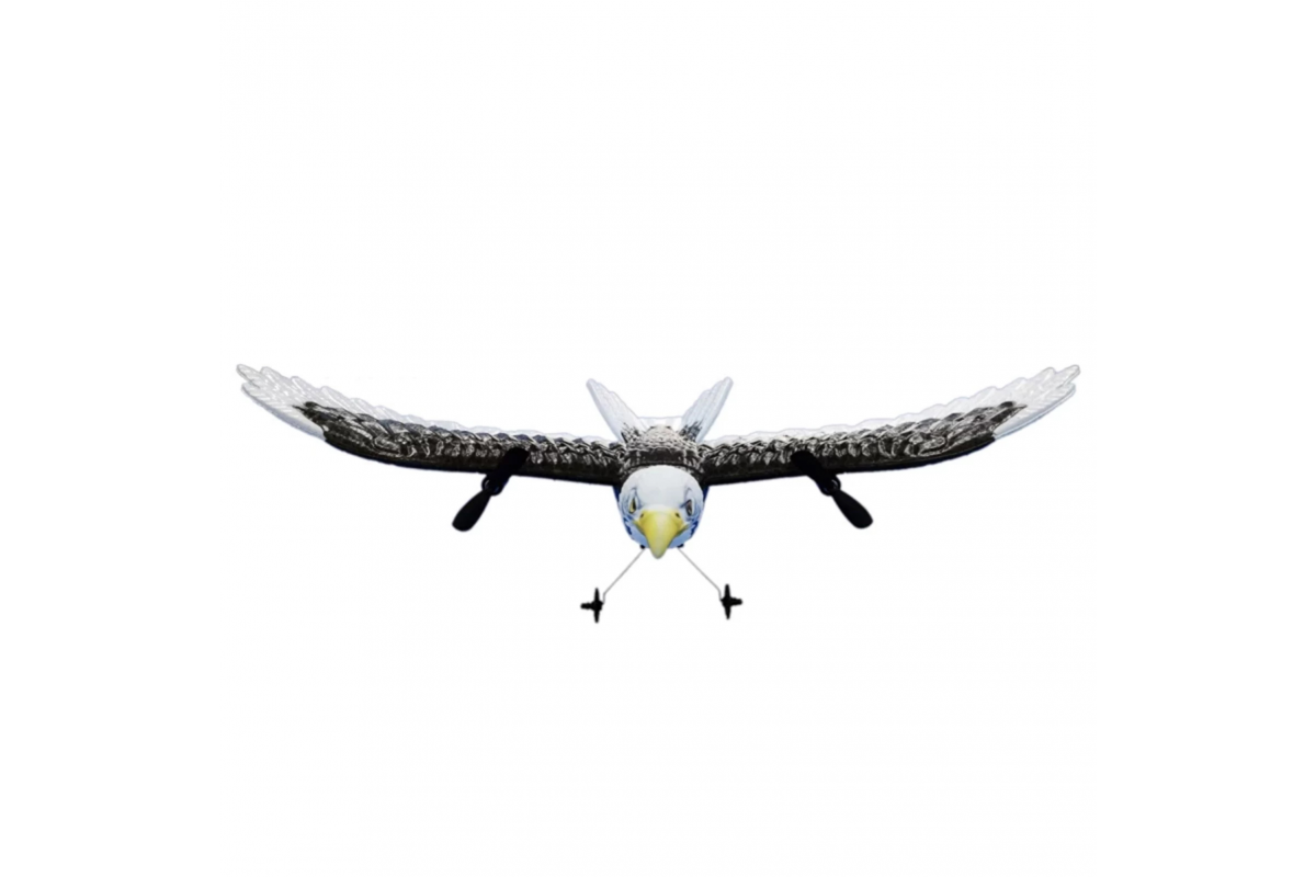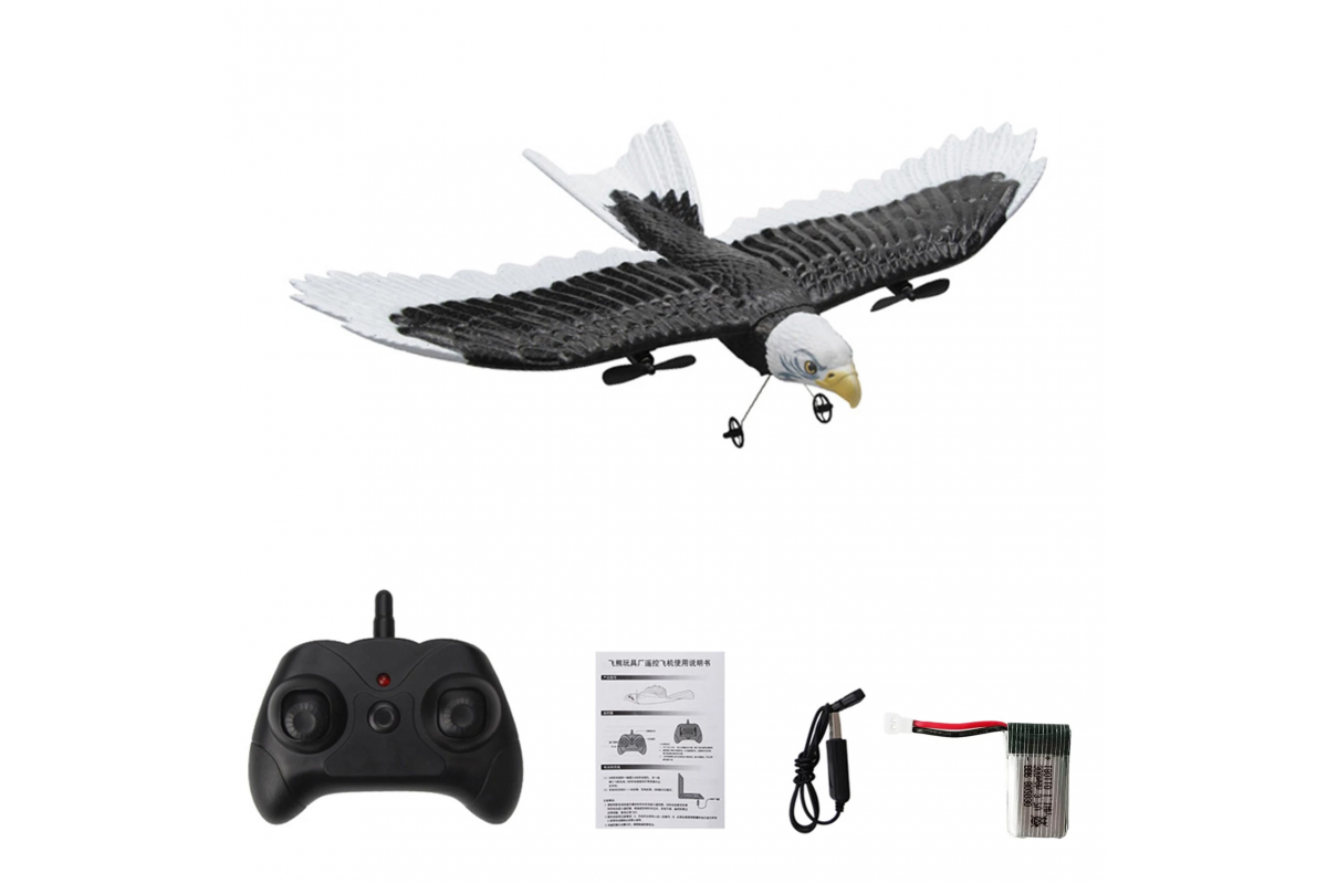 Пульт дистанционного управления, обеспечивает простой и комфортный контроль над орланом на расстоянии более 50 метров. Для работы пульта управления необходимо докупить 2хАА батарейки. Двигатели расположены в крыльях птицы. Изменяемая скорость вращения винтов, позволяет менять направление полета орла. Аккумулятор 3,7 V/150 mAh обеспечивает до 10 минут полета.
