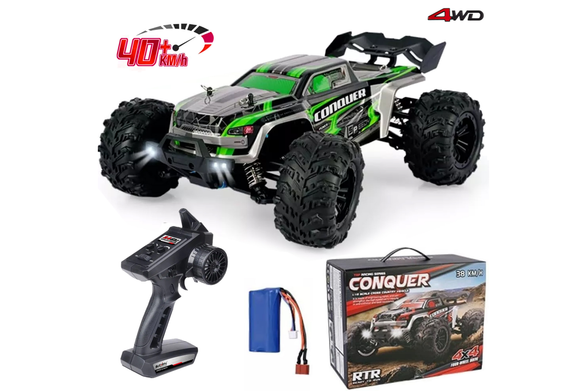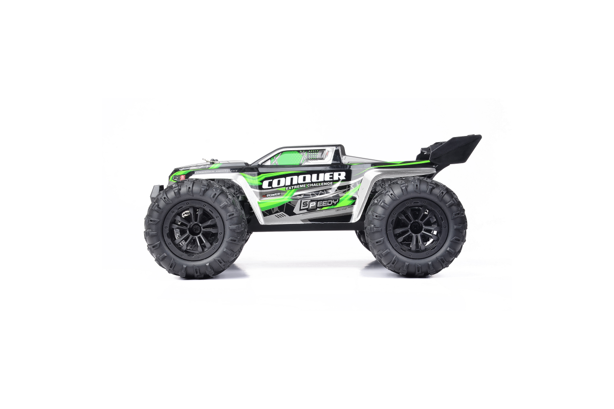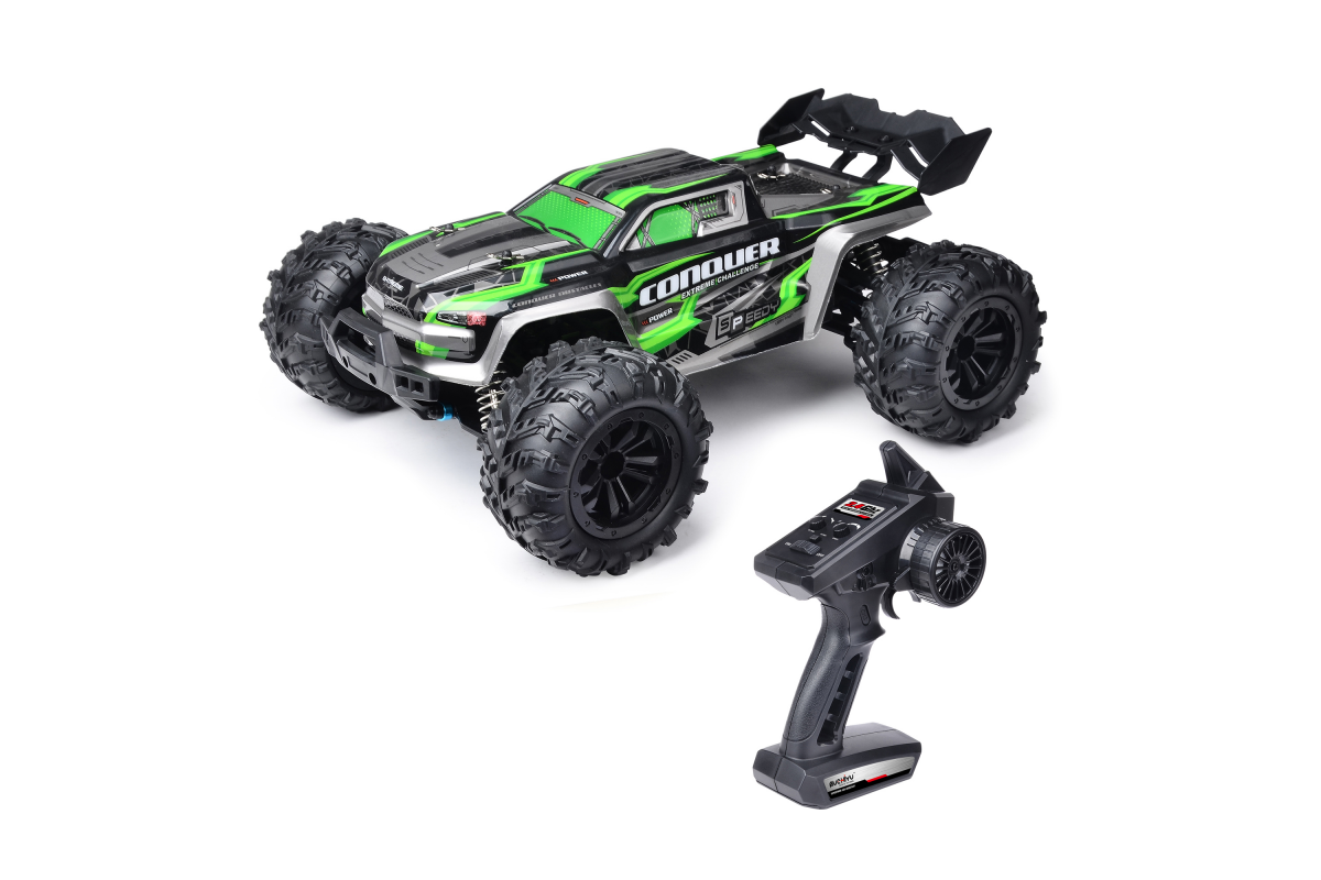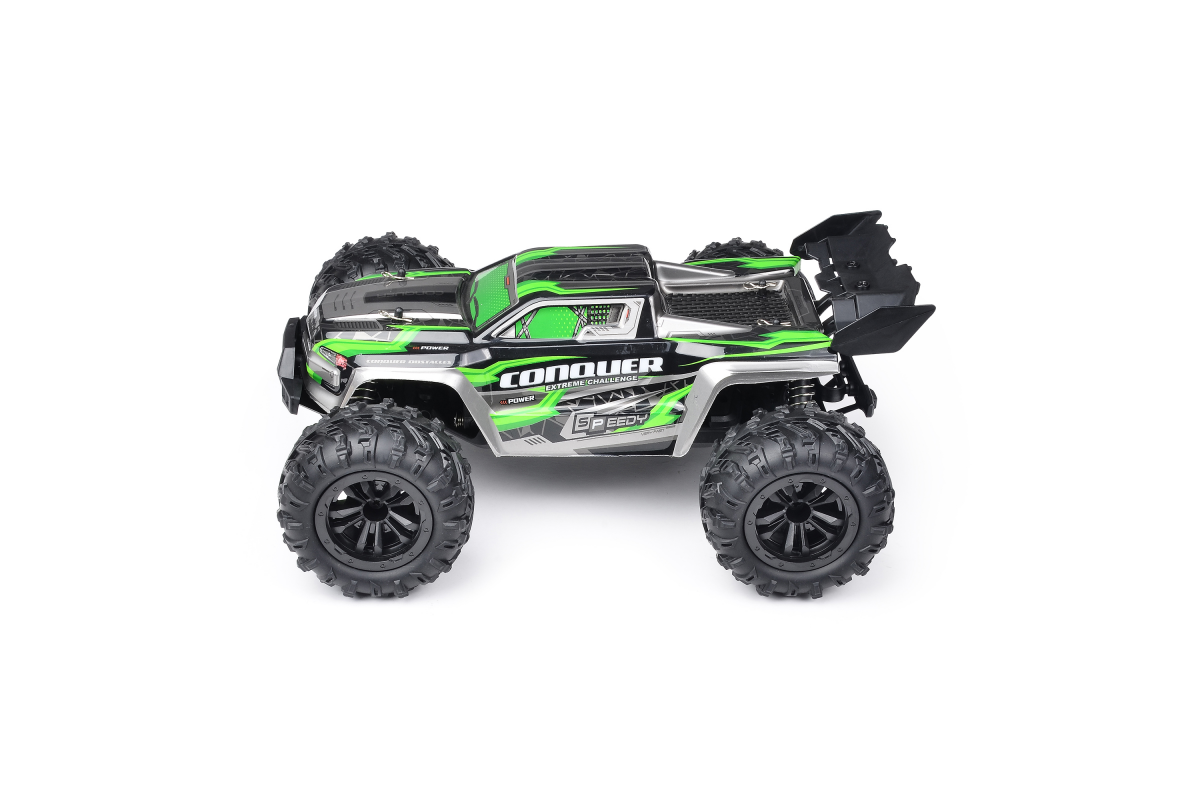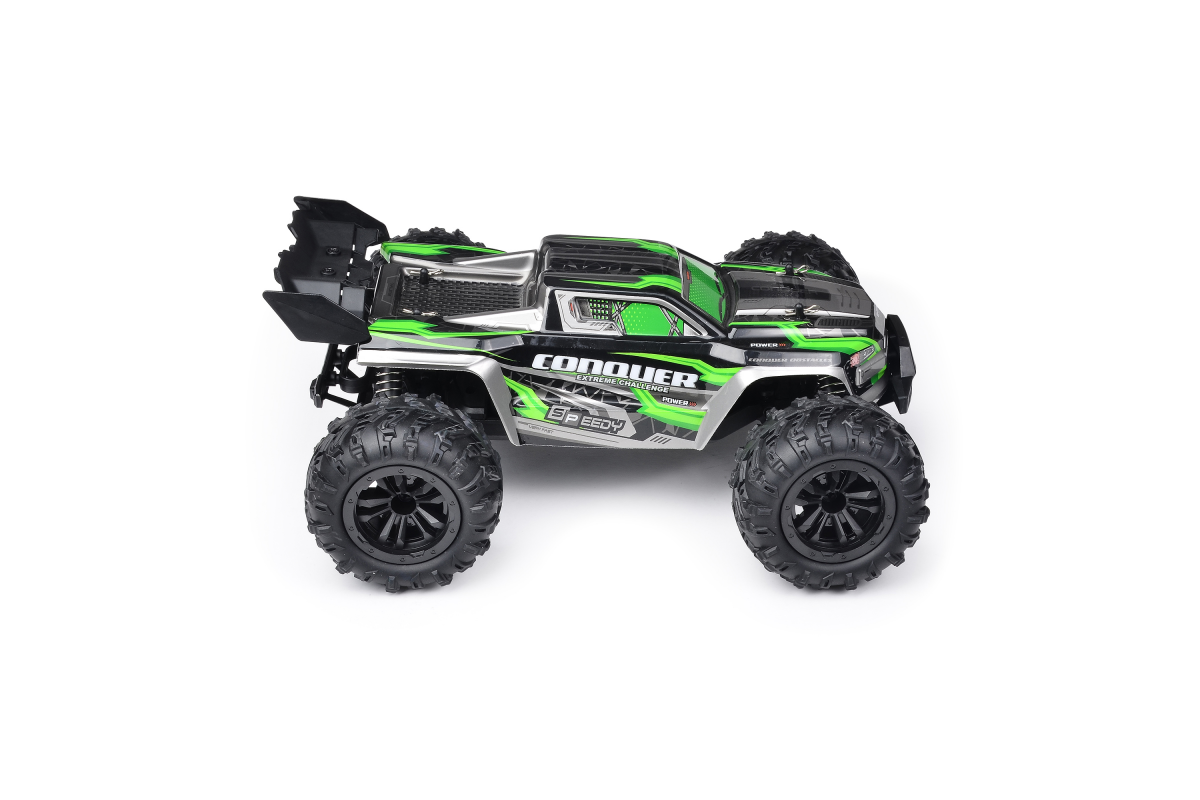 Полный привод повышает проходимость и управляемость модели. На автомодель Conquer установлен коллекторный двигатель 390 класса и влагозащищенный приемник с системой защиты от брызг. Мощный аккумулятор Li-Ion 7.4V 1300 mah, идущий в комплекте, позволяет непрерывно играть до 20 минут! Пульт управления на частоте 2.4Ghz позволит управлять моделью на расстоянии до 80 метров. LED подсветка переднего бампера сделаем игру в темное время суток незабываемой.