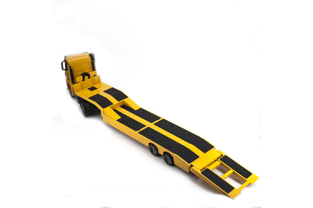 Корпус модели полностью повторяет оригинальную машину: яркий жёлтый кузов и большие колёса. Кузов выполняет свою реальную функцию — платформа для заезда автомобилей опускается и поднимается. А ещё машинка издаёт реалистичные звуки работающего двигателя. Длина модели составляет 36 см.