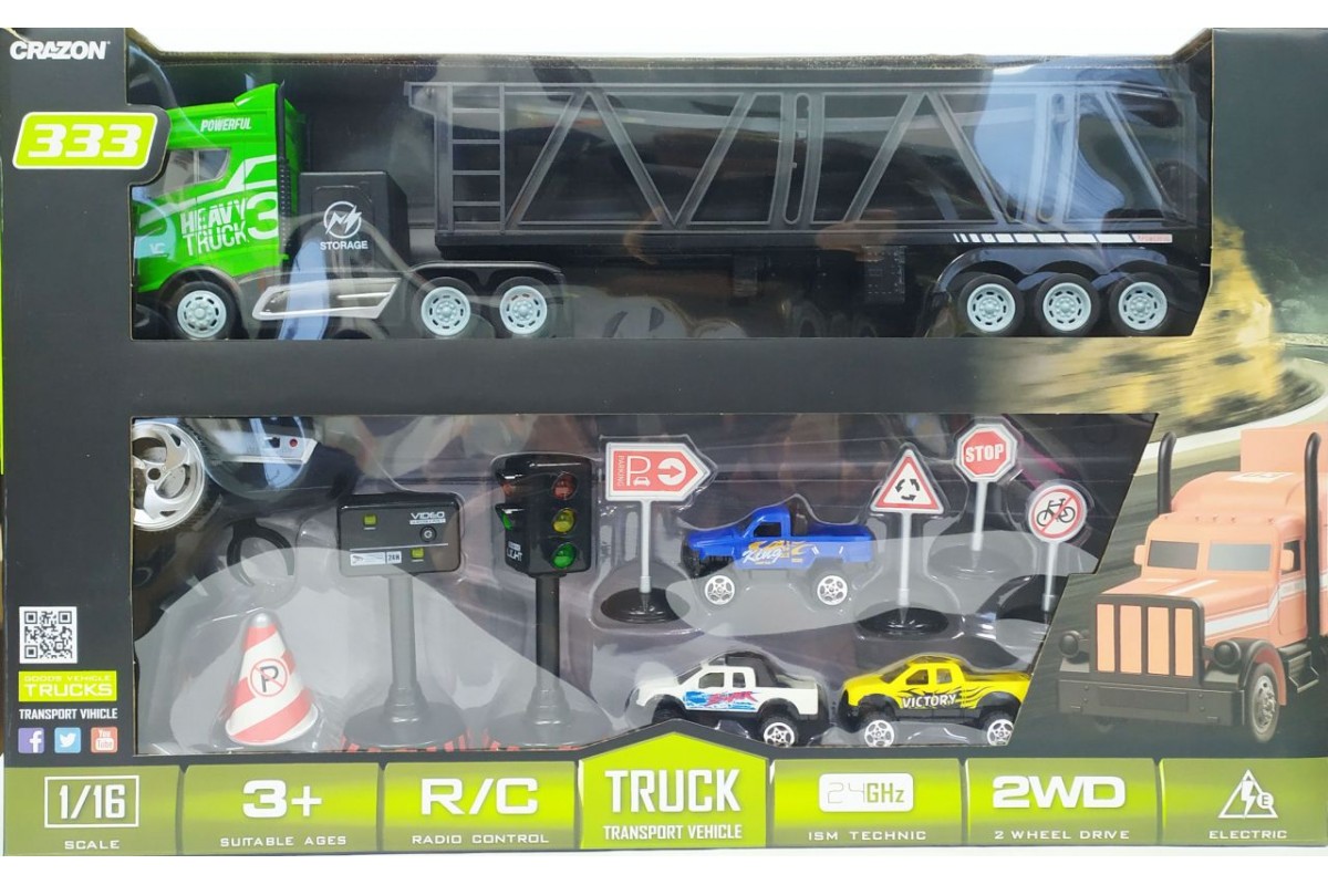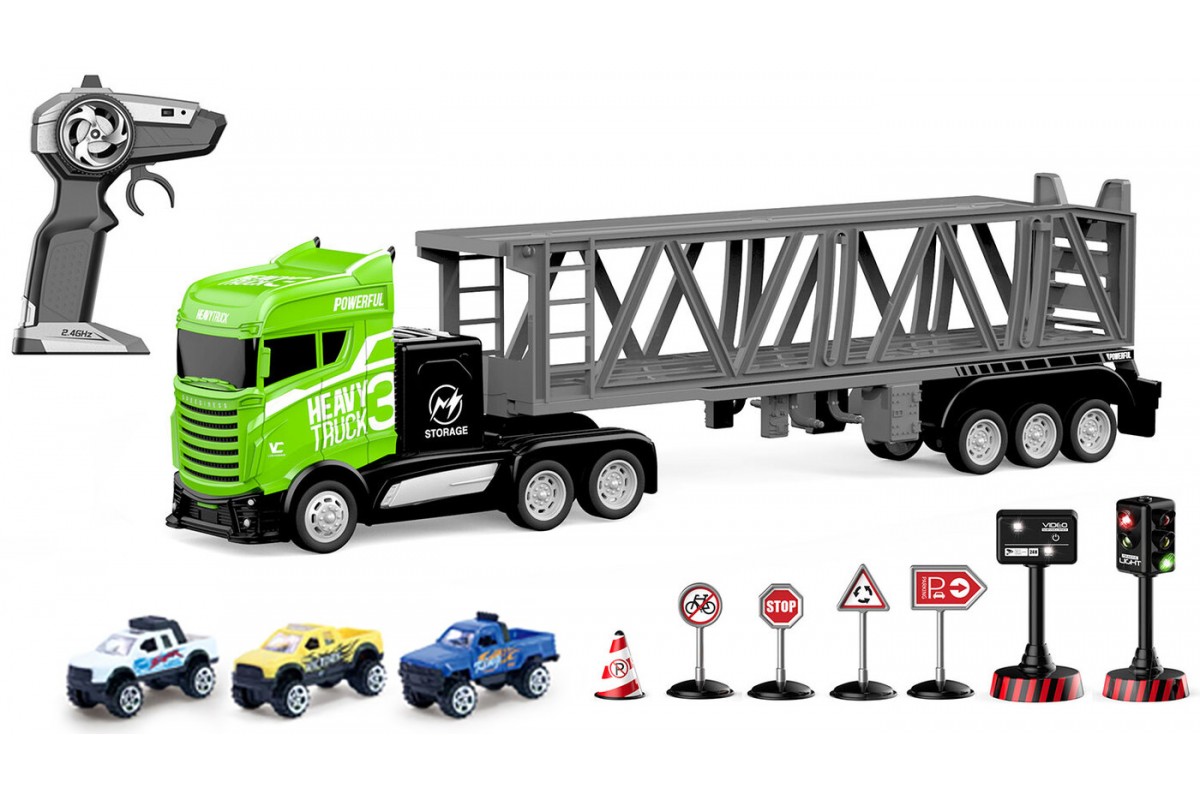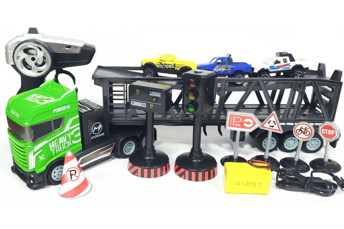 Радиоуправляемый автовоз с машинками и набор дорожных знаков (2WD, акб, 1:16) - GM1919C - это отличный подарок для вашего ребенка, который с легкостью придумает огромное количество увлекательных сюжетов для своих игр. Представленная машина выполнена в масштабе 1:16. Современная модель состоит из специального прицепа (автотрейлер) и тягача.