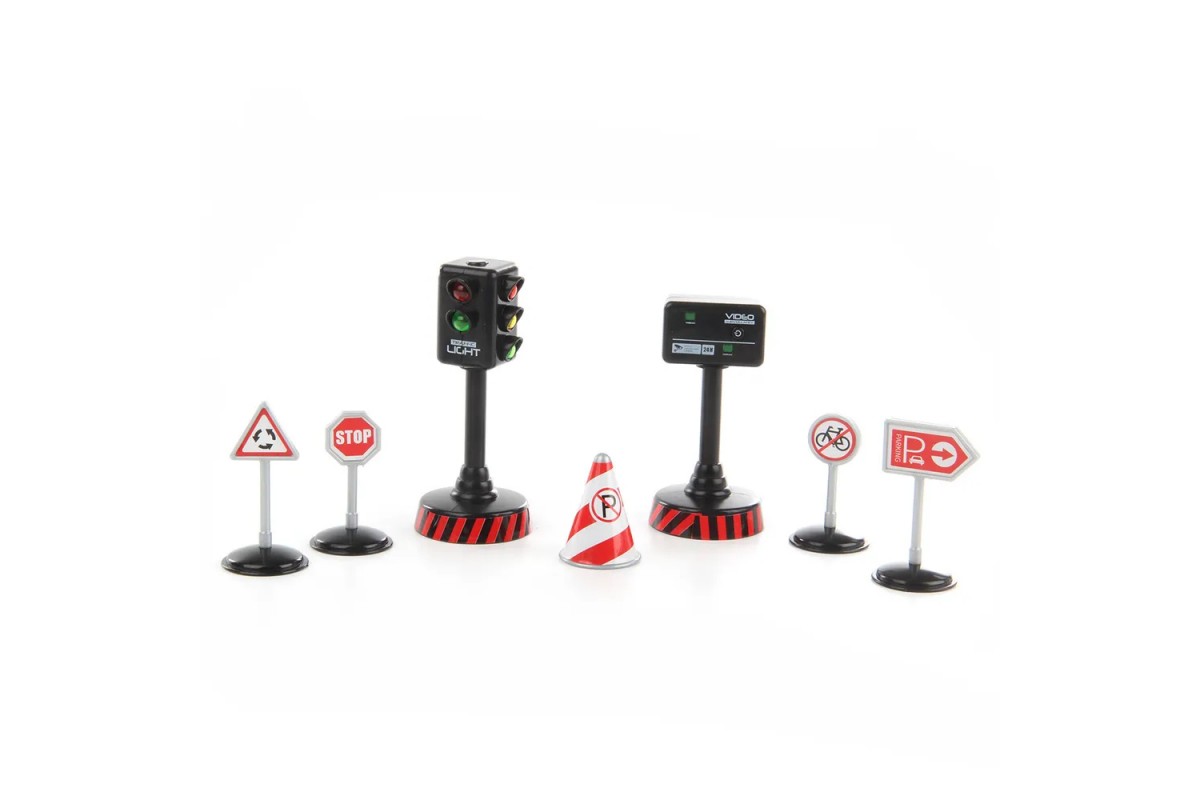 Машина, пульт управления, 5 дорожных знаков, светофор, камера, 3 машинки, USB зарядное устройство, батарея аккум., упаковка