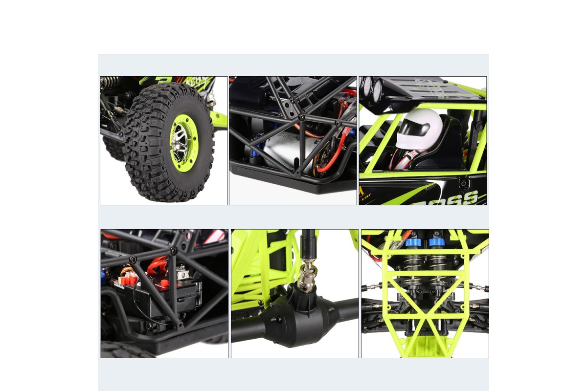 Длинноходная многорычажная подвеска радиоуправляемого внедорожника сделана практически такая же, как на настоящих багги для гонок в пустыне. Мощные маслонаполненные пружинные амортизаторы спереди расположены продольно, а сзади вертикально. Реактивные тяги надежно удерживают задний мост. Прочные чашки и полуоси, кузов с прочным каркасом и фигуркой водителя в шлеме, все как у серьезных гоночных машин. Любые ответственные узлы и детали этой модели можно не только заменить, но и регулировать. Вы можете изменить жесткость работы подвески, дорожный просвет и другие настройки.