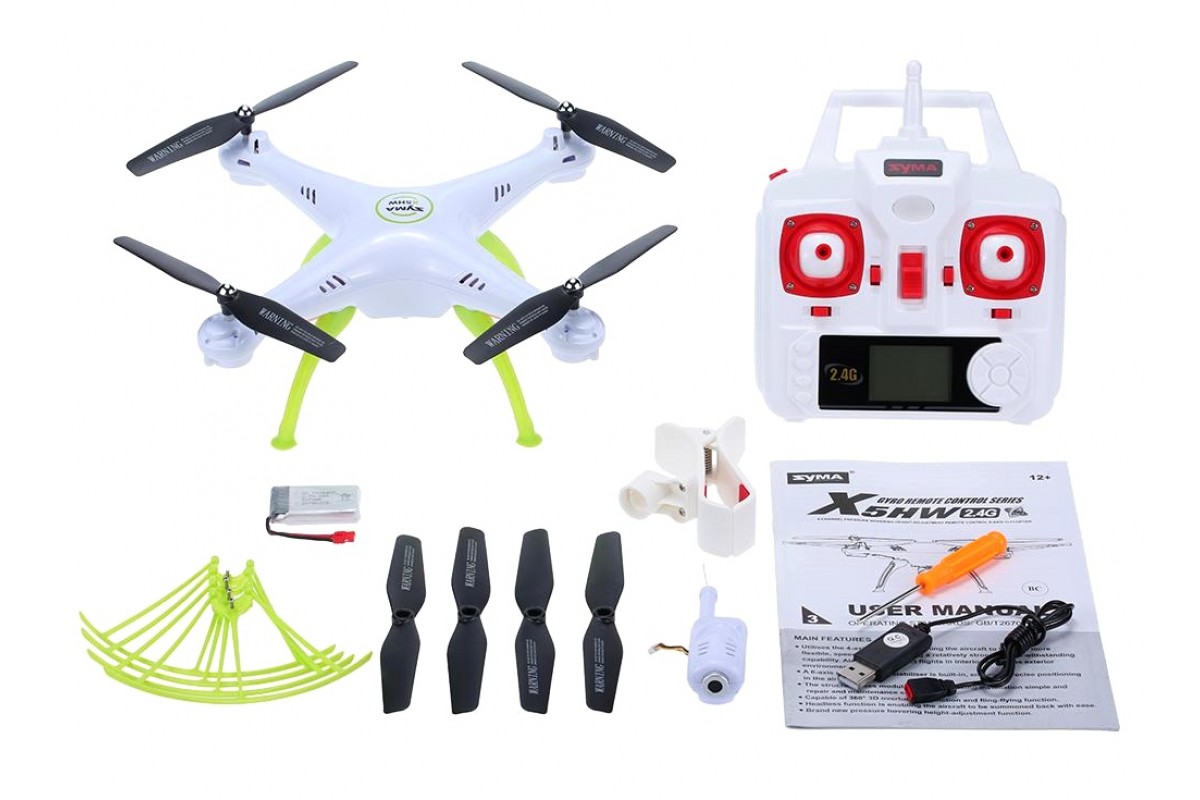 Радиоуправляемый белый квадрокоптер Syma X5HW с барометром Wi-Fi FPV - X5HW - это квадрокоптер от известной китайской компании Syma с барометрическим датчиком "H". Он необходим для удержания нужной высоты при зависании в воздухе, что добавляет квадрокоптеру плавности движения и значительно улучшает качество фото- и видеосьемки. Наслаждайтесь видами с высоты птичьего полёта на своём смартфоне или планшете в режиме реального времени! Сохраняя яркие моменты в HD качестве! Квадрокоптер получил headless режим и стильный глянцевый корпус. Для защиты от резкого приземления или падения квадрокоптер оснащен эластичными ножками, на пропеллеры также предусмотрена специальная защита, которую легко установить и закрепить.