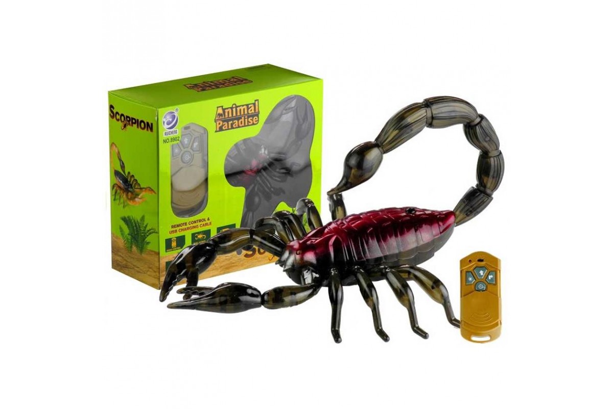 Радиоуправляемый черный скорпион RuiCheng - RUI-8902-BLACK - это игрушечный скорпион на радиоуправлении двигается вперёд, поворачивает вправо и может вращаться на 360 градусов! Команды задаются игрушке нажатием кнопок пульта управления с соответствующими стрелками. Во время игры у скорпиона светятся глазки. Предусмотрен демонстрационный режим.
