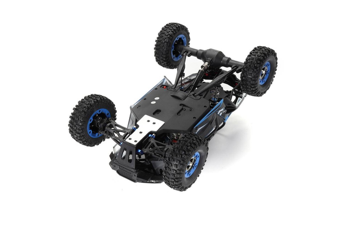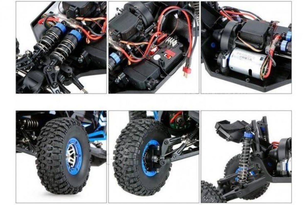 Структура подвески радиоуправляемого внедорожника сделана практически такая же, как на настоящих багги для гонок в пустыне. Мощные пружинные амортизаторы спереди расположены продольно, а сзади вертикально. Реактивные тяги, надежный задний мост, прочные чашки и полуоси, кузов с прочным каркасом, все как у серьезных гоночных машин. Любые ответственные узлы и детали этой модели можно не только заменить, но и регулировать. Вы можете изменить жесткость работы подвески, дорожный просвет и другие настройки.