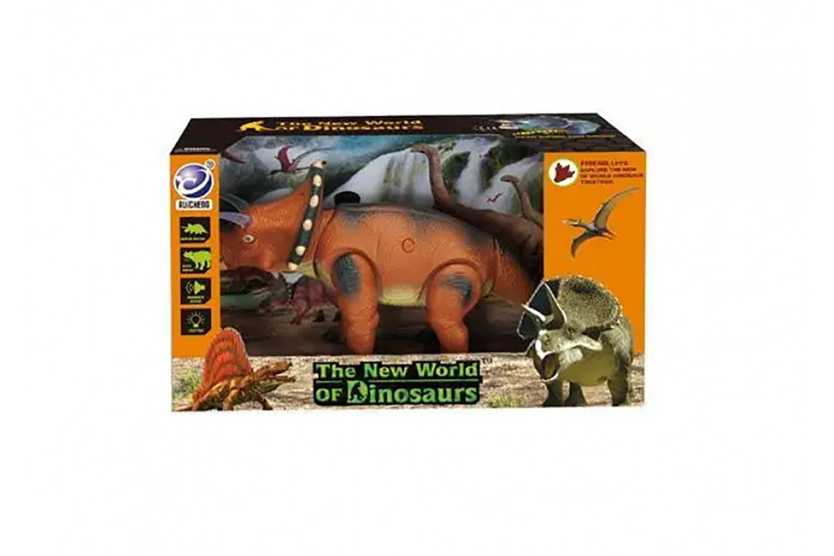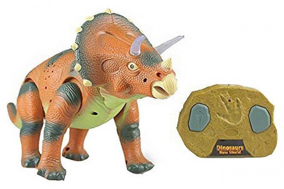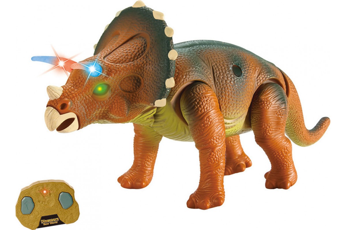 Радиоуправляемый динозавр - Трицератопс (39 см, коричневый, свет, звук) - 9982-BROWN - это игрушка "Динозавр-Трицератопс" на радиоуправлении представляет собой фигурку, которой можно управлять при помощи стильного пульта, напоминающим окаменелость со следом. Ребенок сможет заставить игрушечного динозавра ходить, опуская голову, махать хвостом и рычать. При этом глаза динозавра светятся. Перед автоматическим отключением, которое происходит через 60 секунд по завершении игры, динозавр издает крик.
