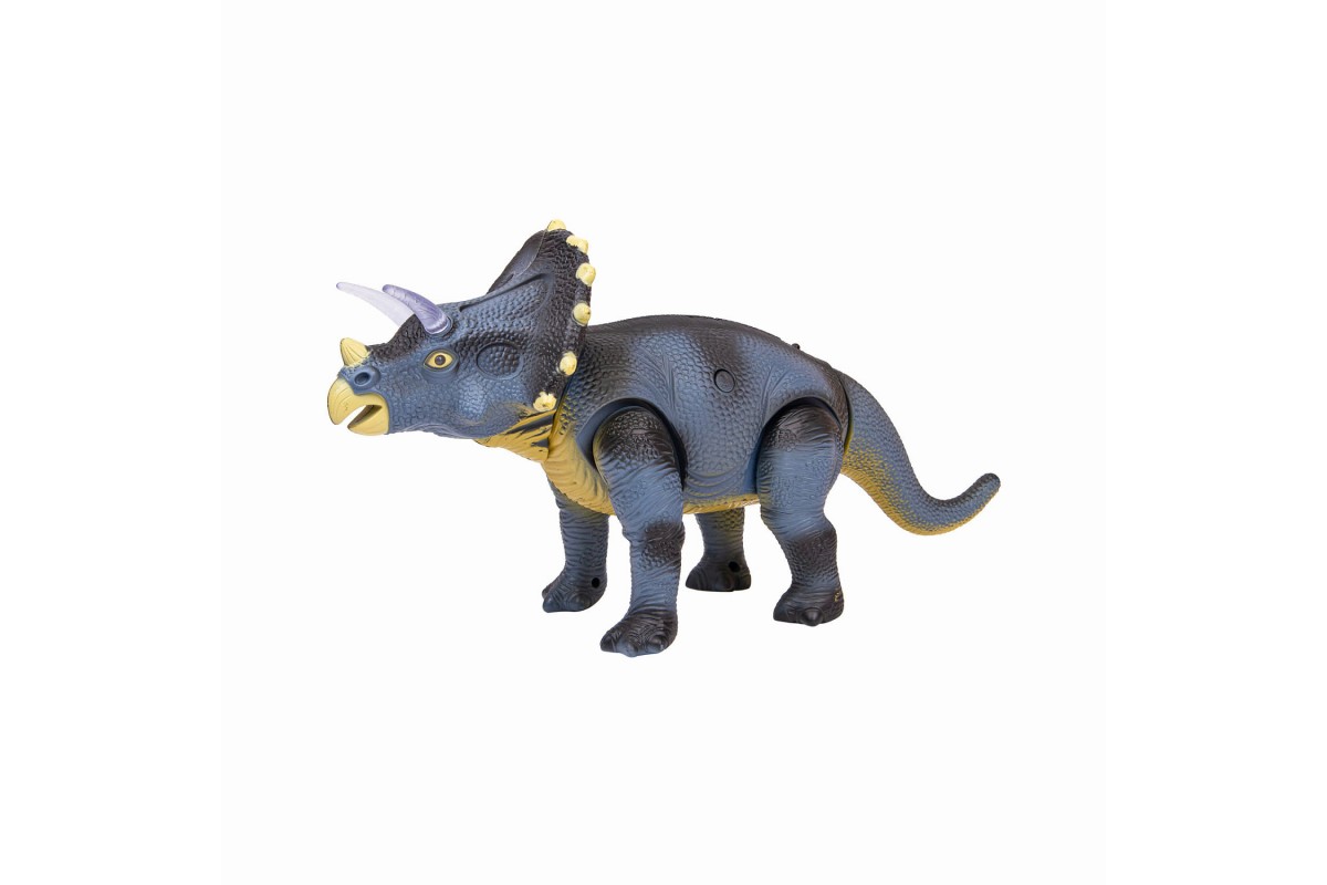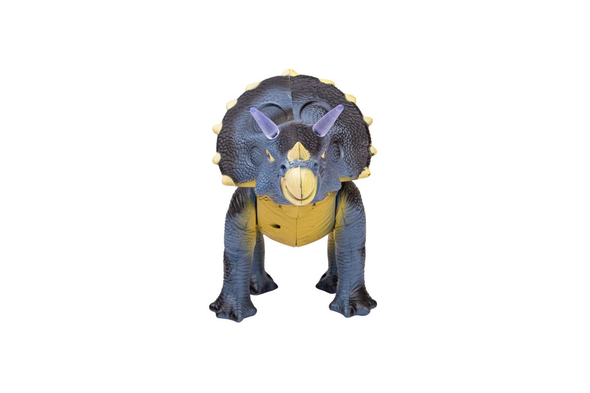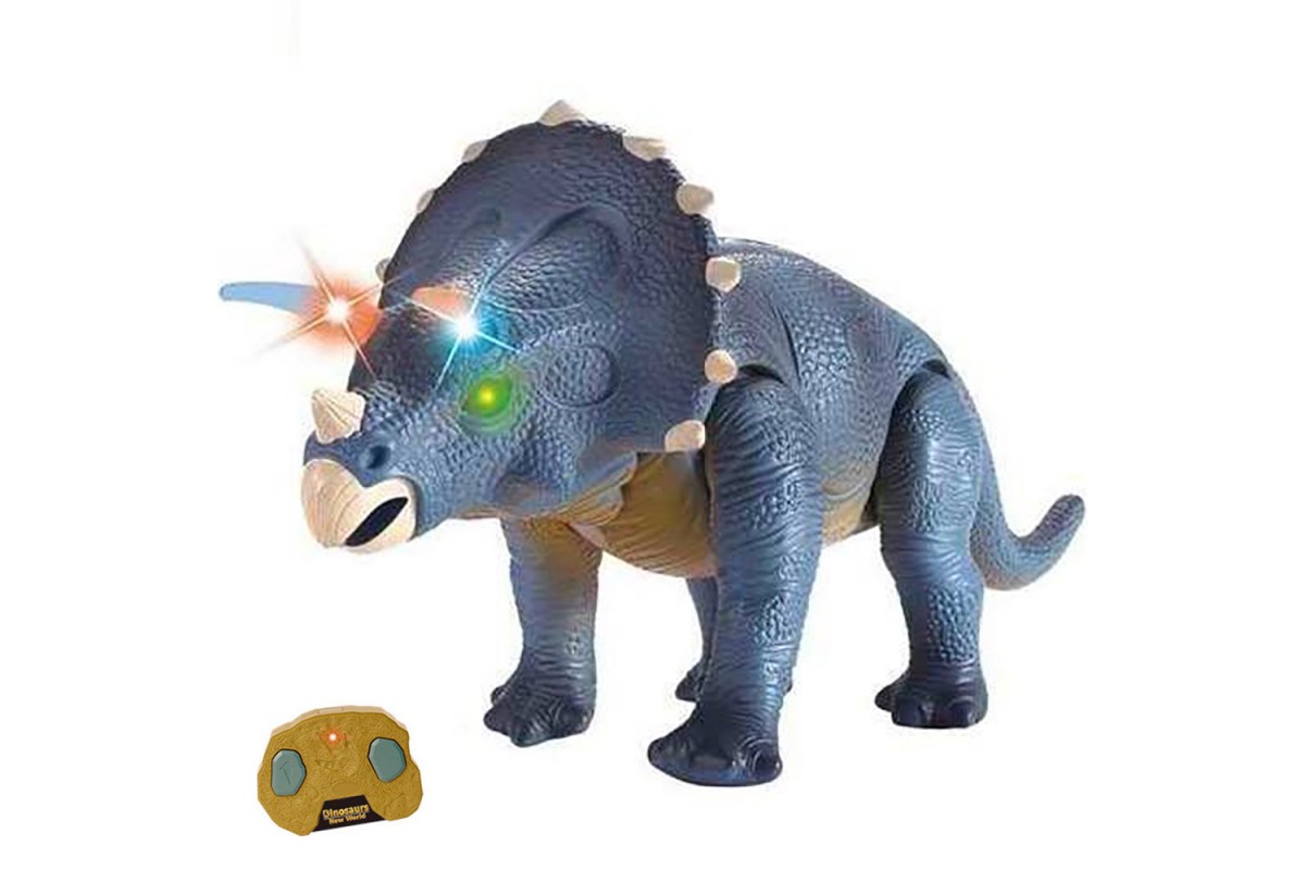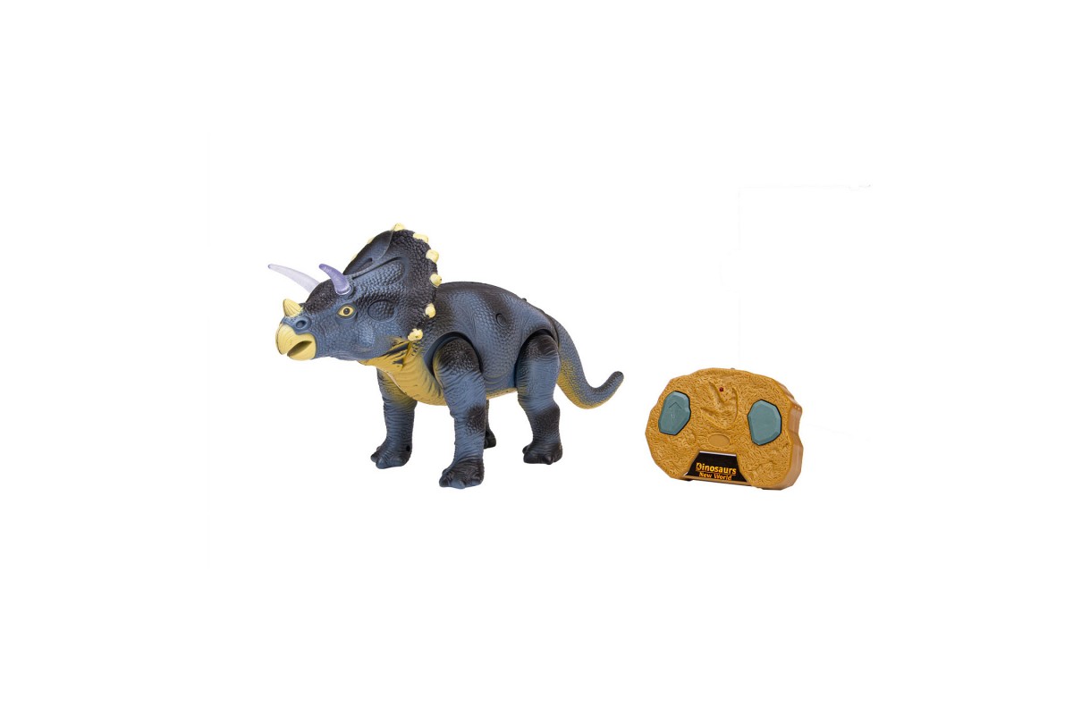 Радиоуправляемый динозавр - Трицератопс (39 см, серый, свет, звук) - 9982-GREY - это игрушка "Динозавр-Трицератопс" на радиоуправлении представляет собой фигурку, которой можно управлять при помощи стильного пульта, напоминающим окаменелость со следом. Ребенок сможет заставить игрушечного динозавра ходить, опуская голову, махать хвостом и рычать. При этом глаза динозавра светятся. Перед автоматическим отключением, которое происходит через 60 секунд по завершении игры, динозавр издает крик.