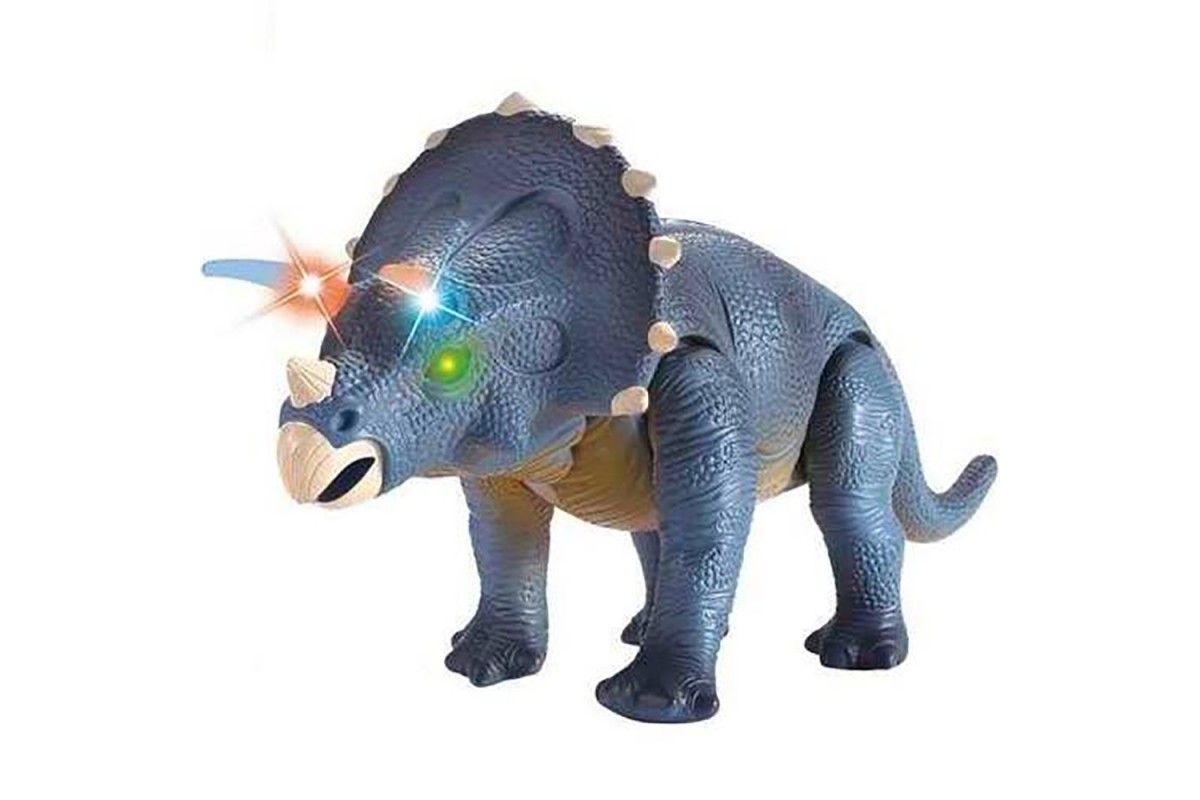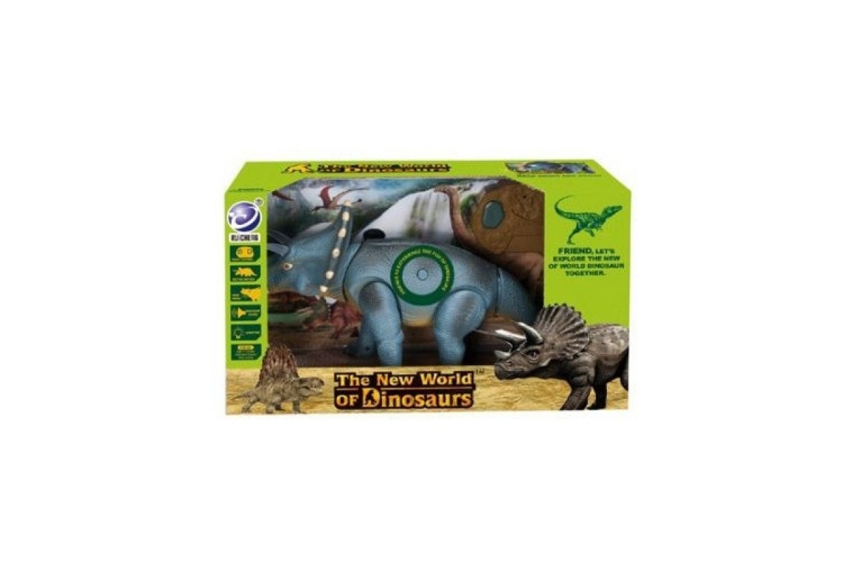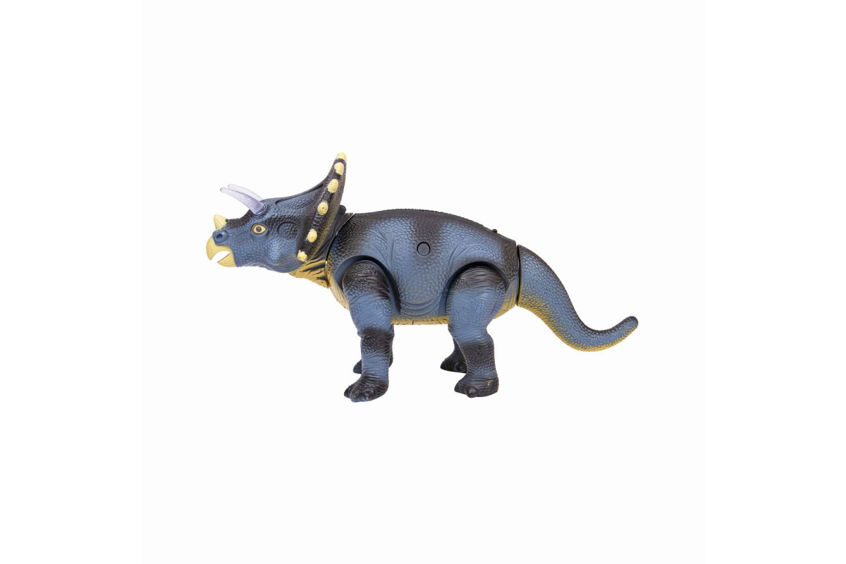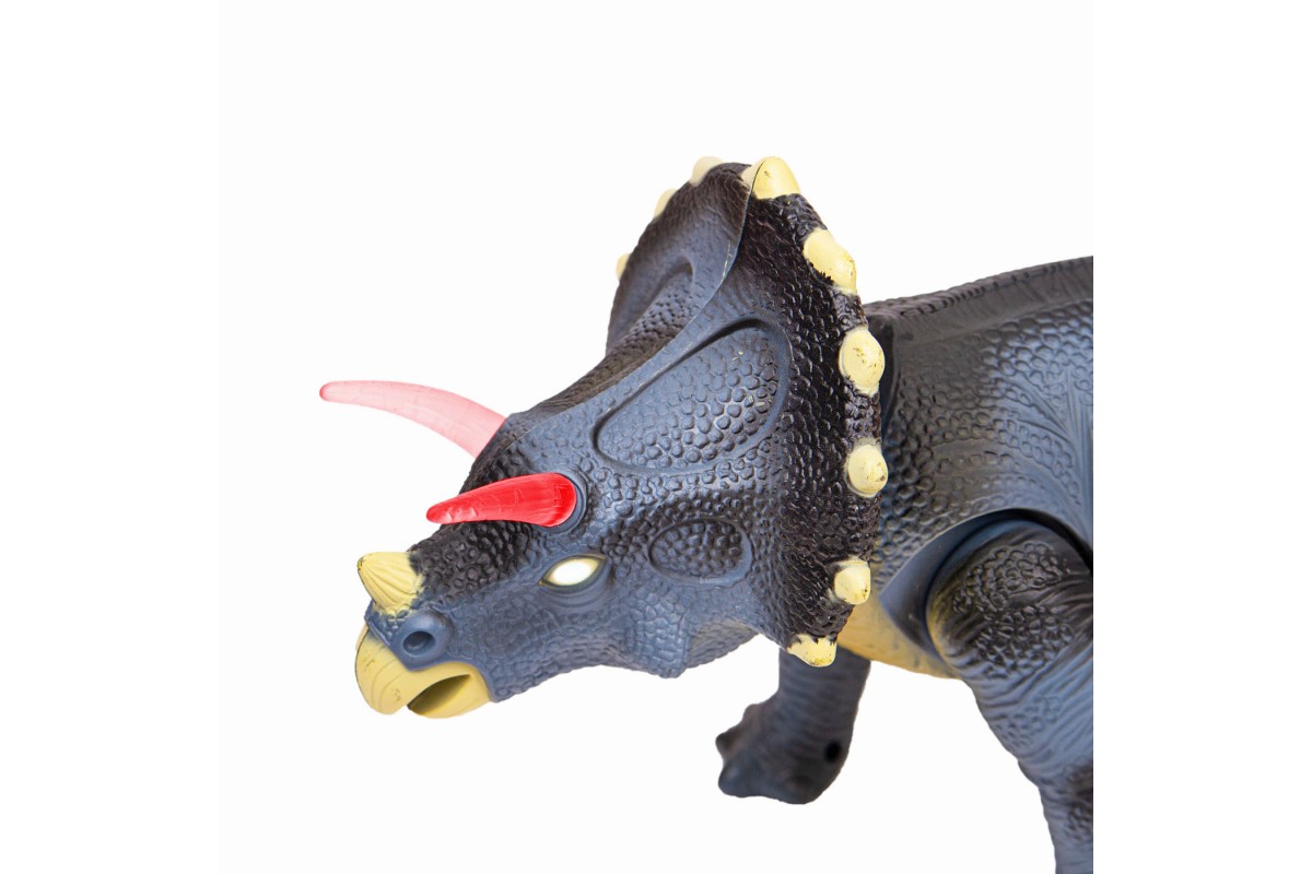 Радиоуправляемый динозавр - Трицератопс (39 см, серый, свет, звук) - 9982-GREY - это игрушка "Динозавр-Трицератопс" на радиоуправлении представляет собой фигурку, которой можно управлять при помощи стильного пульта, напоминающим окаменелость со следом. Ребенок сможет заставить игрушечного динозавра ходить, опуская голову, махать хвостом и рычать. При этом глаза динозавра светятся. Перед автоматическим отключением, которое происходит через 60 секунд по завершении игры, динозавр издает крик.
