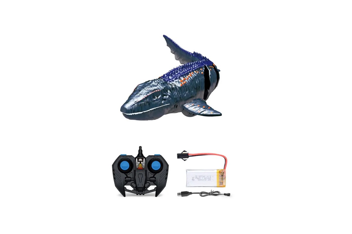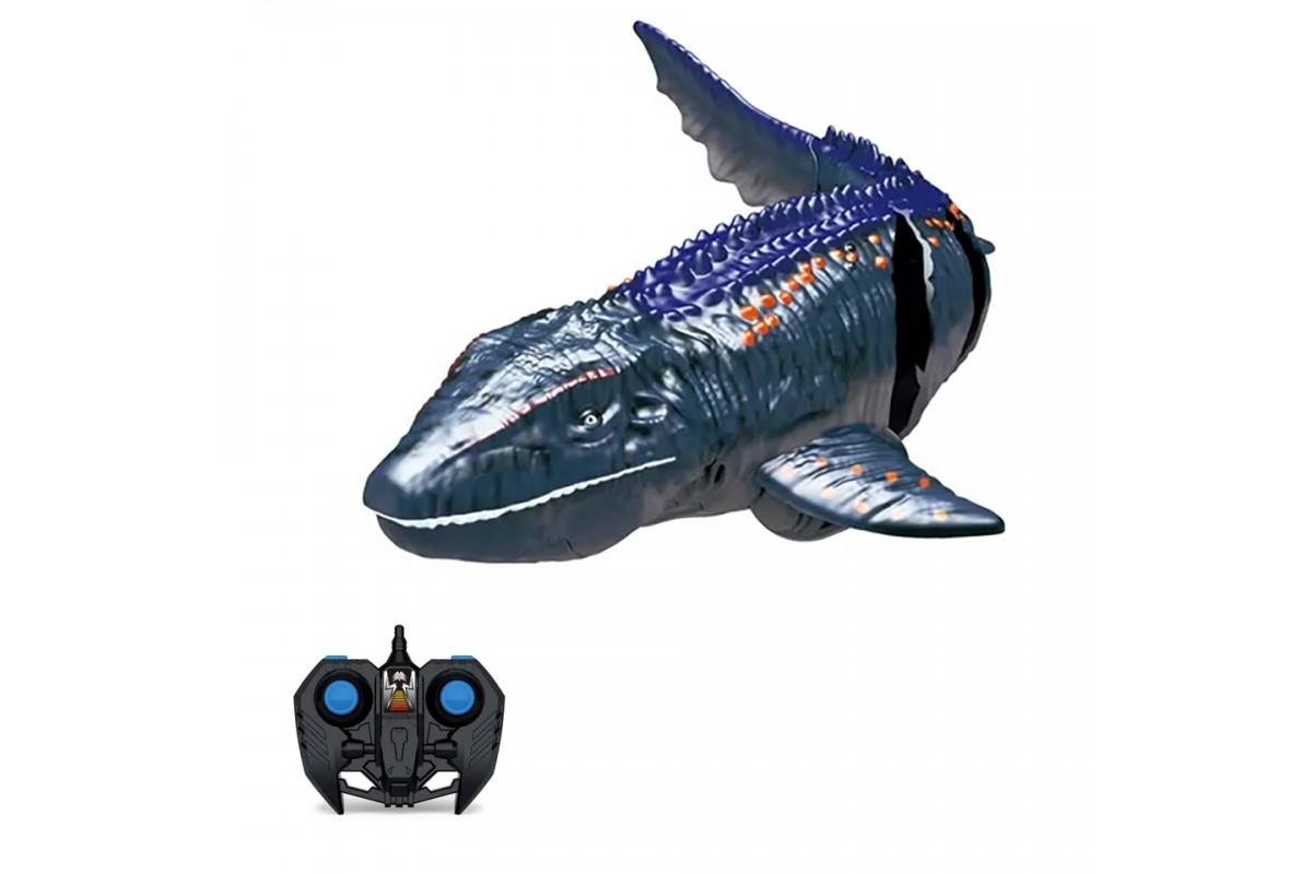 Радиоуправляемый динозавр Мозазавр (плавает в воде, синий, акб) - D03-BLUE - это реалистичная игрушка, которая действительно умеет плавать: делает развороты влево и вправо, движения вперед и назад, а также двигает туловищем и хвостовым плавником.