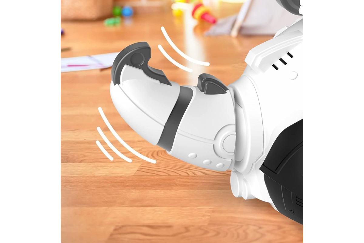 - кнопка функции подачи пара. Издает рев, лампочка во рту подсвечивается красным, выпускает пар изо рта, пар выходит через ноздри, открывает и закрывает пасть, виляет хвостиком, двигается в разных направлениях.