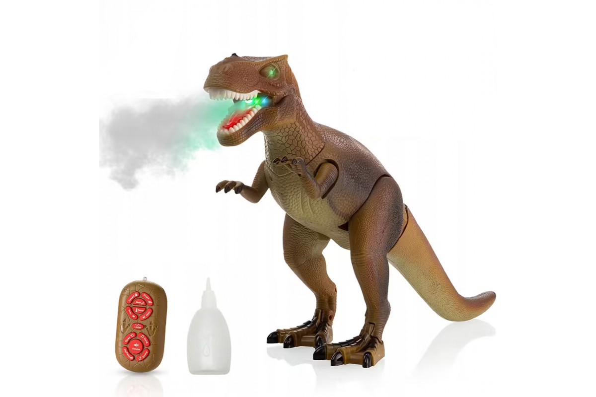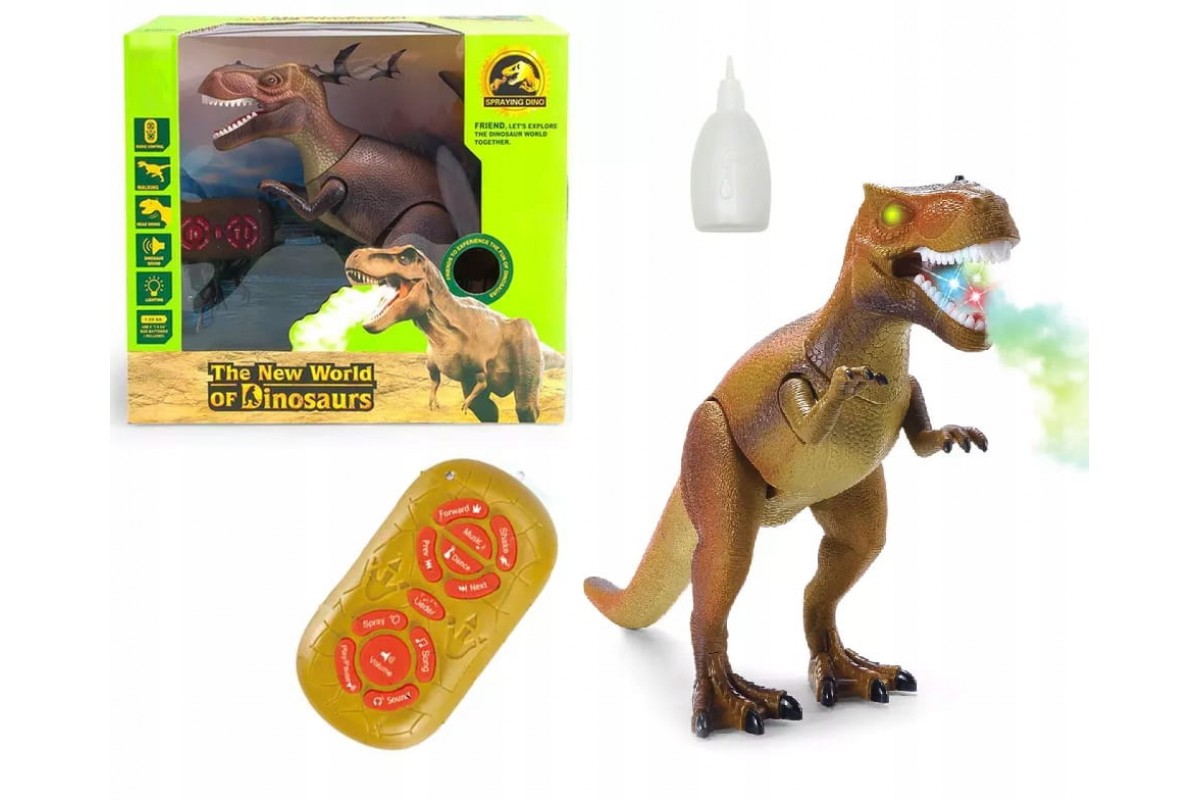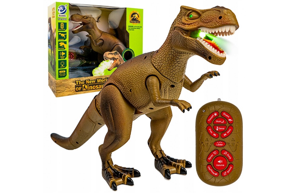 Радиоуправляемый динозавр T-Rex RuiCheng (коричневый, звук, пар, свет) - RUI-8909-BROWN - это робот тиранозавр с пультом управления, который умеет ходить, крутить головой, издавать звуки и имеет подсветку. Встроенный пульверизатор создает эффект дыма. Оригинальная игрушка, которая обязательно понравится малышу, увлеченному эпохой динозавров. Этот игрушечный зверь может передвигаться вперед и назад, исследовать окружающую его обстановку. Он также широко открывает пасть, грозно рычит, отпугивая врагов. Встроенный пульверизатор создает эффект дыма.
