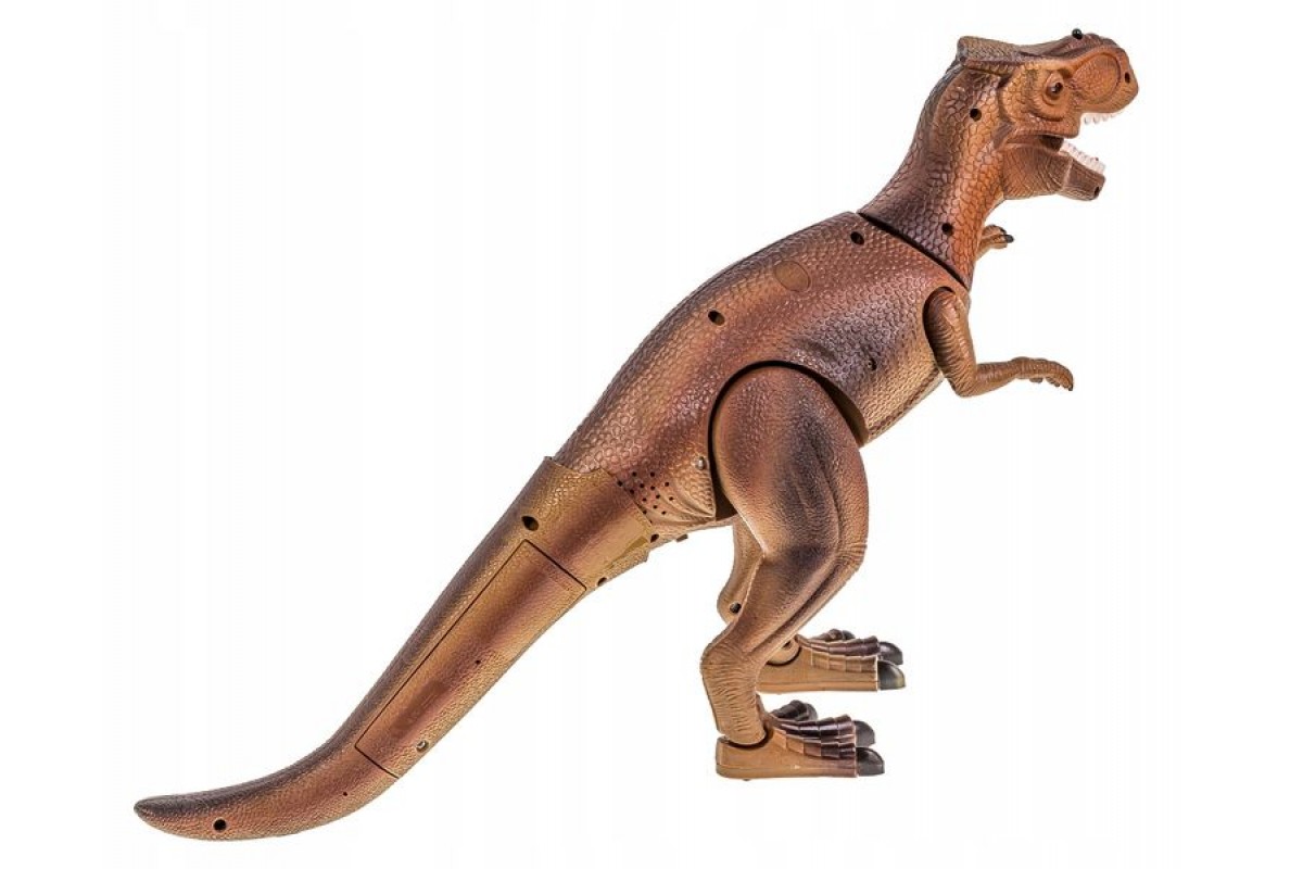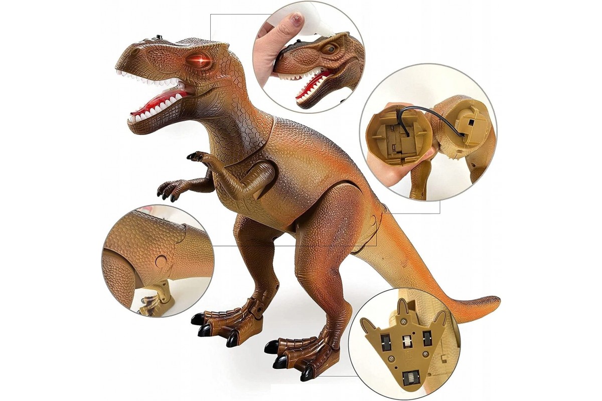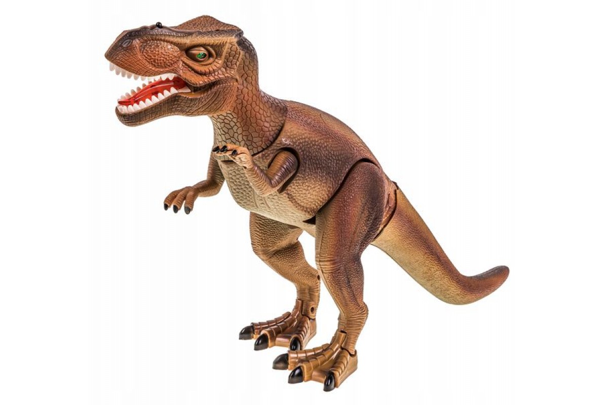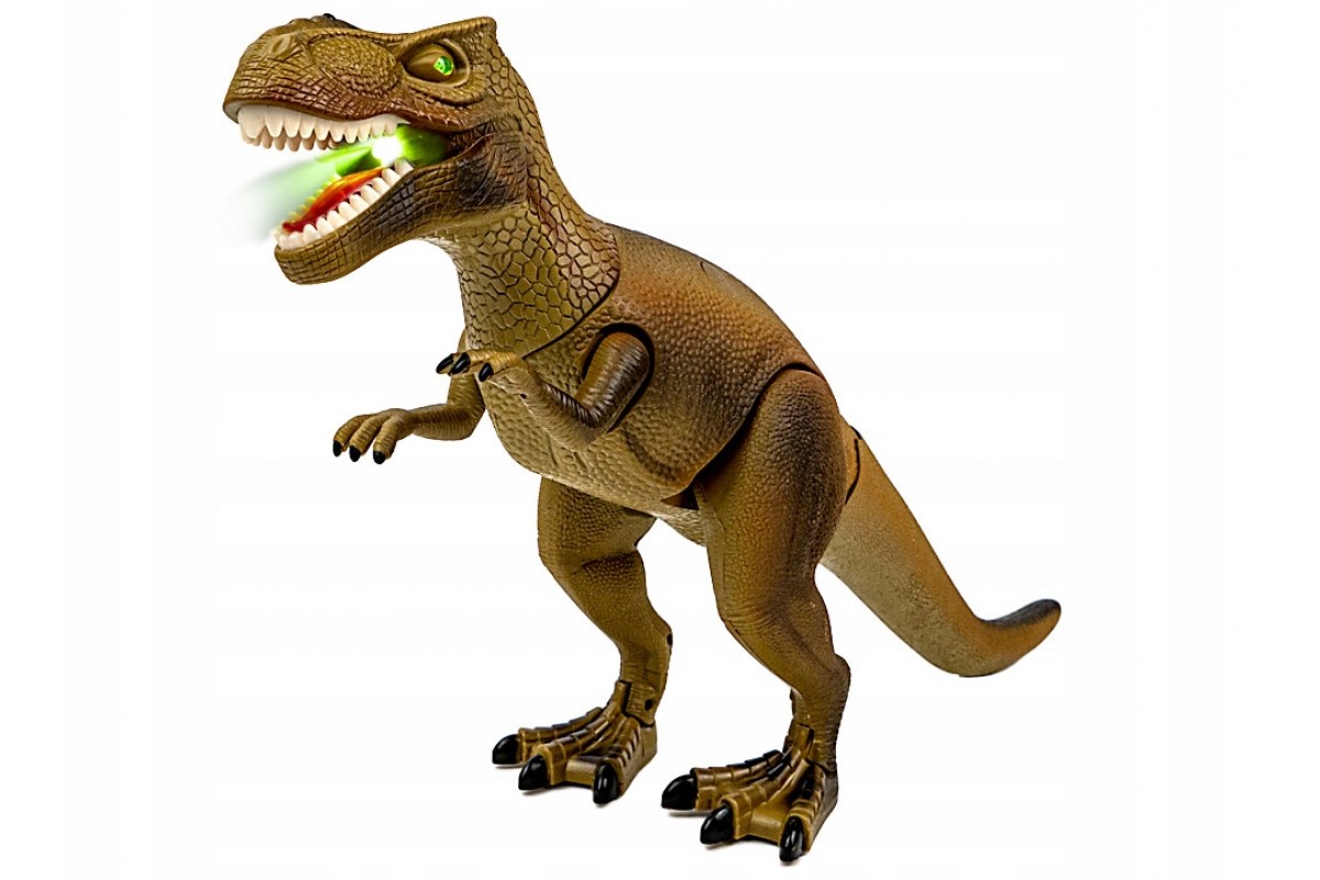 Радиоуправляемый динозавр T-Rex RuiCheng (коричневый, звук, пар, свет) - RUI-8909-BROWN - это робот тиранозавр с пультом управления, который умеет ходить, крутить головой, издавать звуки и имеет подсветку. Встроенный пульверизатор создает эффект дыма. Оригинальная игрушка, которая обязательно понравится малышу, увлеченному эпохой динозавров. Этот игрушечный зверь может передвигаться вперед и назад, исследовать окружающую его обстановку. Он также широко открывает пасть, грозно рычит, отпугивая врагов. Встроенный пульверизатор создает эффект дыма.
