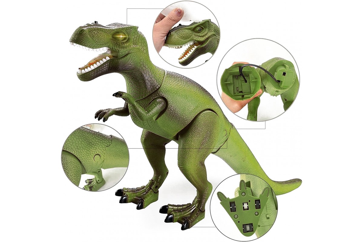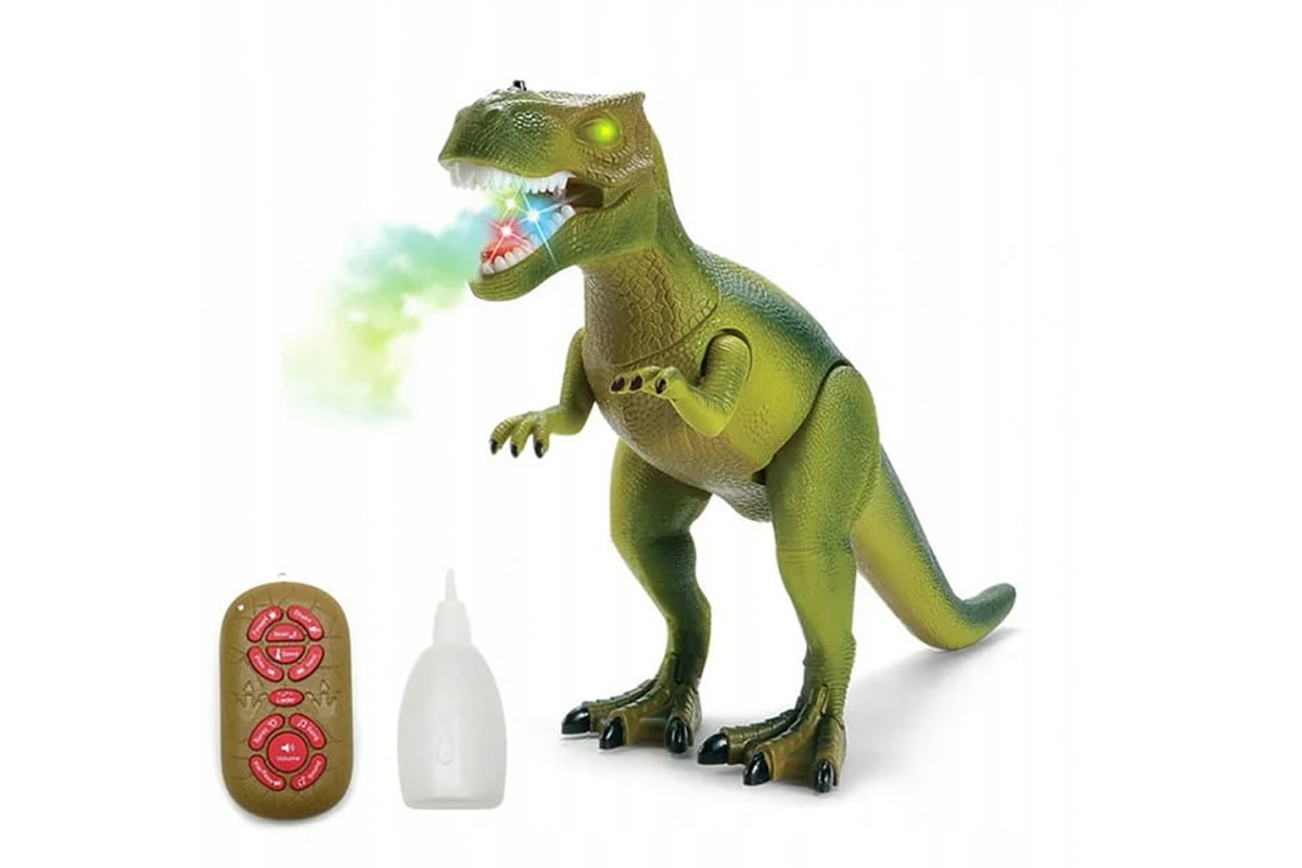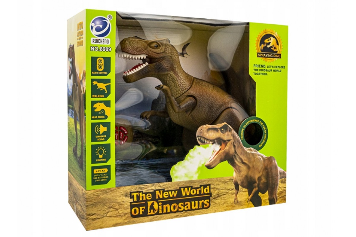Радиоуправляемый динозавр T-Rex RuiCheng (зеленый, звук, пар, свет) - RUI-8909-GREEN - это робот тиранозавр с пультом управления, который умеет ходить, крутить головой, издавать звуки и имеет подсветку. Встроенный пульверизатор создает эффект дыма. Оригинальная игрушка, которая обязательно понравится малышу, увлеченному эпохой динозавров. Этот игрушечный зверь может передвигаться вперед и назад, исследовать окружающую его обстановку. Он также широко открывает пасть, грозно рычит, отпугивая врагов. Встроенный пульверизатор создает эффект дыма.