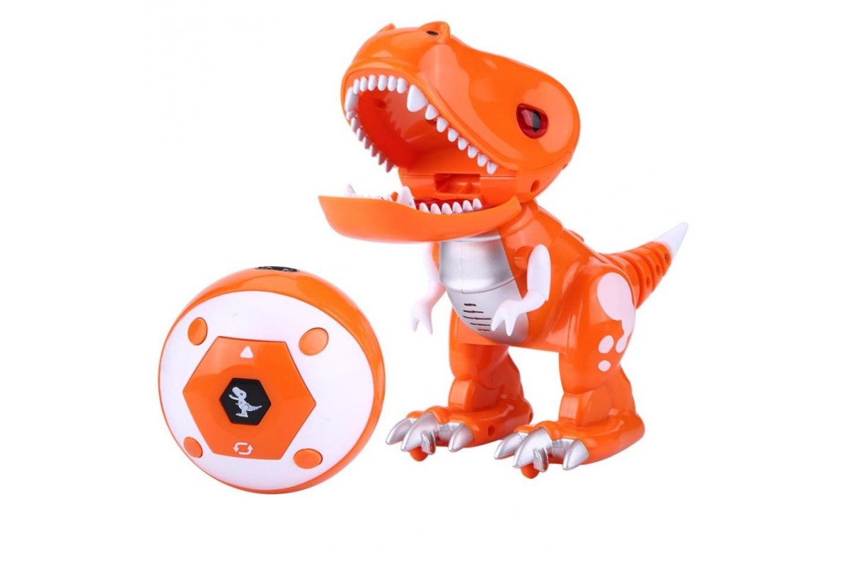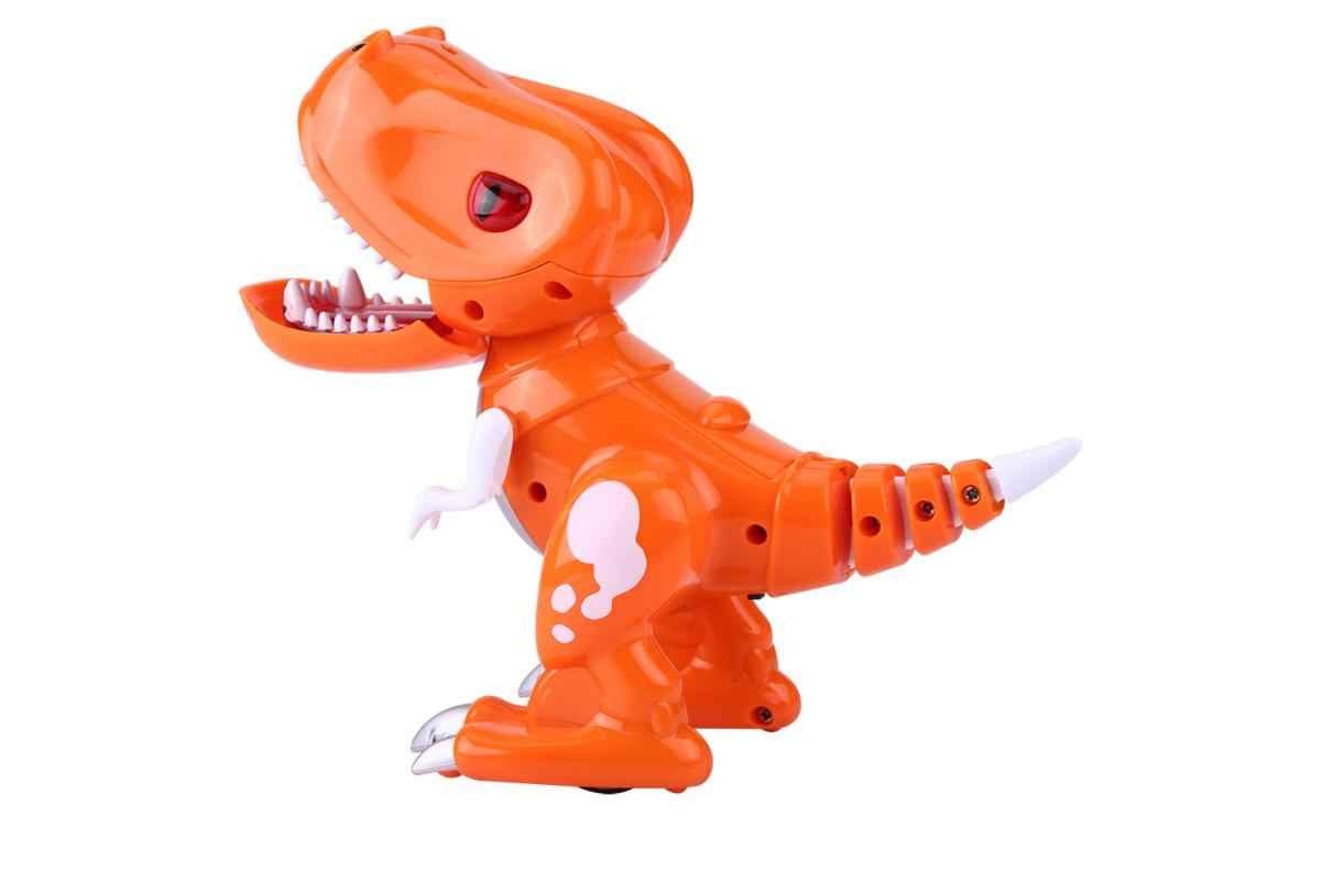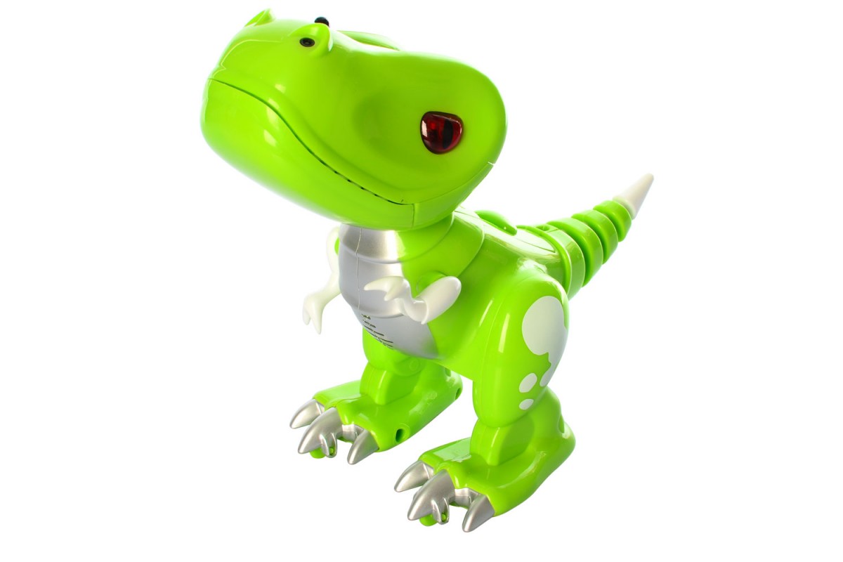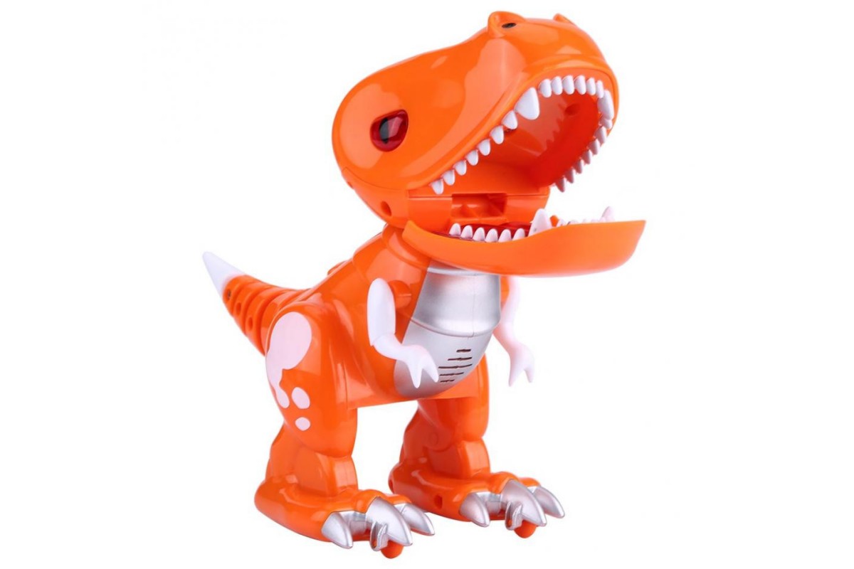 У динозаврика подвижные челюсти и конечности, глаза и рот оснащены светодиодными огнями. И он умеет издавать звуки, чтобы игра с ним стала интереснее.