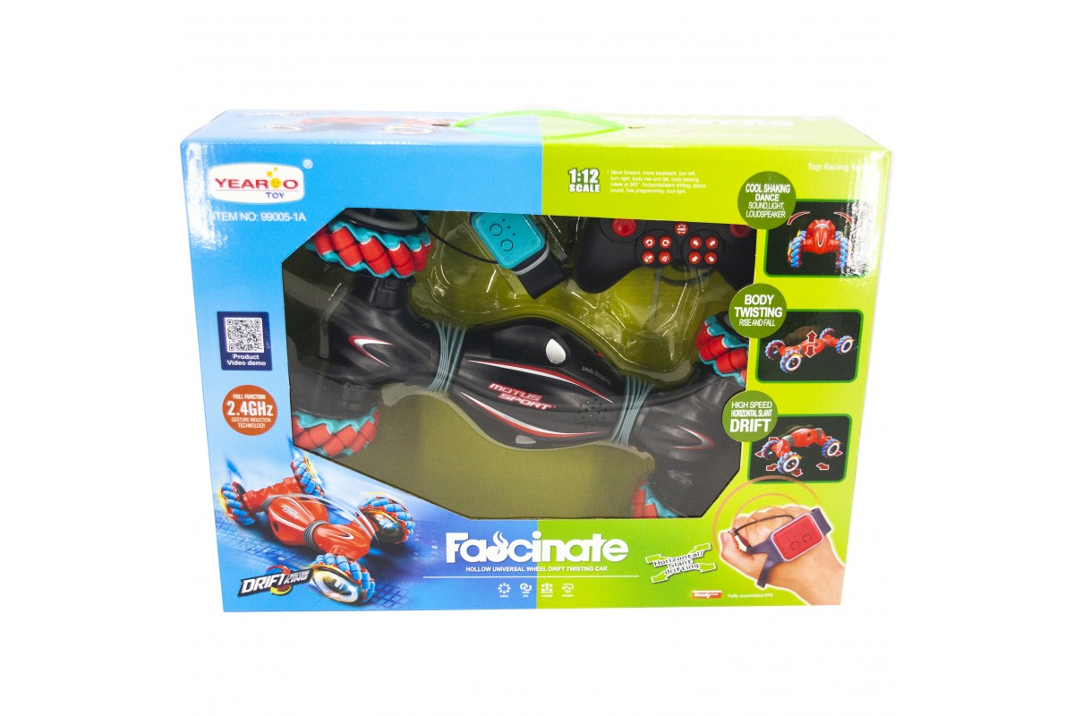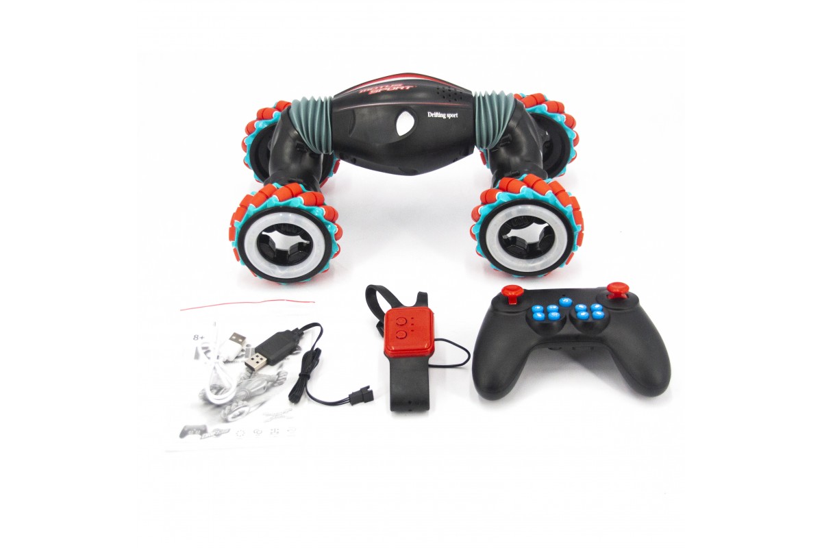 Радиоуправляемый дрифт Твистер Yearoo (часы + пульт) 1:14 - 99005-1A-BLACK - это машинка перевертыш Drift King, которая является несомненным хитом продаж среди радиоуправляемых моделей. Обновленная версия стала еще лучше. О такой машинке мечтает каждый мальчик. Возможности машинки Drift King просто невероятны. Она может ездить, крутиться на месте, переворачиваться и ехать дальше, приподниматься и даже танцевать. Но главная особенность заключается в управлении и уникальных колесах с яркой светодиодной подсветкой. Данной машинкой можно управлять жестами при помощи специального браслета, который входит в комплект с машинкой Drift King. Увлекательный процесс управления понравится не только детям, но и взрослым. И все это будет сопровождаться звуками работающего мотора, яркой подсветкой колес и песнями. Особенно эффектно машинка смотрится в темноте.