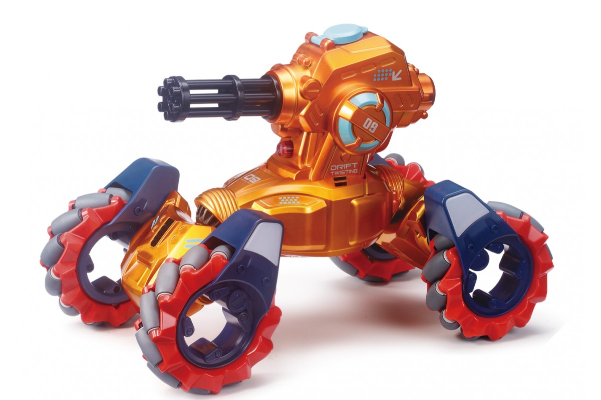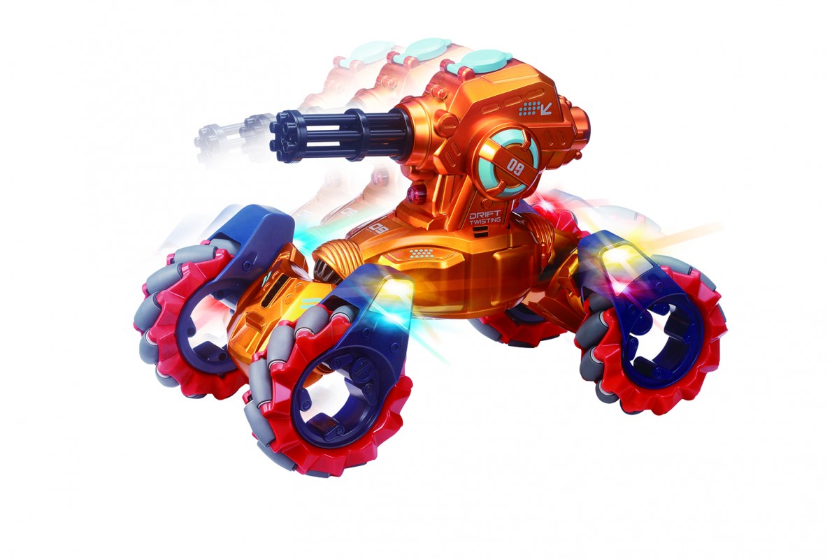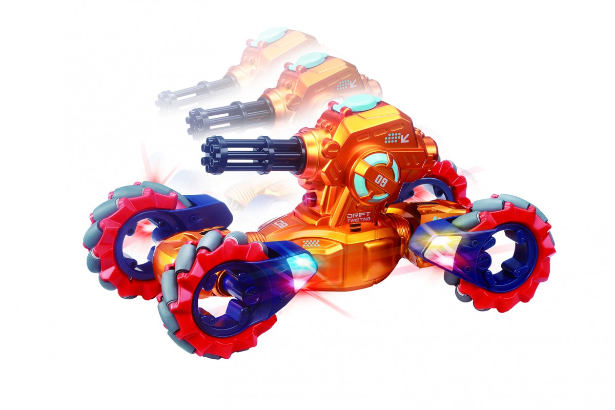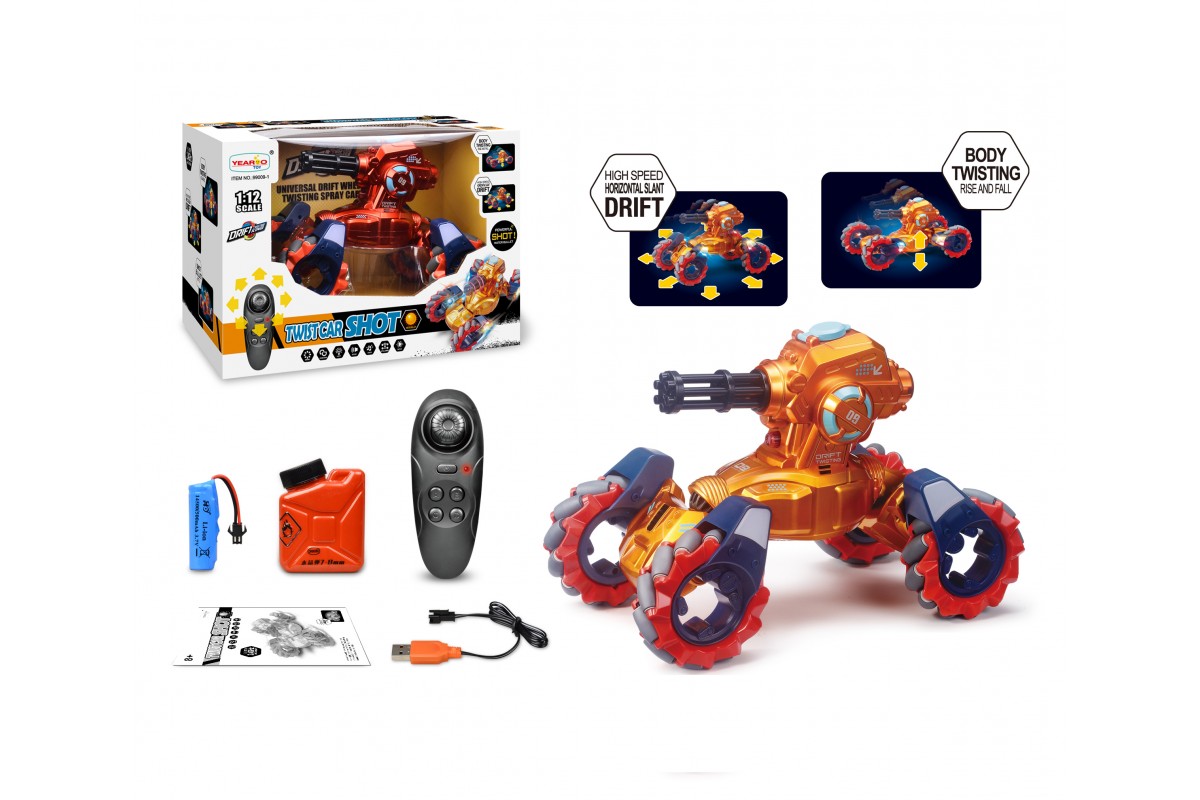 Радиоуправляемый дрифт Твистер Yearoo (стреляет пульками) 1:12 - 99009-1-GOLD - это машинка перевертыш дрифт Твистер, которая является несомненным хитом продаж среди радиоуправляемых моделей. Обновленная версия стала еще лучше. О такой машинке мечтает каждый мальчик. Возможности машинки просто невероятны. Она может ездить, крутиться на месте, и даже стрелять! Но главная особенность заключается в управлении и уникальных колесах с яркой светодиодной подсветкой. Данной машинкой можно управлять при помощи специального пульта, который входит в комплект с машинкой. Увлекательный процесс управления понравится не только детям, но и взрослым. И все это будет сопровождаться звуками работающего мотора, яркой подсветкой колес, паром и песнями. Особенно эффектно машинка смотрится в темноте.