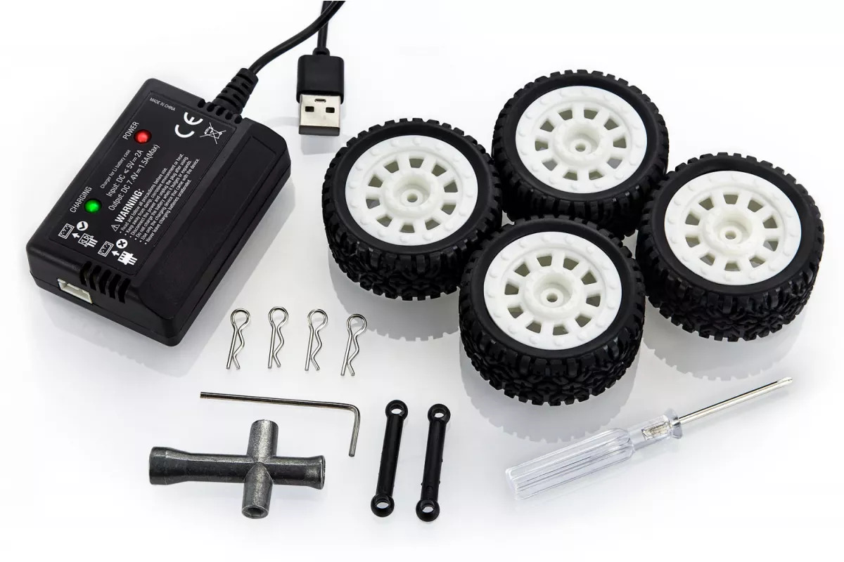 - Входит в комплект Машинка, пульт управления, аккумулятор 7,4 В 1200 мАч, зарядное устройство, 8 колес в комплекте ( 4 шосейные, 4 дрифтовые) отвертка, инструкция.