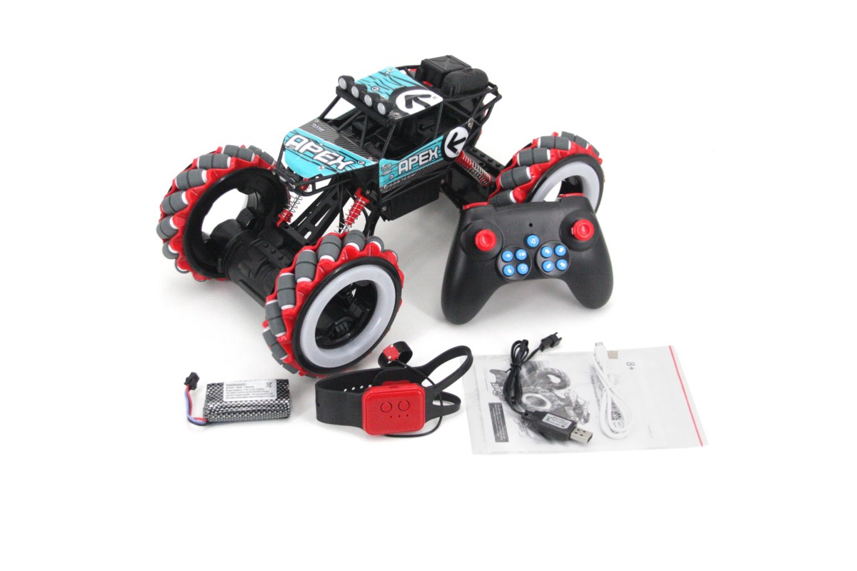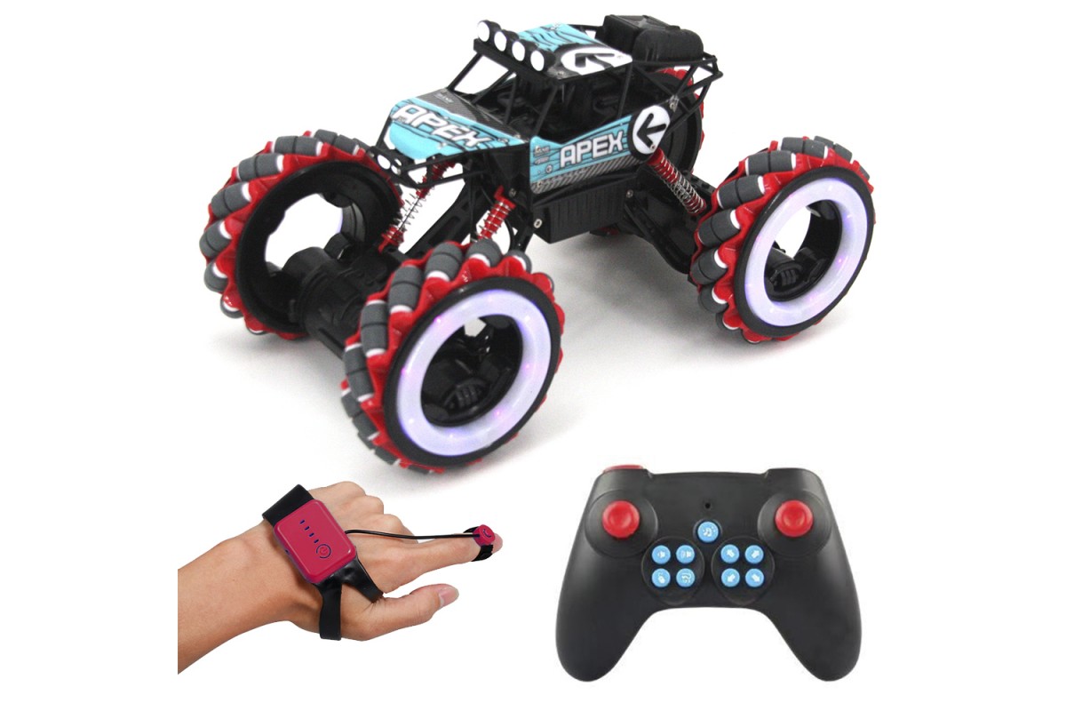 - Контроль жестами: в комплект входит дополнительный пульт, который фиксируются на ладони. Благодаря ему вы сможете управлять вездеходом лёгкими жестами одной руки. При этом вы сможете управлять не только направлением движения, но и изменять высоту подвески машины и делать трюки.