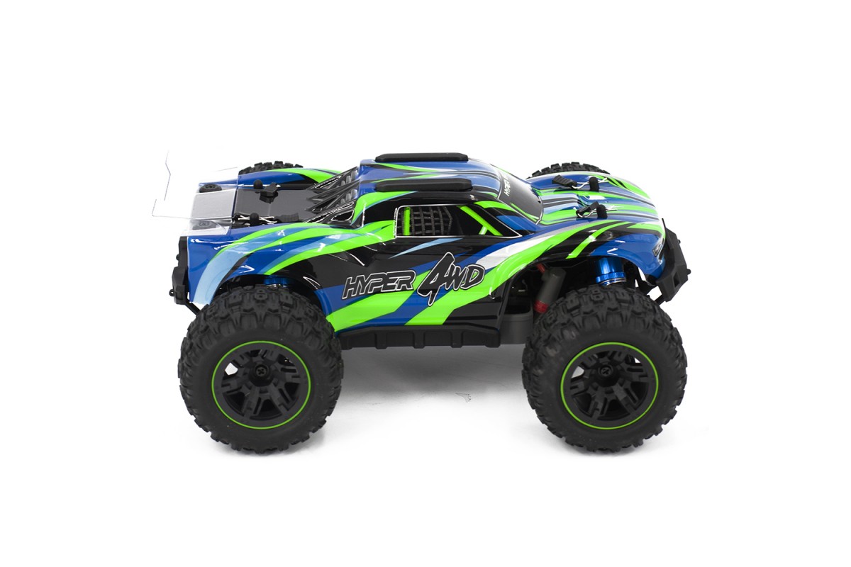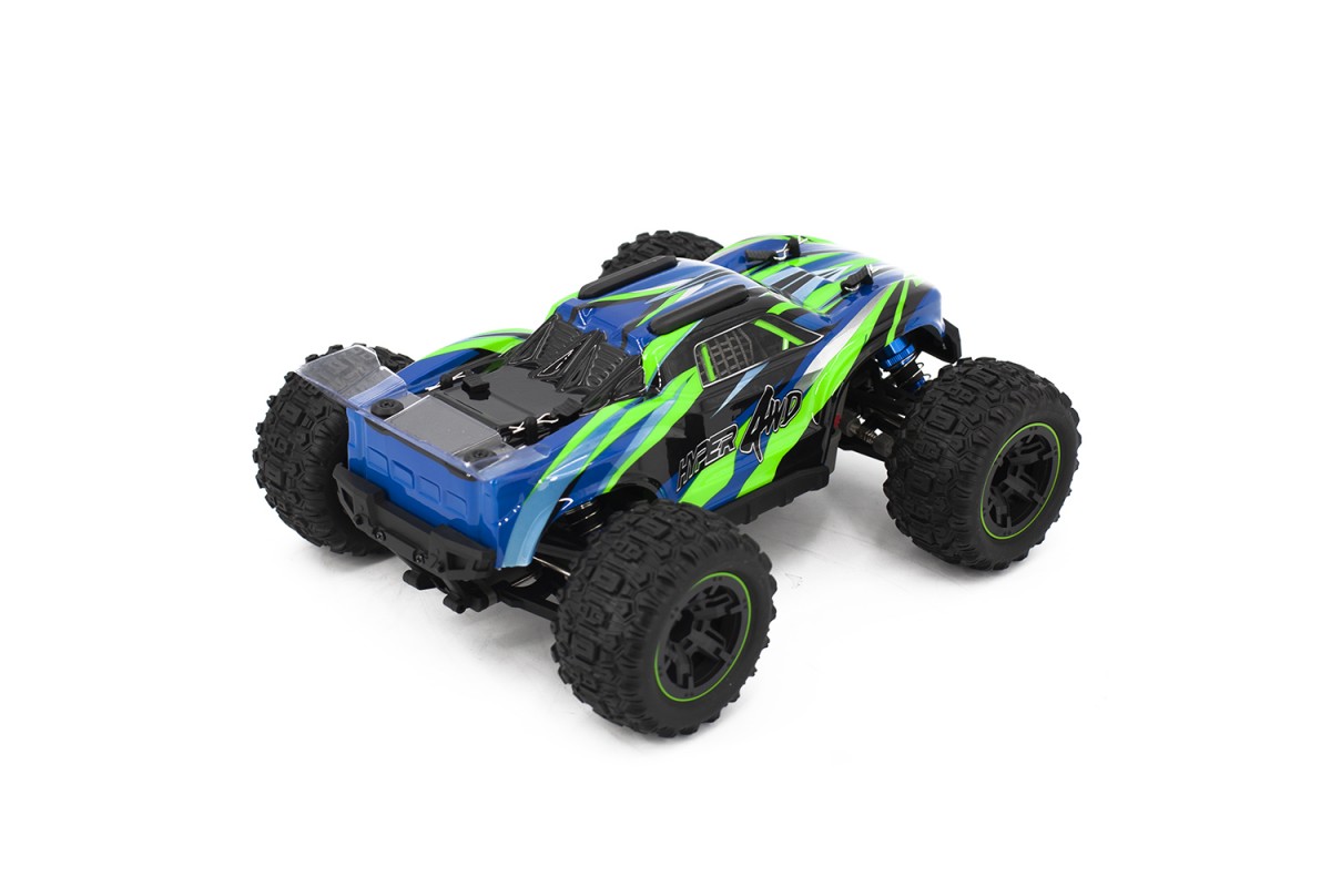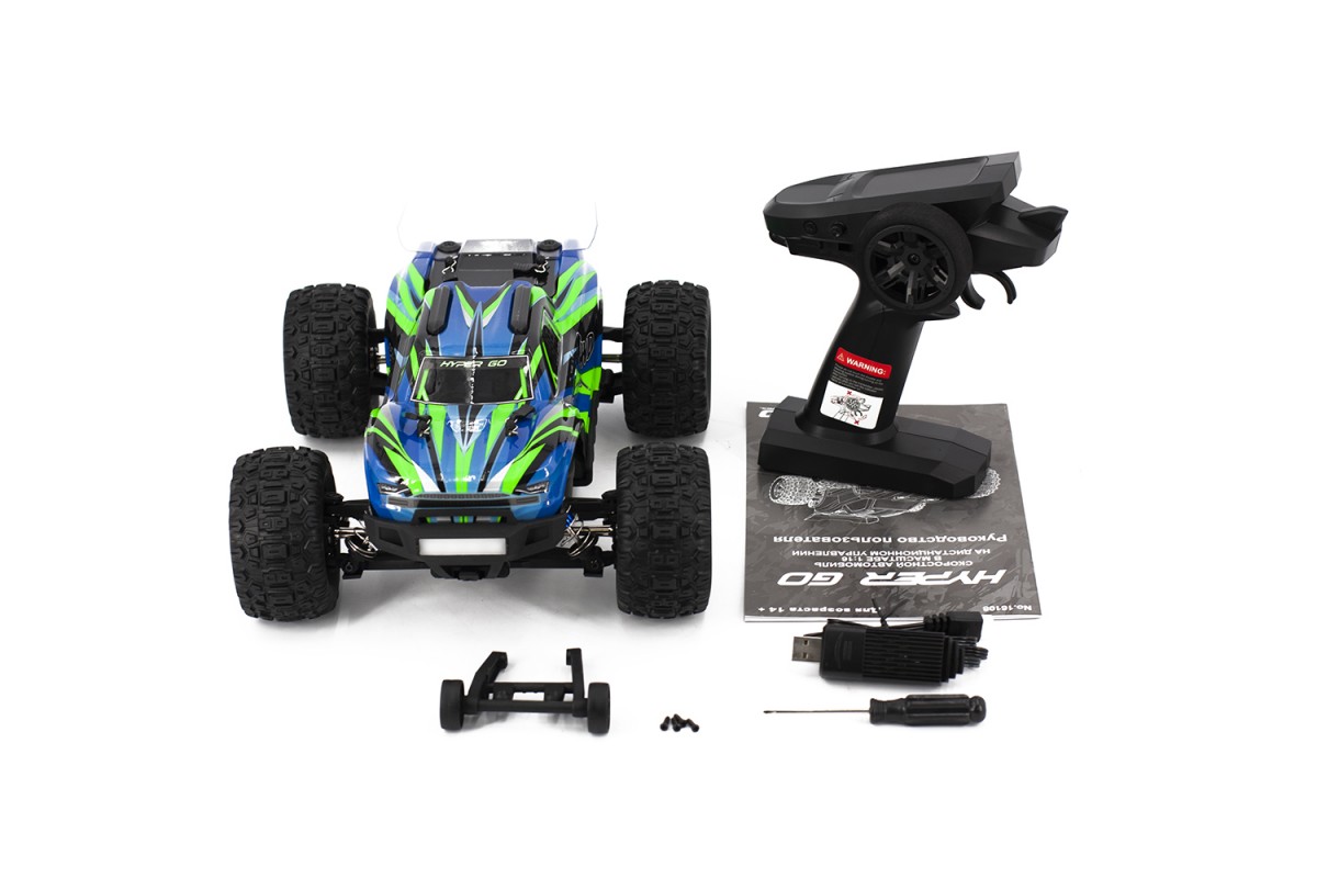 Полный привод повышает проходимость и управляемость модели. На Hyper Go установлен коллекторный двигатель 390 класса и влагозащищенный приемник 2 в 1. Мощный аккумулятор Li-Ion 7.4V 850 mah, идущий в комплекте, придает модели большую мощность! Пульт управления на частоте 2.4Ghz позволит управлять моделью на расстоянии до 45 метров. LED подсветка переднего бампера сделаем игру в темное время суток незабываемой.