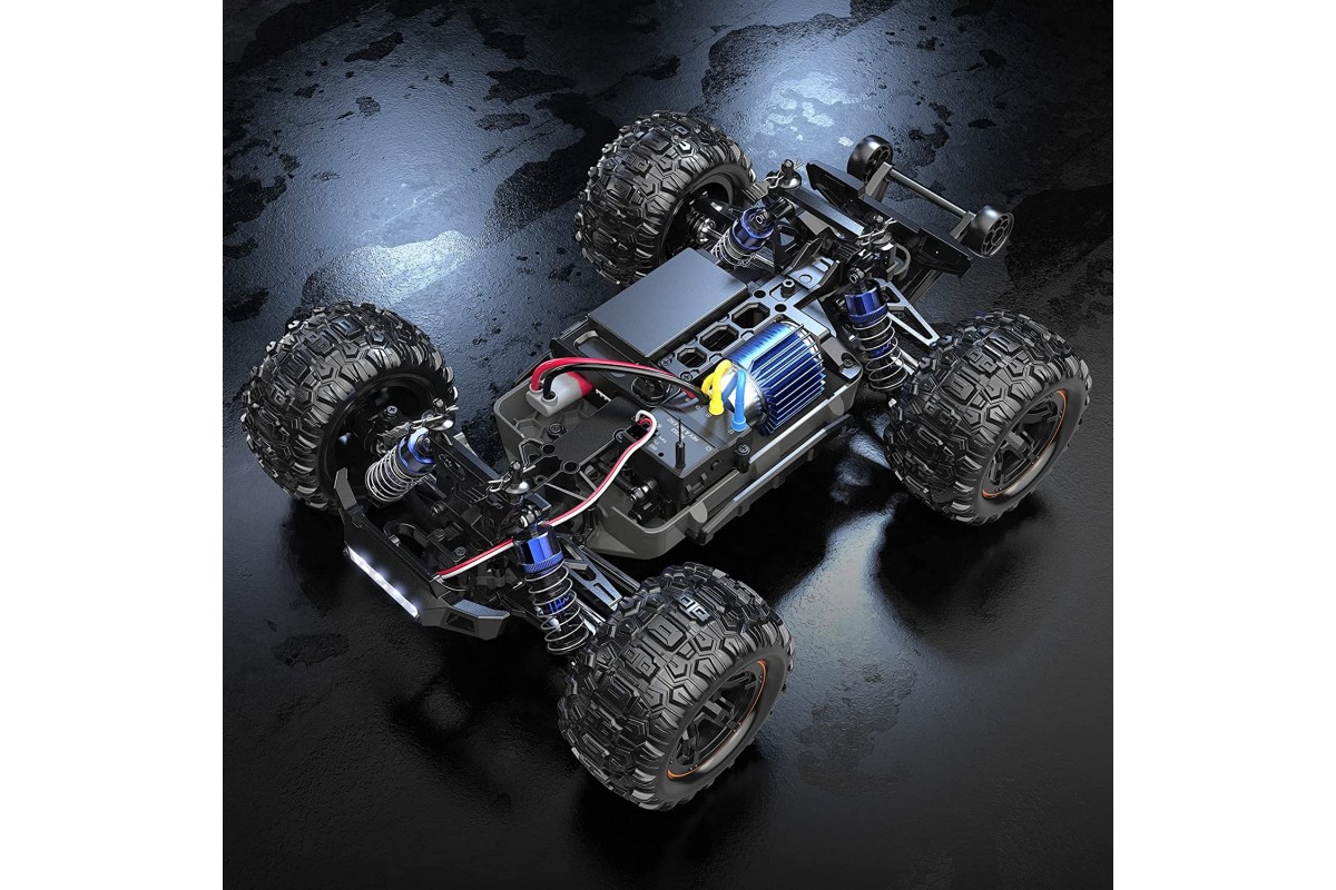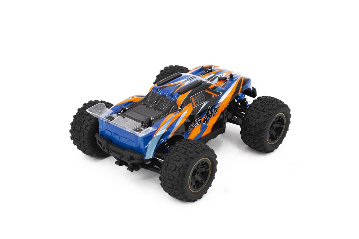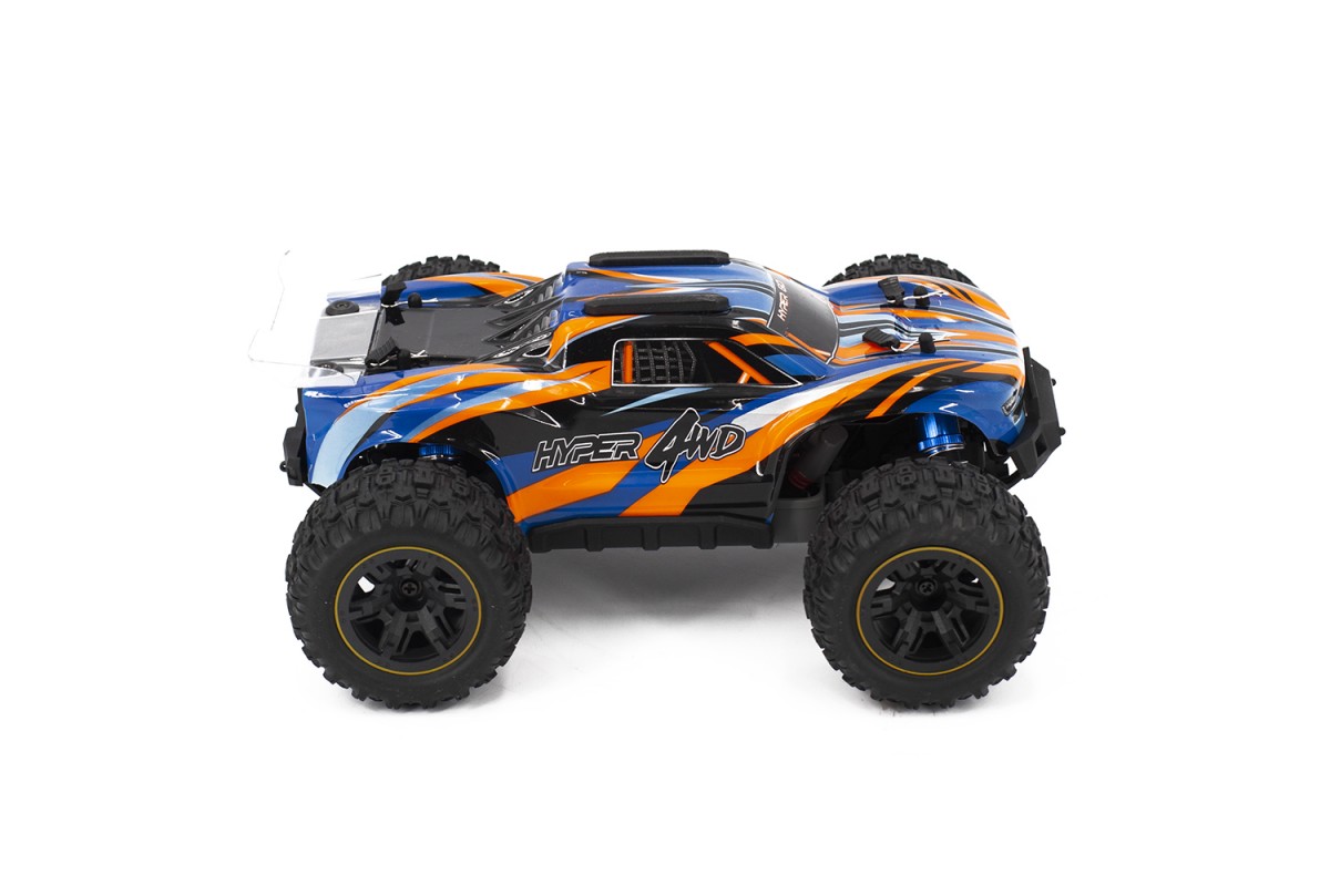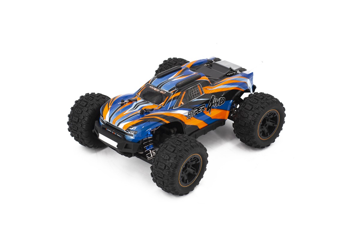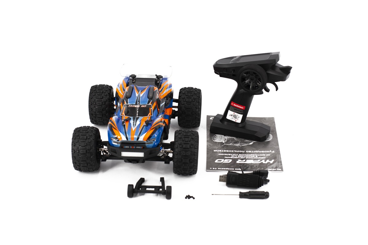 Полный привод повышает проходимость и управляемость модели. На Hyper Go установлен коллекторный двигатель 390 класса и влагозащищенный приемник 2 в 1. Мощный аккумулятор Li-Ion 7.4V 850 mah, идущий в комплекте, придает модели большую мощность! Пульт управления на частоте 2.4Ghz позволит управлять моделью на расстоянии до 45 метров. LED подсветка переднего бампера сделаем игру в темное время суток незабываемой.