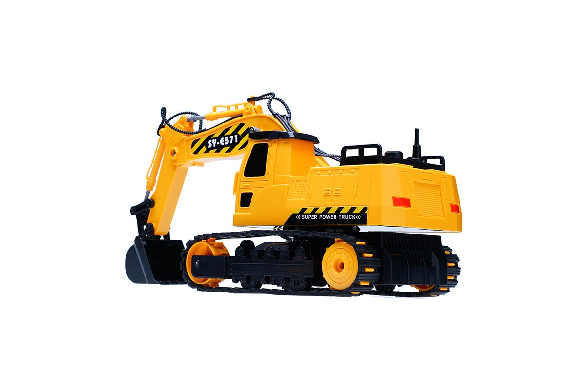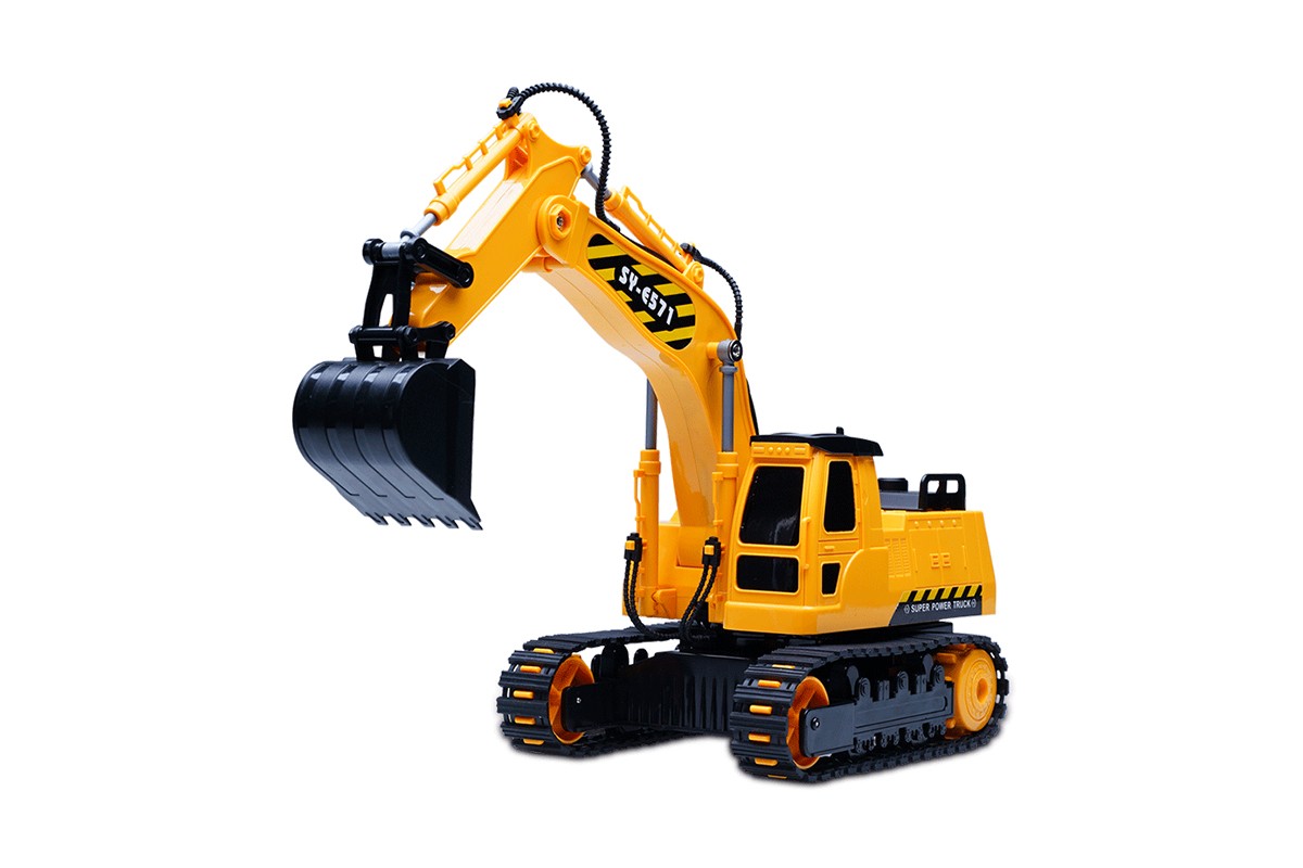 Главным преимуществом такой машинки является полноценное радиоуправление. Пульт выполнен в форме джойстика. Подобное решение будет полезно для самых маленьких, так как оно понятно на интуитивном уровне. Непосредственно на пульте имеется контроллер работы ковша. После нажатия кнопки он поднимается и опускается. Ковш двигается вперёд и назад, перемещается вверх/вниз, может зачерпывать. Экскаватор ездит вперед, назад, вправо, влево, а кабина поворачивается на 360 градусов. Машинка быстро набирает максимальную скорость и весьма уверенно ведёт себя не только на полу дома, но и на настоящей стройке во дворе.