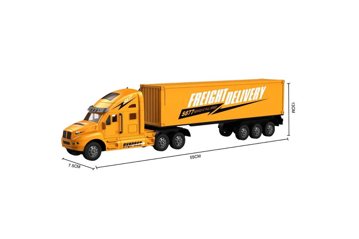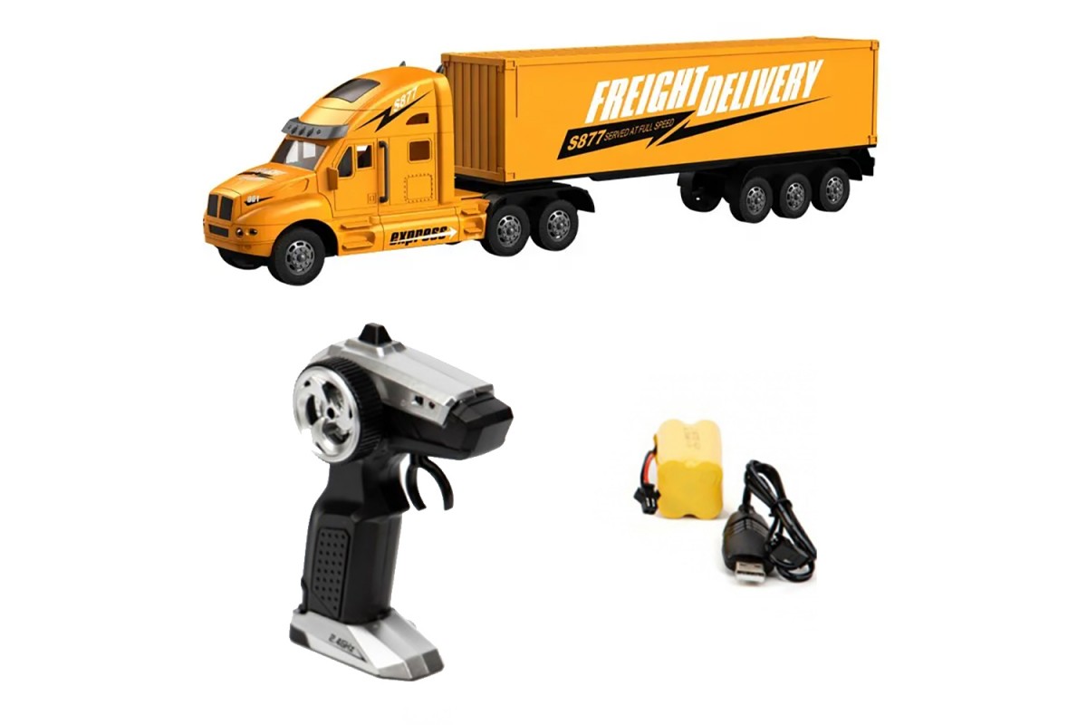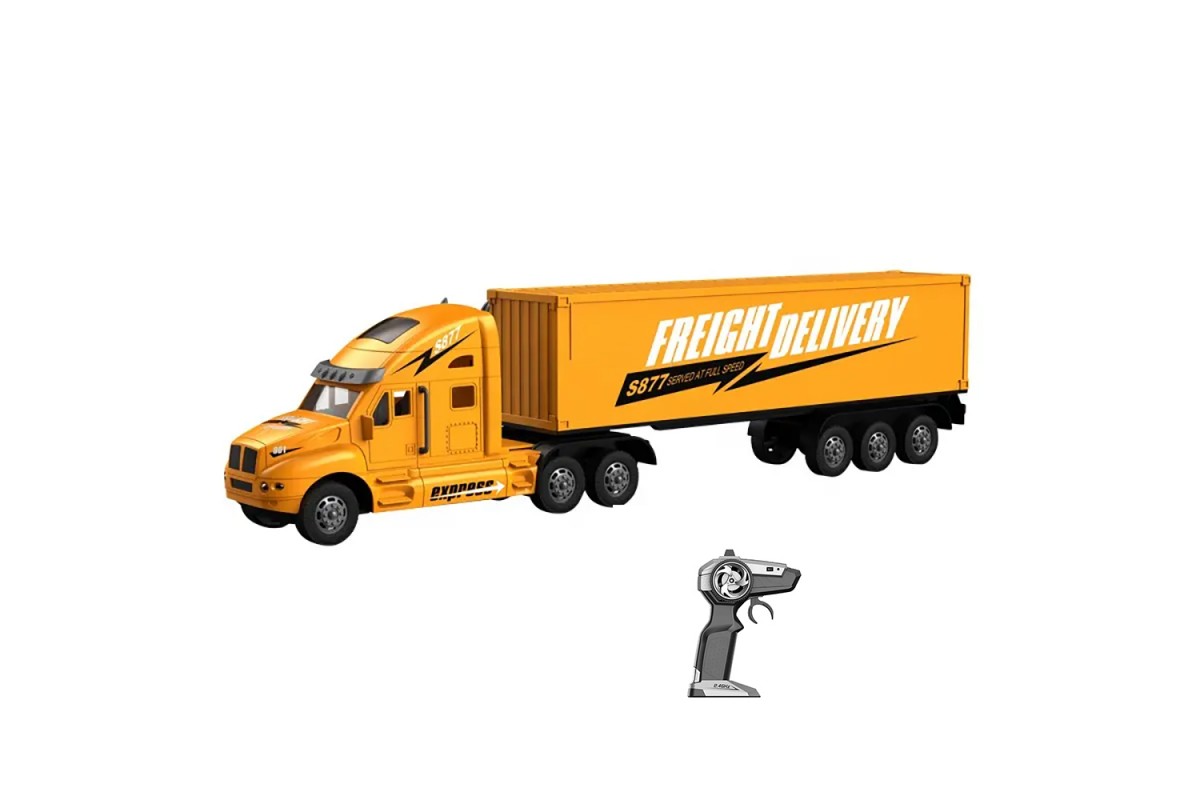 Радиоуправляемый грузовик трейлер (2WD, акб, 1:16) - GM1937-YELLOW - это грузовой транспорт, специально предназначенный для дальних перевозок. Ведь грузовой тягач можно отправить в другой город или даже заграницу, например, в соседнюю игрушечную страну! Какие приключения ждут эту машинку – об этом знает только ее юный владелец. Ребенок оценит по достоинству высокую детализацию и реалистичность модели. Ведь трейлер отличается от настоящего как бы размером. Тягач имеет классический тип кузова, окрашенный в желтый черный цвет, а сзади расположен большой грузовой прицеп для разнообразного товара.