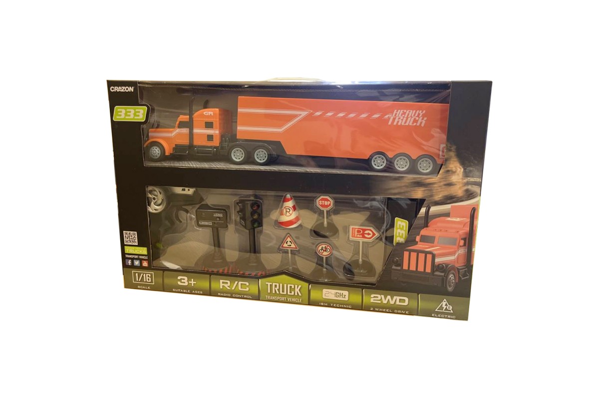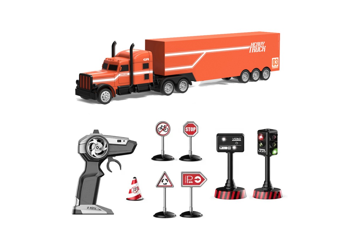 Радиоуправляемый грузовик трейлер и набор дорожных знаков (2WD, акб, 1:16) - GM1932 - это отличный подарок для вашего ребенка, который с легкостью придумает огромное количество увлекательных сюжетов для своих игр. Представленная машина выполнена в масштабе 1:16. Современная модель состоит из специального прицепа и тягача.