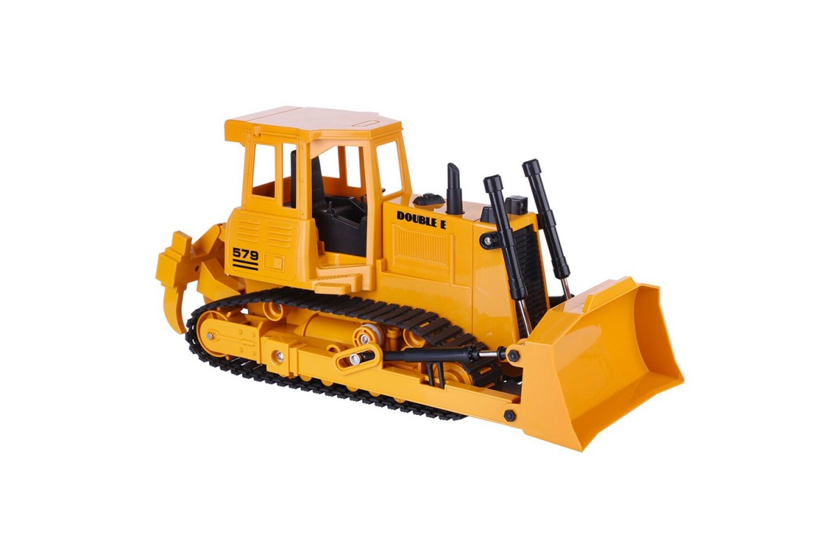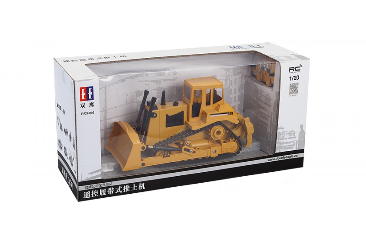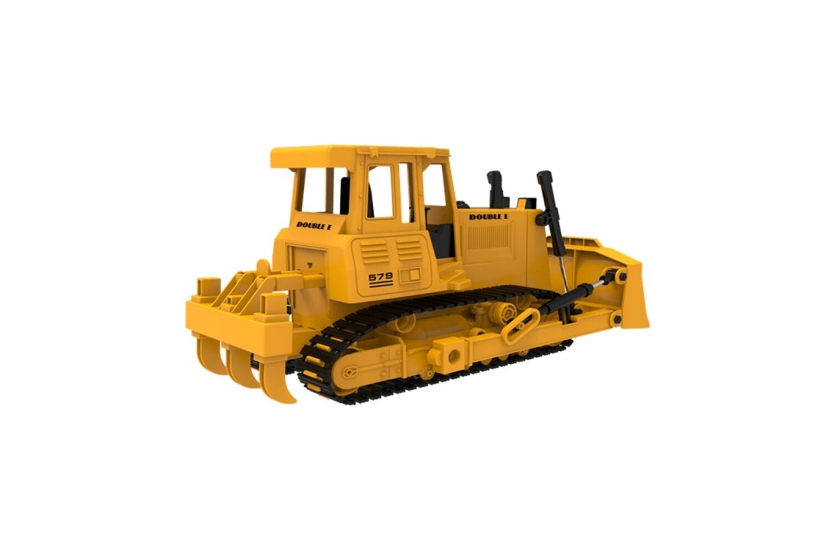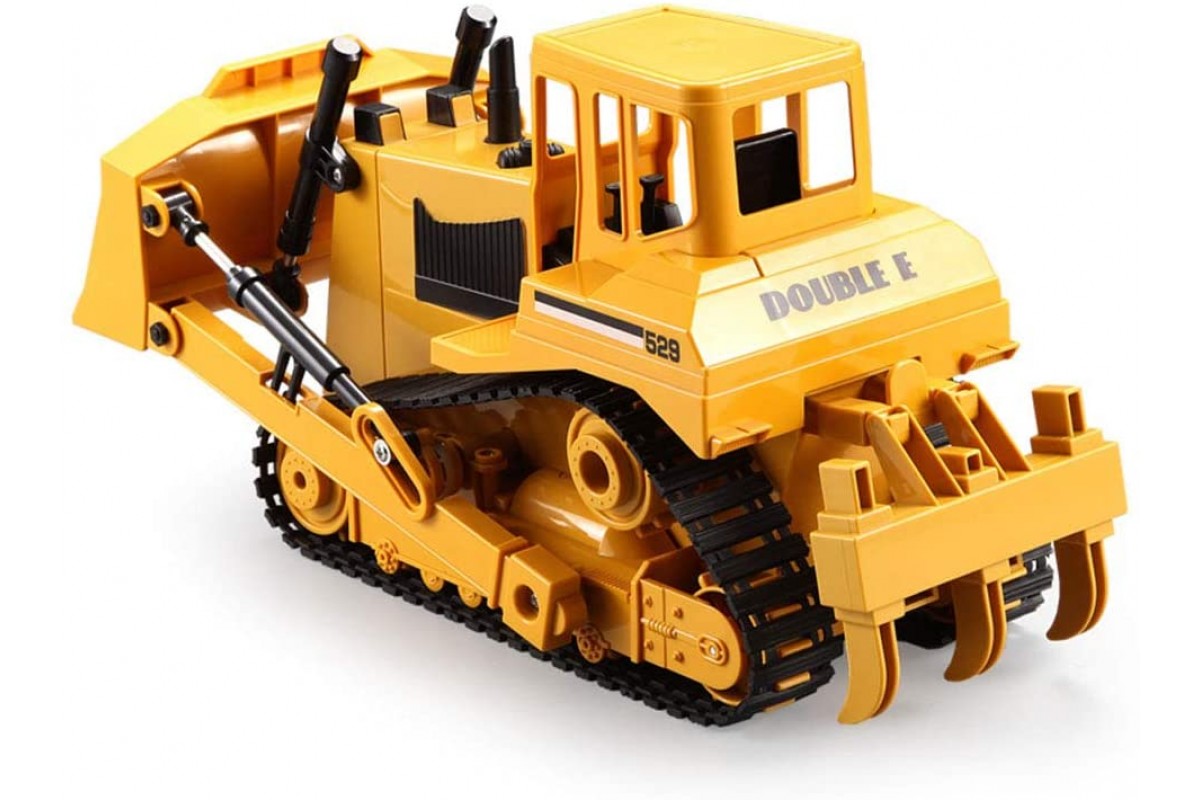 Радиоуправляемый гусеничный бульдозер Double E 1:20 2.4G - E579-003:имеет строительный желтый стиль. Он полностью выполнен из прочного пластика, четыре электромотора обеспечивают движение вперед и назад, повороты влево и вправо, а так же для движения ковшом и вилами разрыхлителя.