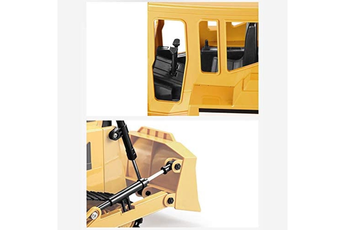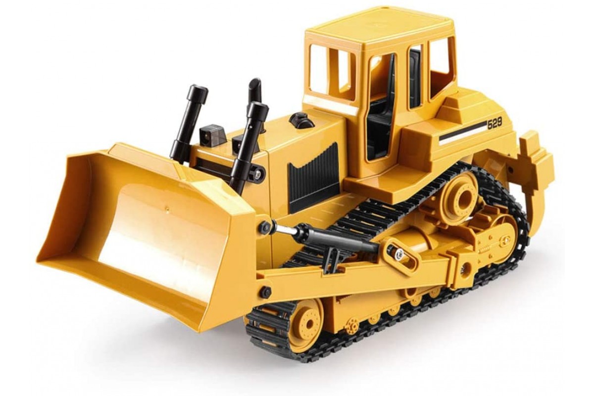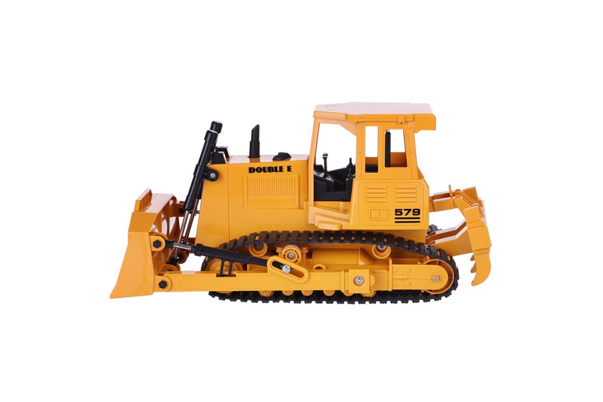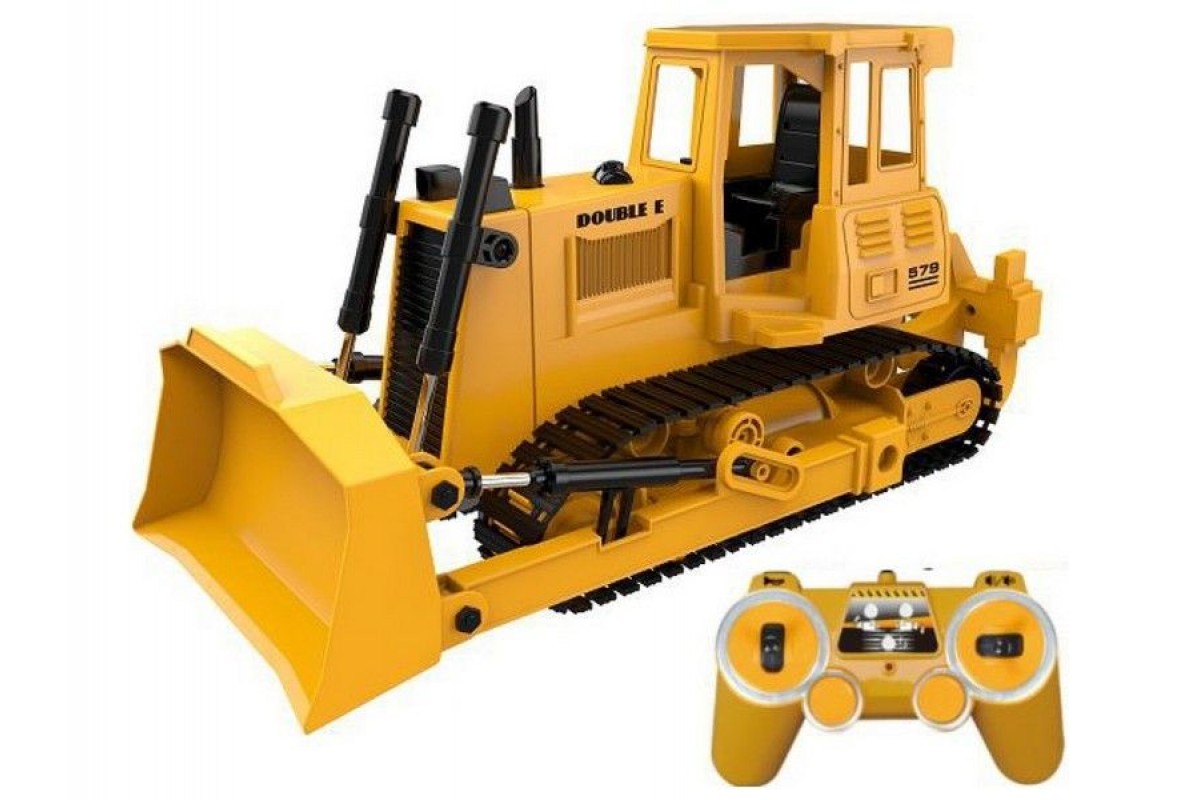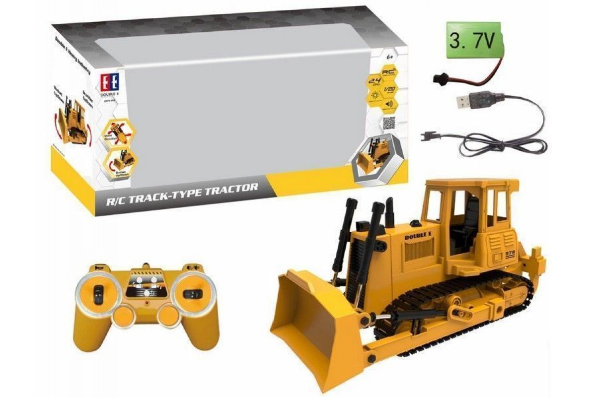 Радиоуправляемый гусеничный бульдозер Double E 1:20 2.4G - E579-003:имеет строительный желтый стиль. Он полностью выполнен из прочного пластика, четыре электромотора обеспечивают движение вперед и назад, повороты влево и вправо, а так же для движения ковшом и вилами разрыхлителя.