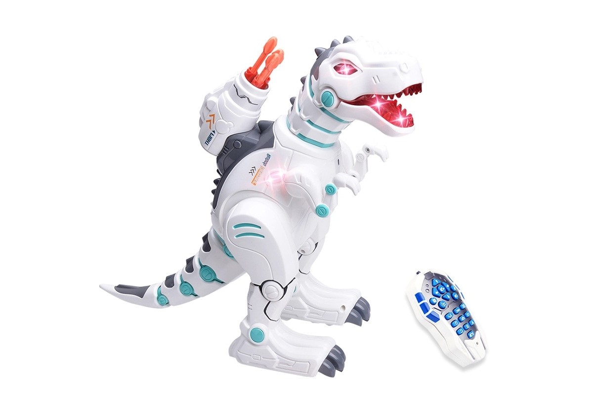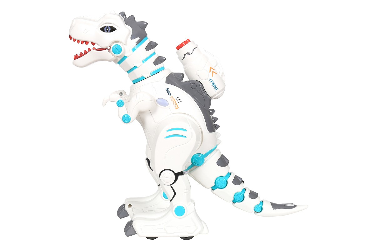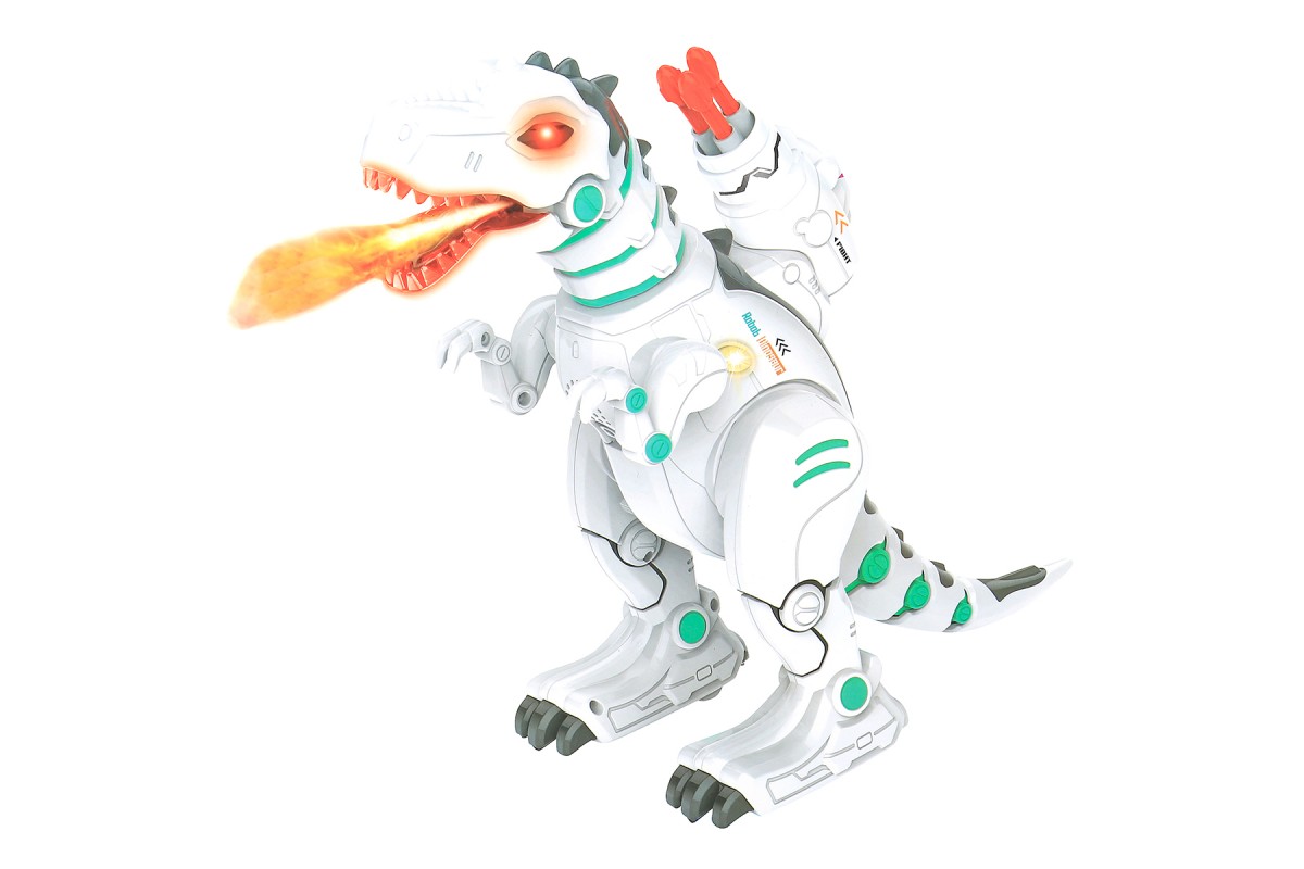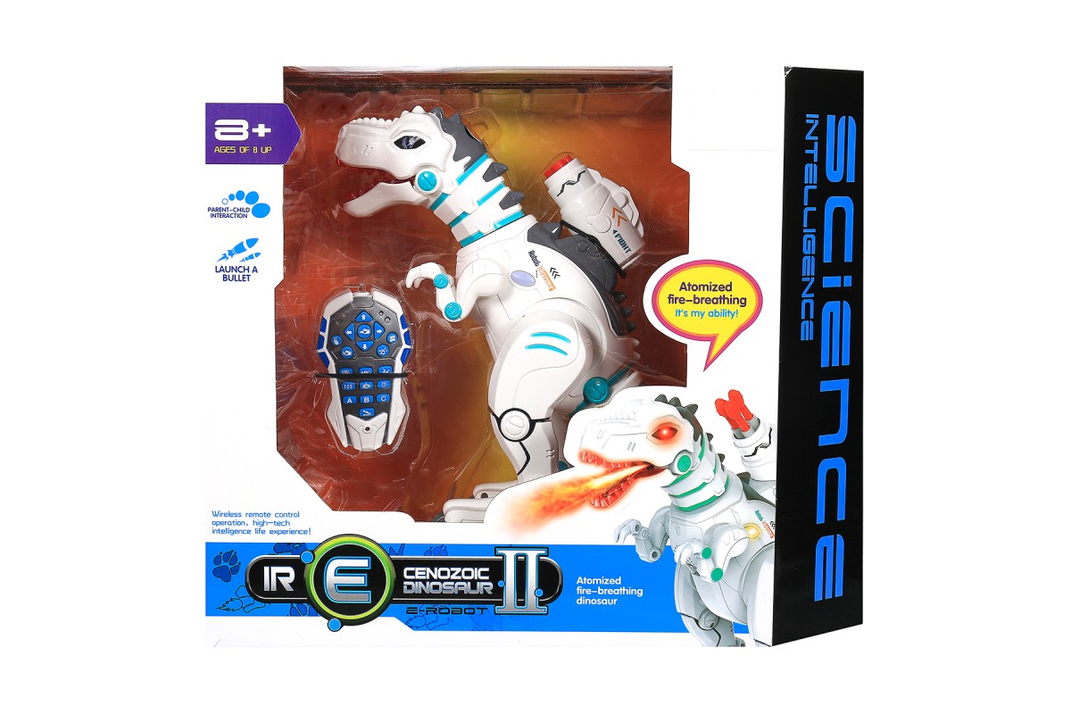 Радиоуправляемый интерактивный динозавр, стреляет ракетами + дышит паром - 88002 - это динозавр, который может: ходить в нескольких режимах, разворачиваться в обе стороны, стрелять присосками, танцевать( робот двигается, стреляет, рычит под набор песен), запоминать команды, а потом их выполнять. И последнее и самое главное : робот выпускает пар изо рта. Пар в свою очередь подсвечивается лампочками, что создаёт эффект огня.