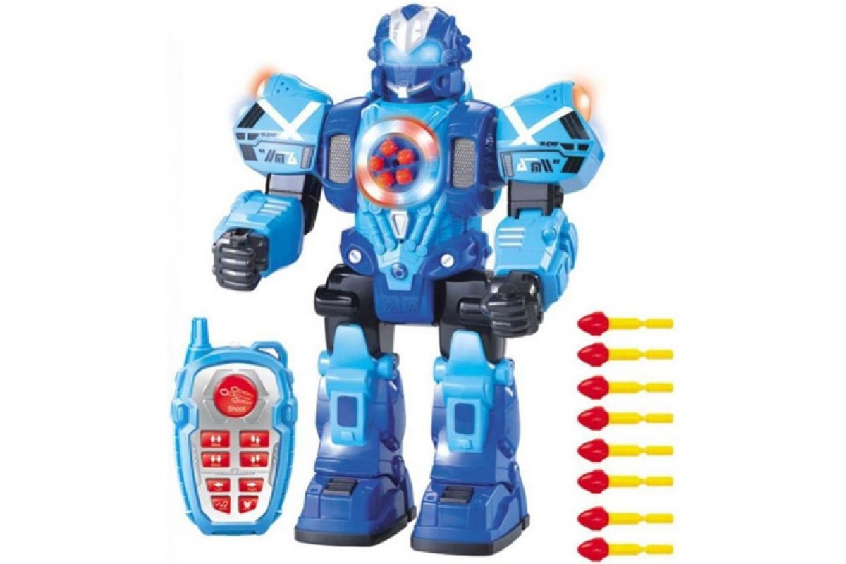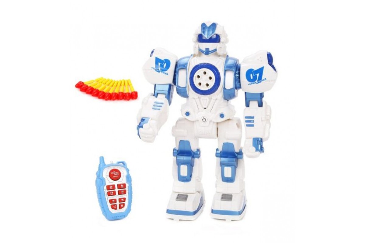 - Этот робот - настоящий снайпер. У него на груди расположен барабан, который выпускает пульки. Управление производится с помощью удобного пульта. Чтобы робот стрелял, необходимо предварительно установить дротики в 5 круглых отверстий на его груди, а затем нажать кнопку SHOOT.