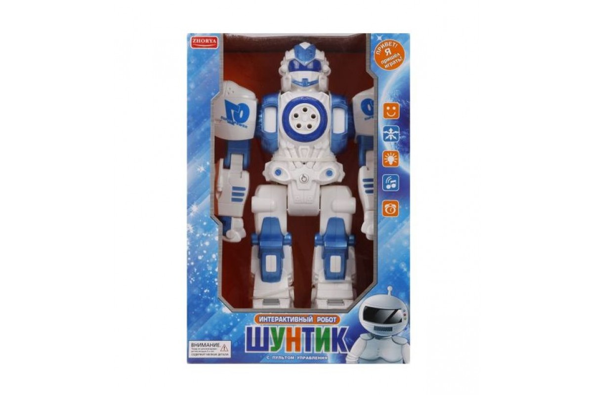 Радиоуправляемый интерактивный робот Шунтик - ZYI-I0014-1 - это интерактивный робот «Шунтик» со светозвуковыми эффектами. Игрушка распознаёт 23 голосовые команды, выполняет 11 команд от пульта управления, поёт 4 песни и танцует. «Шунтик» знает разные игры, сказки, скороговорки и сможет научить ребёнка алфавиту. Игрушка умеет стрелять ракетами, а также двигать головой, туловищем и руками. Робот ходит по направлениям вперёд и назад, осуществляет повороты направо и налево. А ещё «Шунтик» показывает время и может работать в качестве будильника.