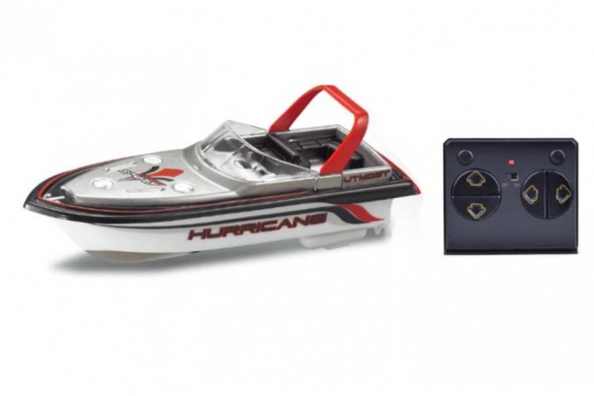 Маленькая радиоуправляемая лодка приводится в движение двумя винтами, которые позволяют ей моментально начать движение.