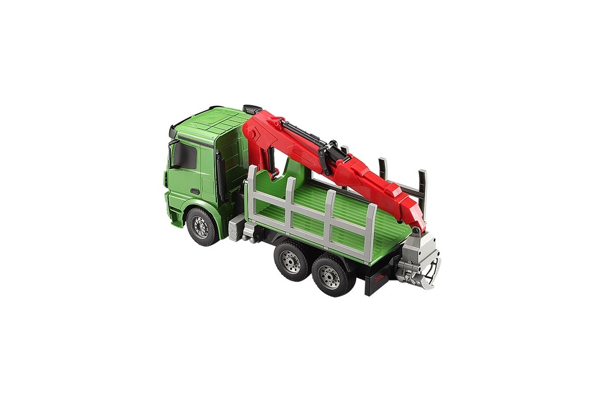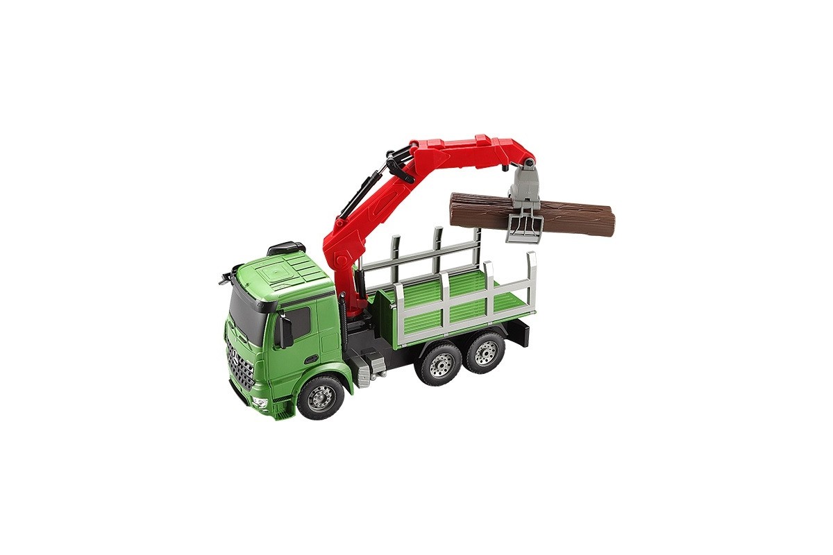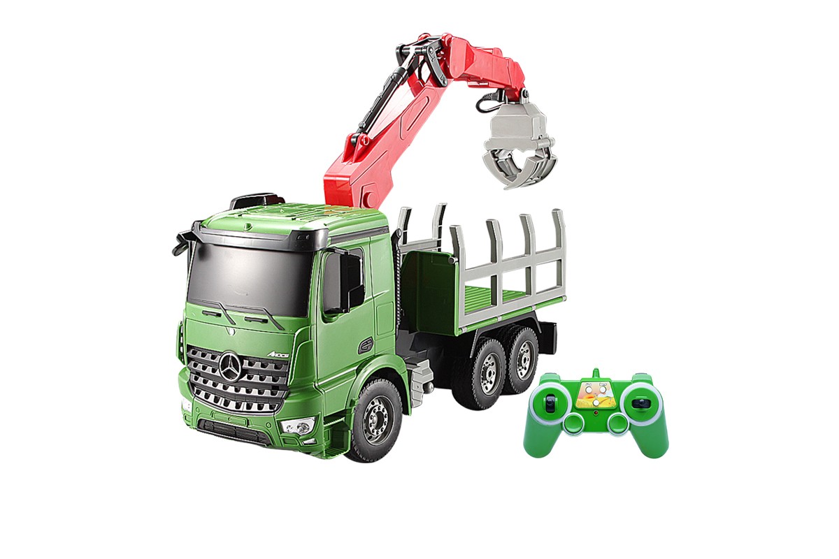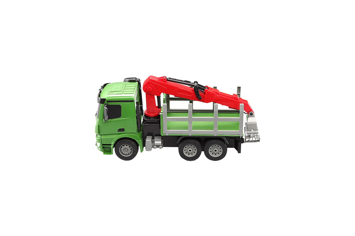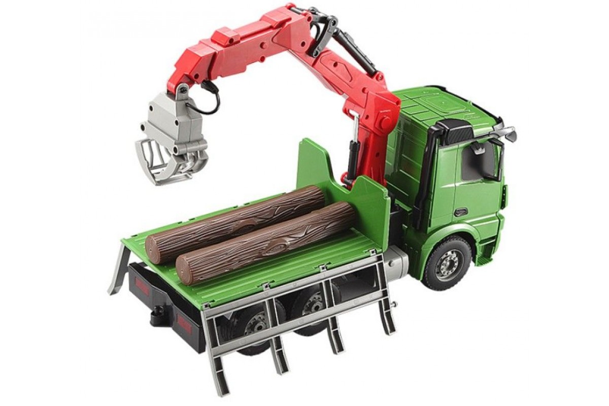 Большой грузовик (длина — 38 см) будет прекрасным подарком для любого начинающего строителя. Это очень функциональная и точная копия Mercedes-Benz, которая официально лицензирована производителем. Радиоуправляемый лесовоз может двигаться в направлении вперед/назад, вправо/влево. Кран может подниматься и опускаться, регулируется высота.