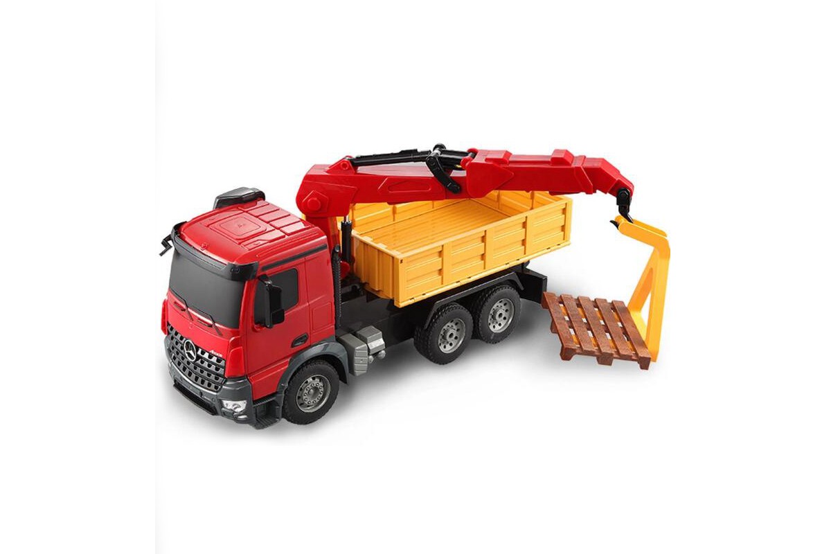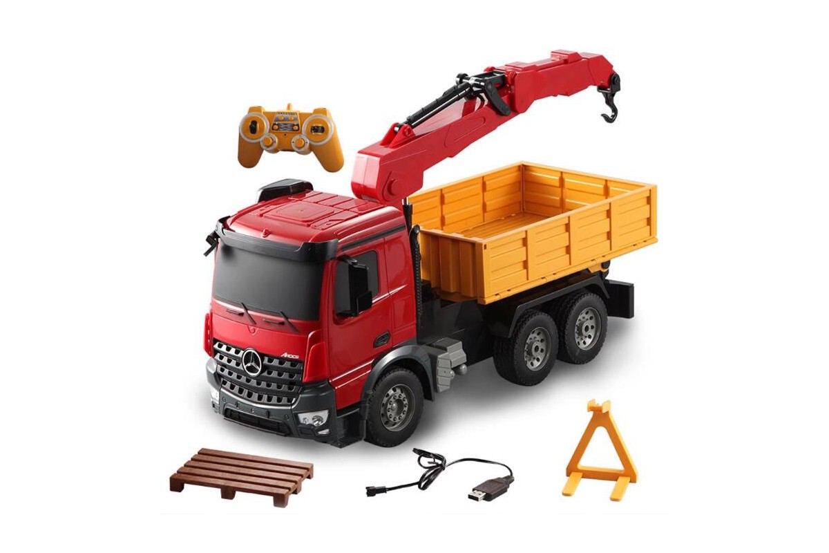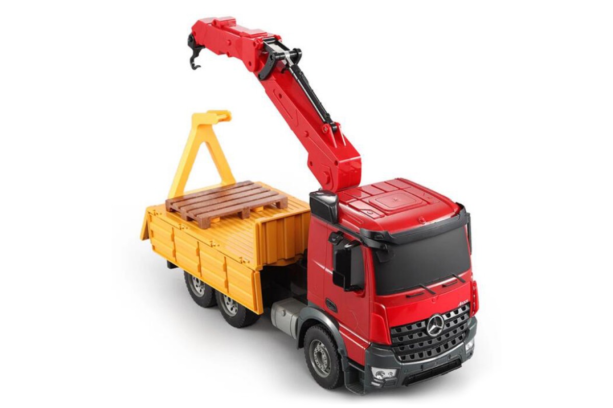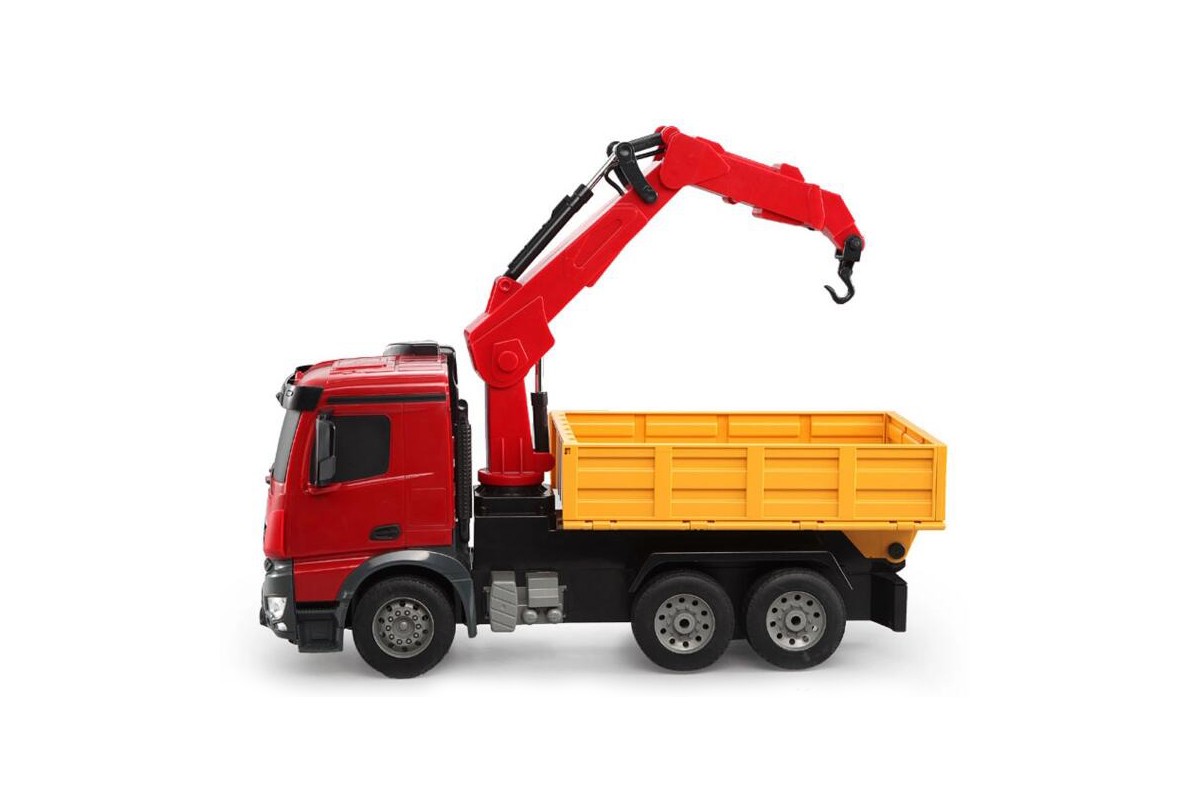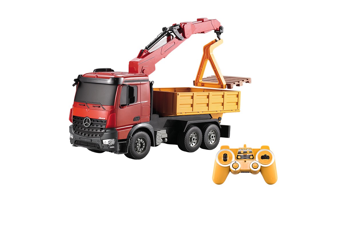 Большой грузовик (длина — 38 см) будет прекрасным подарком для любого начинающего строителя. Это очень функциональная и точная копия Mercedes-Benz, которая официально лицензирована производителем. Радиоуправляемый кран может двигаться в направлении вперед/назад, вправо/влево. Кран может подниматься и опускаться, регулируется высота.