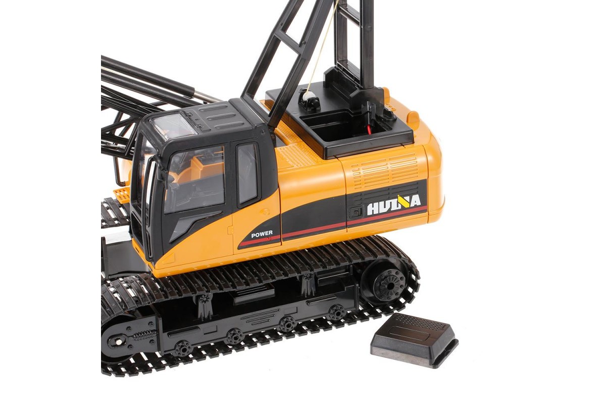 Игрушка является точной копией настоящего подъемного крана, с желтым корпусом и черной кабиной.