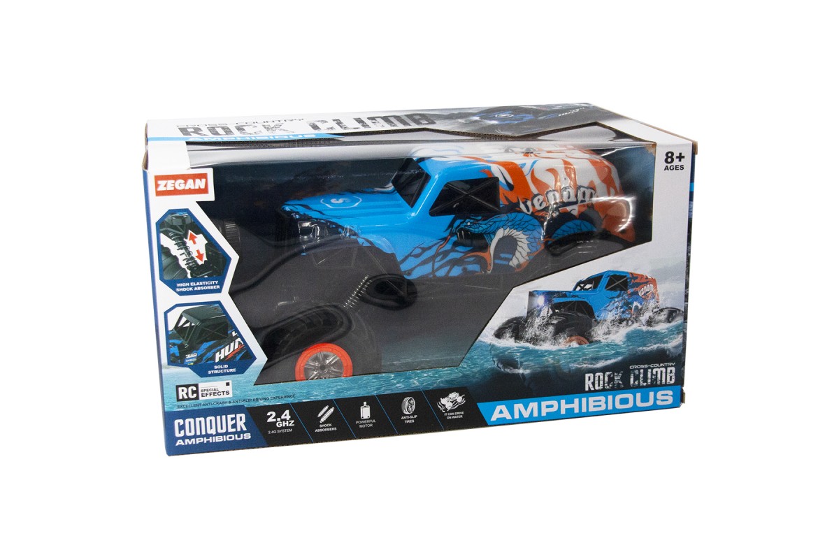 Радиоуправляемый краулер амфибия Zegan Blue Conquier 1:10 - ZG-D10001 - представляет собой краулер амфибия в масштабе 1:10 - это универсальный автомобиль, отличающийся высокими показателями проходимости трассы, проложенной на пересеченной местности и влагозащитой электроники. Автомобиль имеет пластиковую кабину, усиленную раму жесткости. Движется при помощи 4 довольно больших колес, оснащенных шинами с глубоким рисунком протектора.