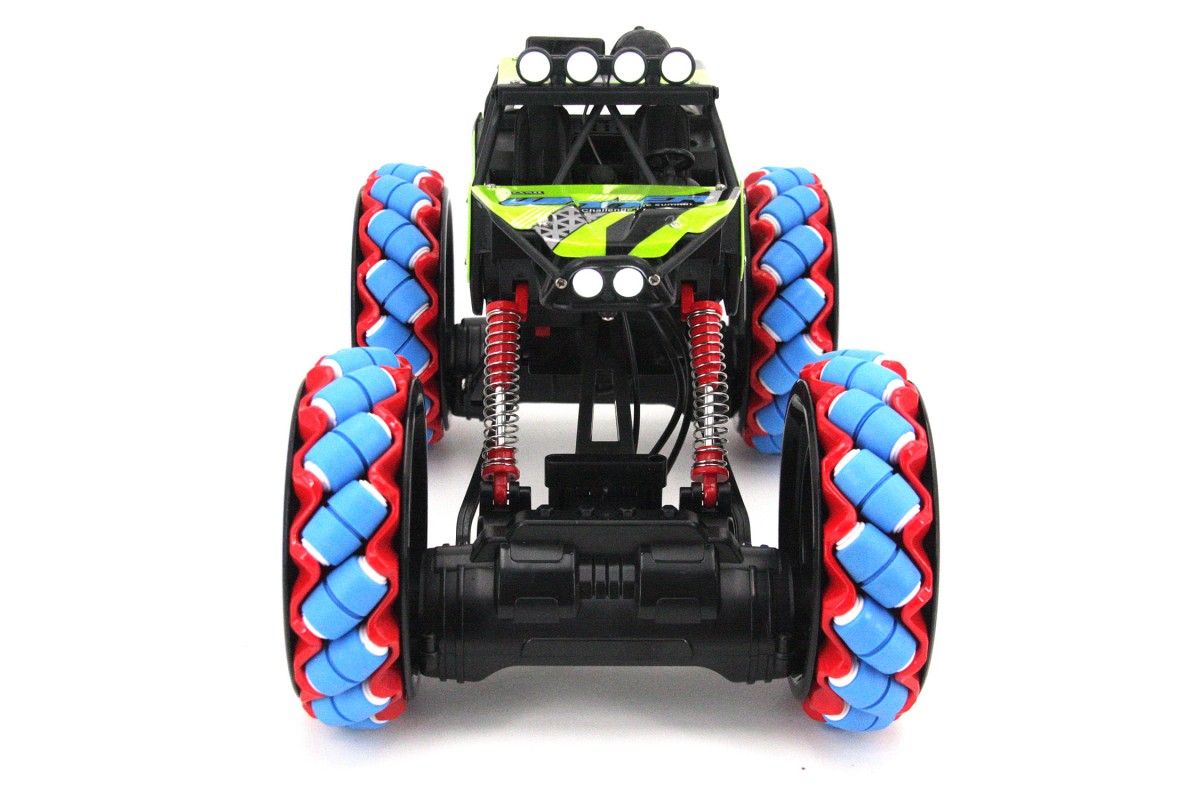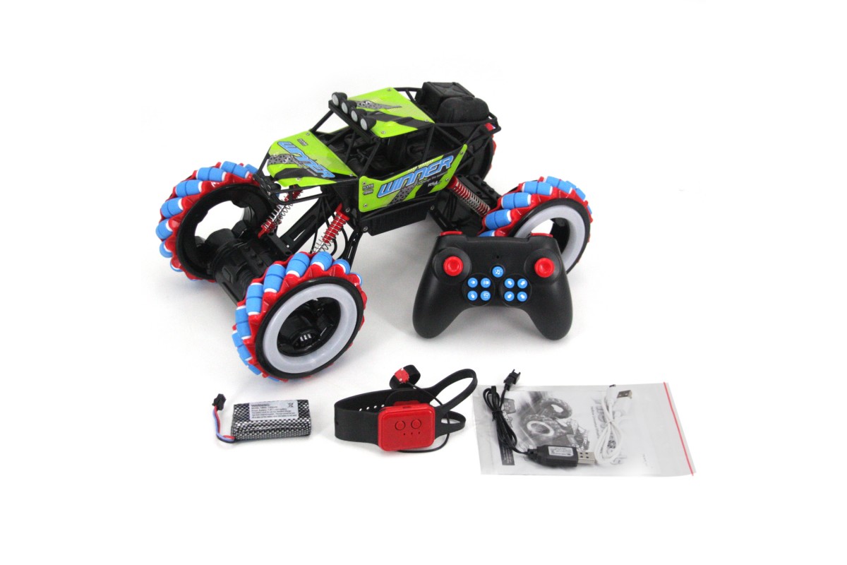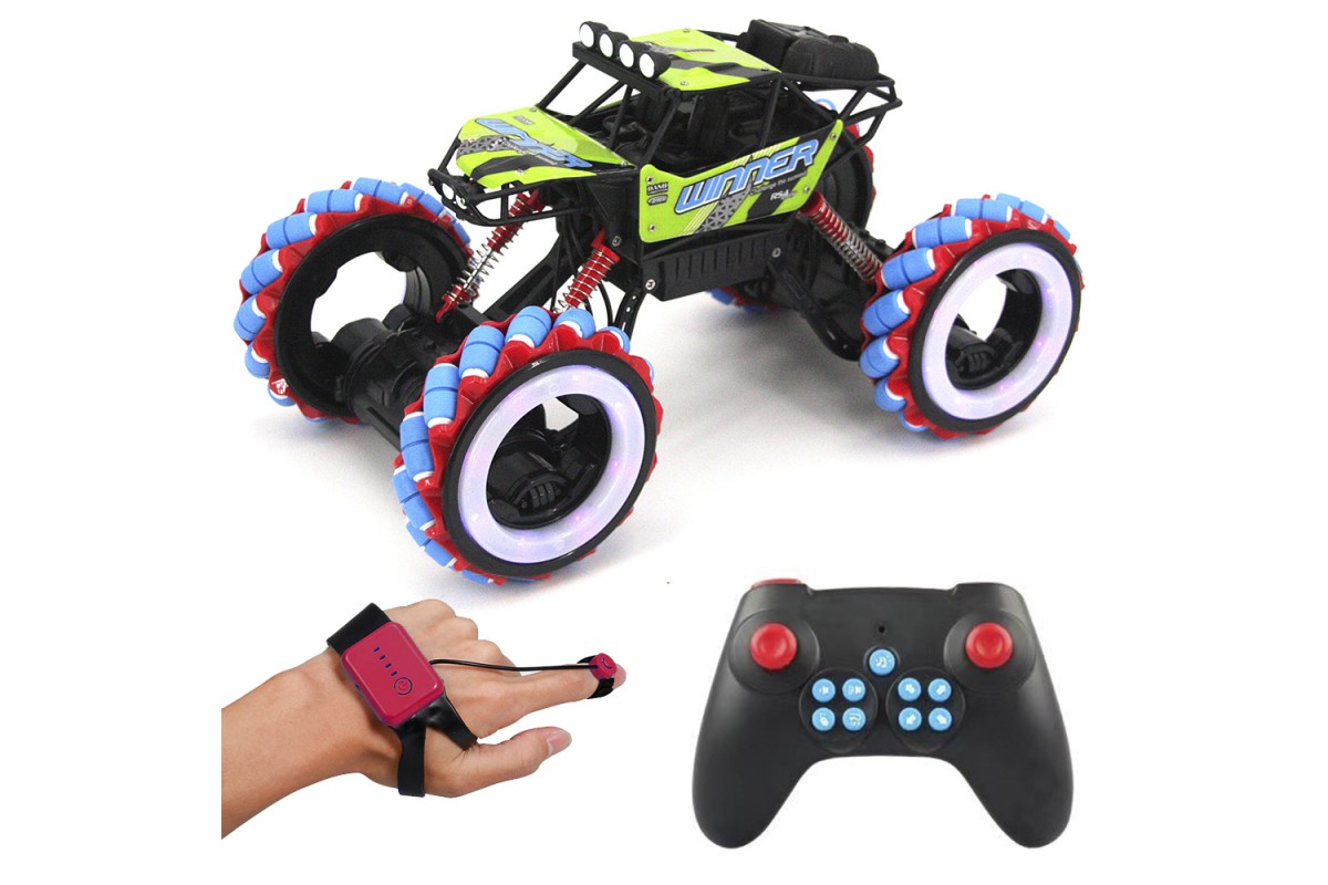 - Контроль жестами: в комплект входит дополнительный пульт, который фиксируются на ладони. Благодаря ему вы сможете управлять вездеходом лёгкими жестами одной руки. При этом вы сможете управлять не только направлением движения, но и изменять высоту подвески машины и делать трюки.