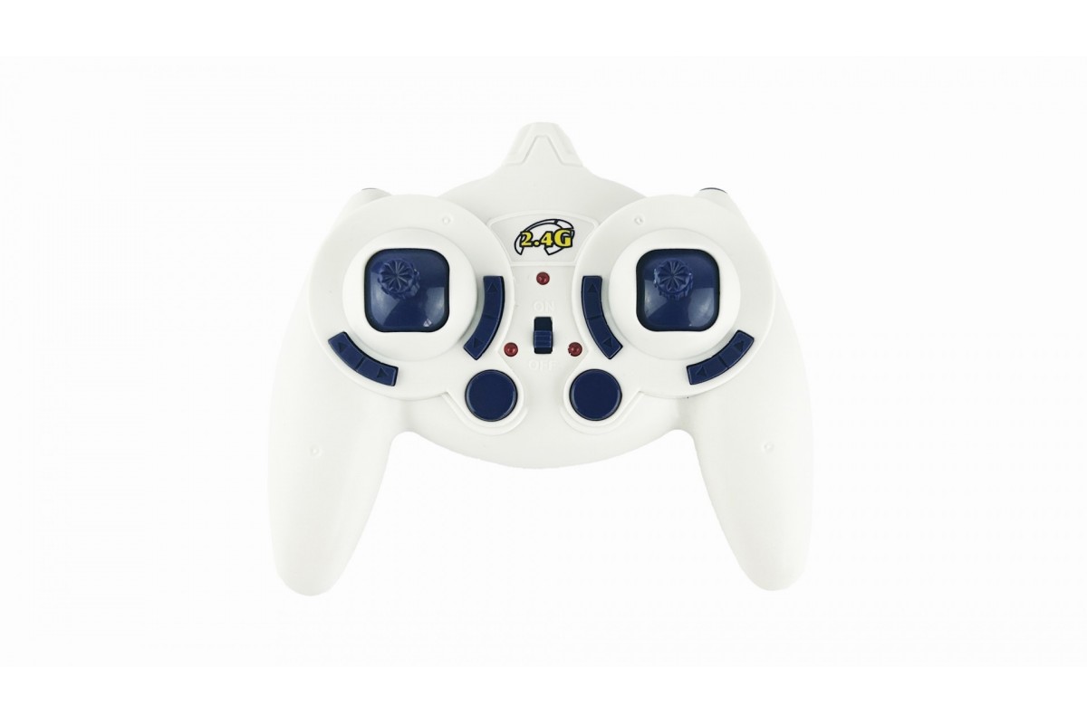 Управление дроном осуществляется посредством пульта дистанционного управления работающего на частоте 2.4Ghz с максимальной дистанцией до 60 метров, питание пульта осуществляется при по помощи самых обычных батареек ААА в количестве четырех штук.