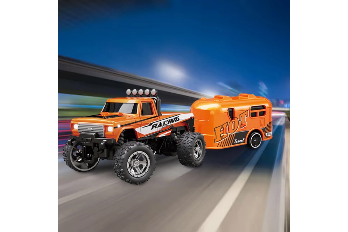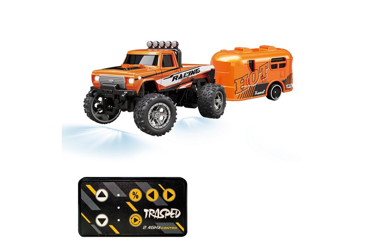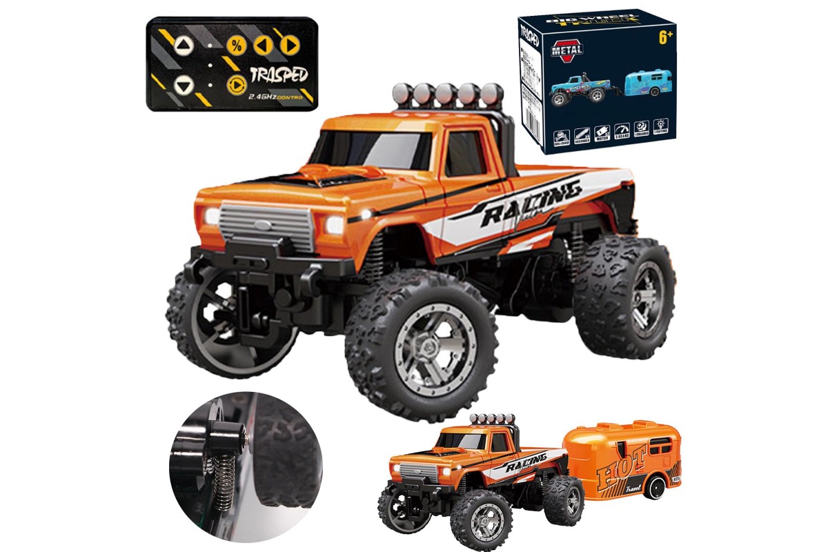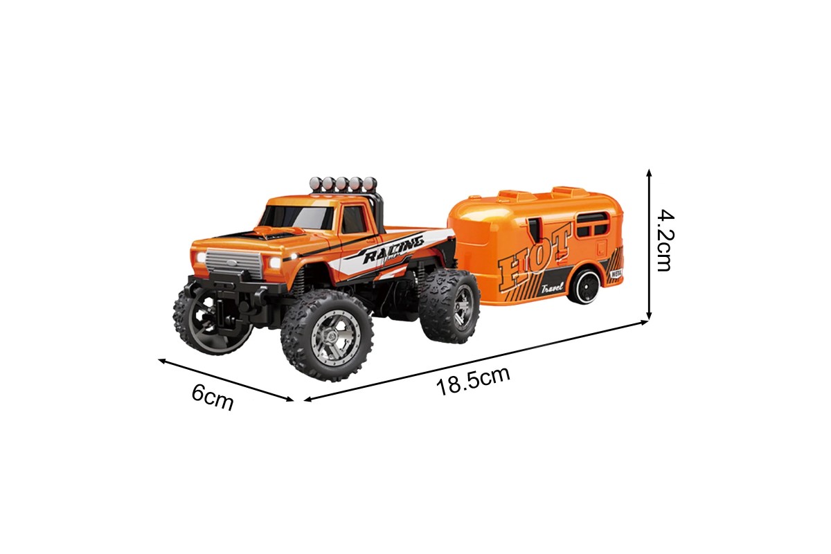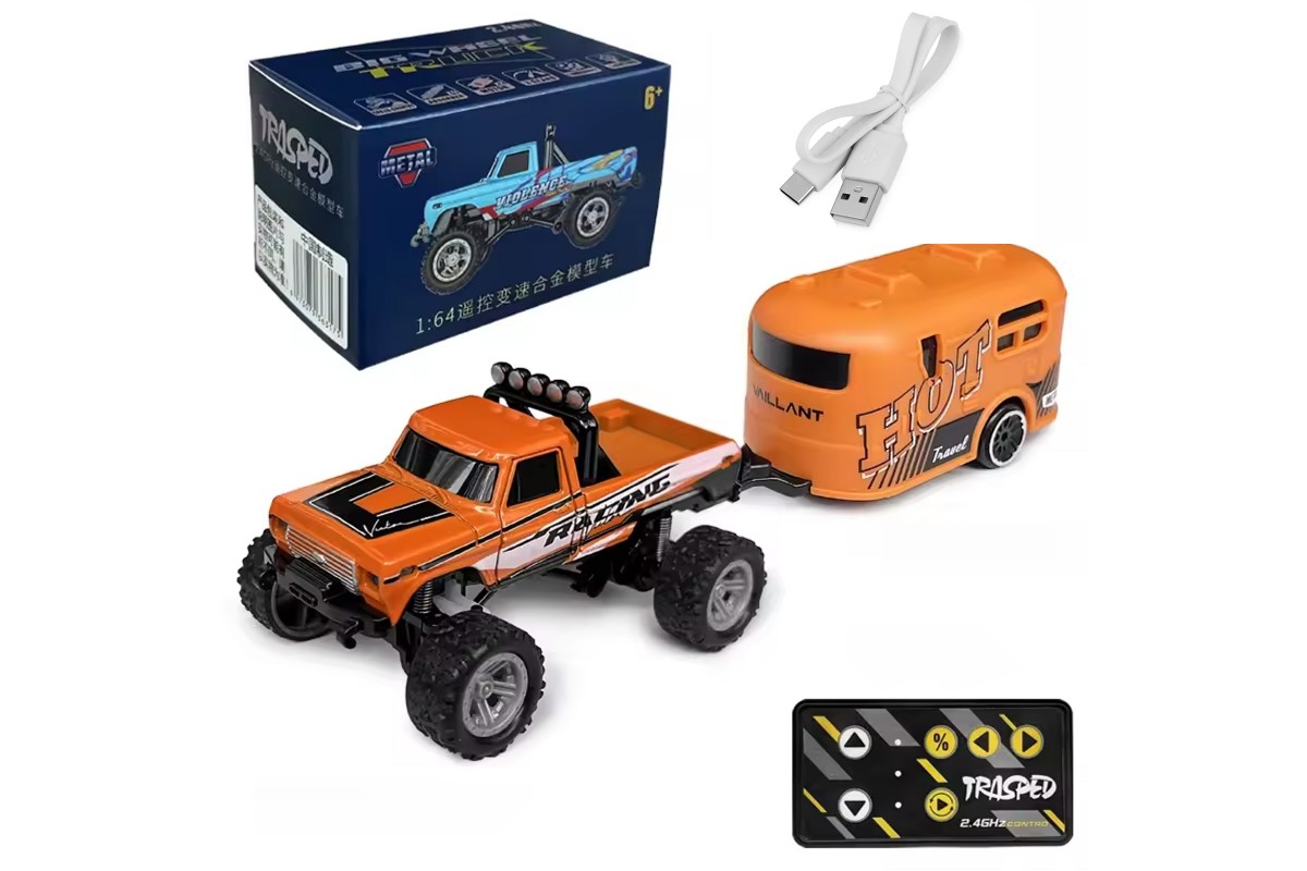 Радиоуправляемый металлический минитрак с прицепом 1:64 - HG4-80-ORANGE - это миниатюрная модель джипа в комплекте с прицепом, которая была разработана специально для преодоления всевозможных препятствий, все колёса имеют аомртизацию и специальный протектор, который позволяет запускать модели и на улице!