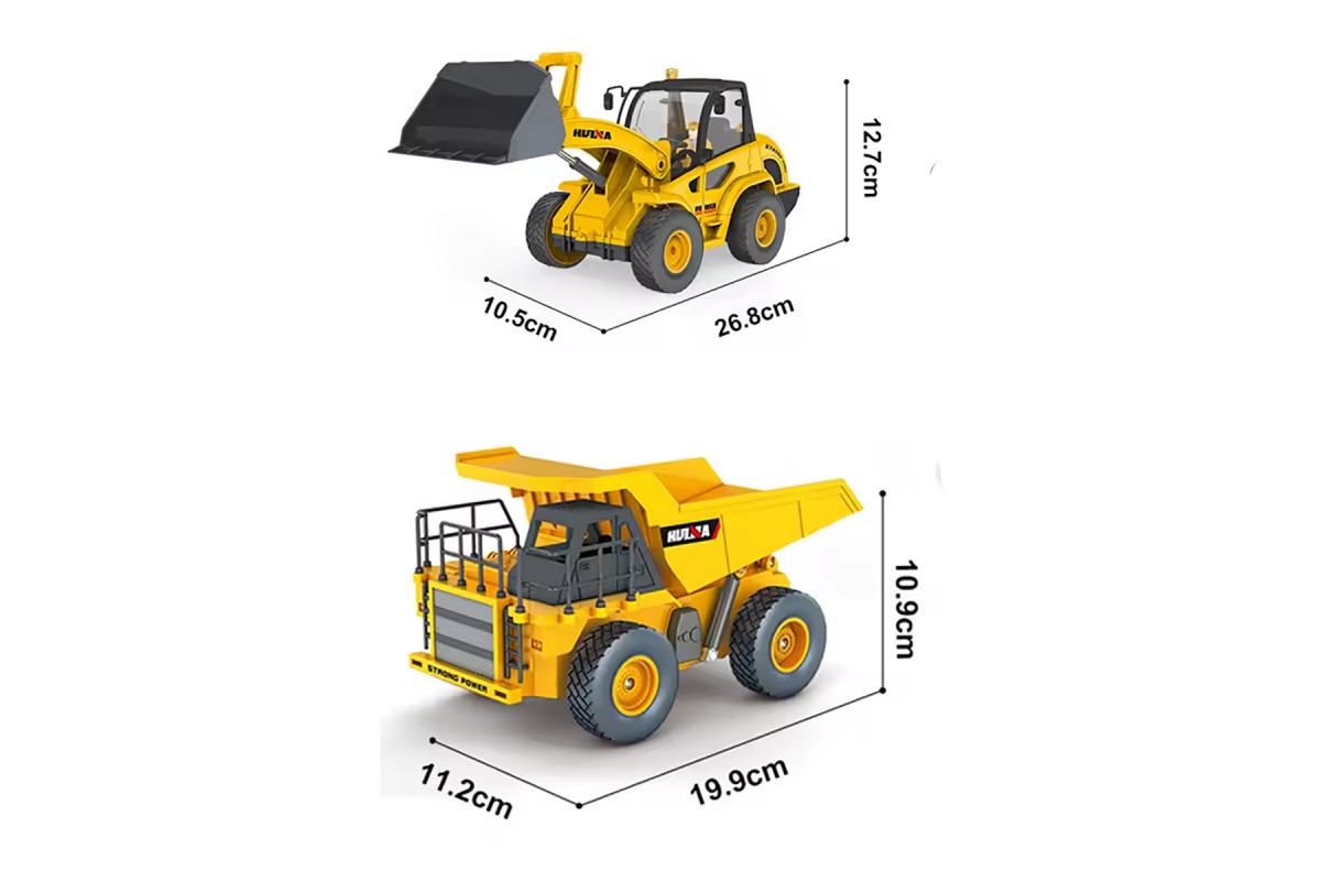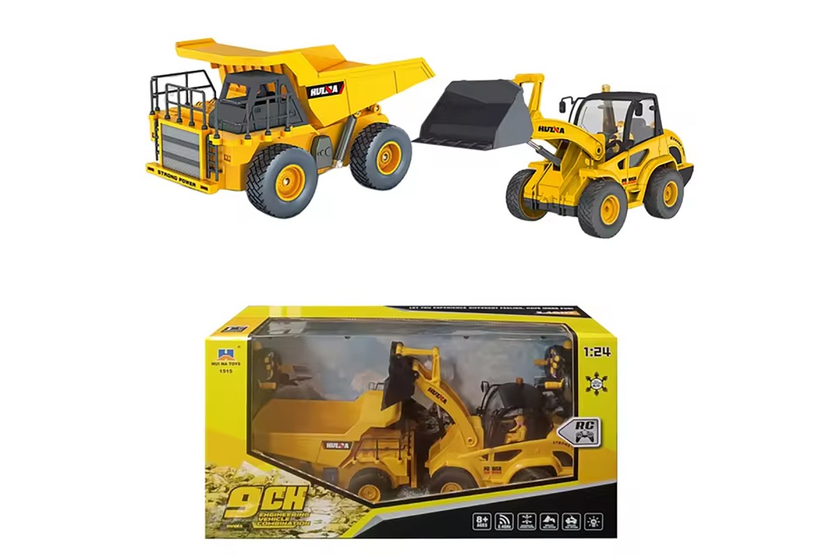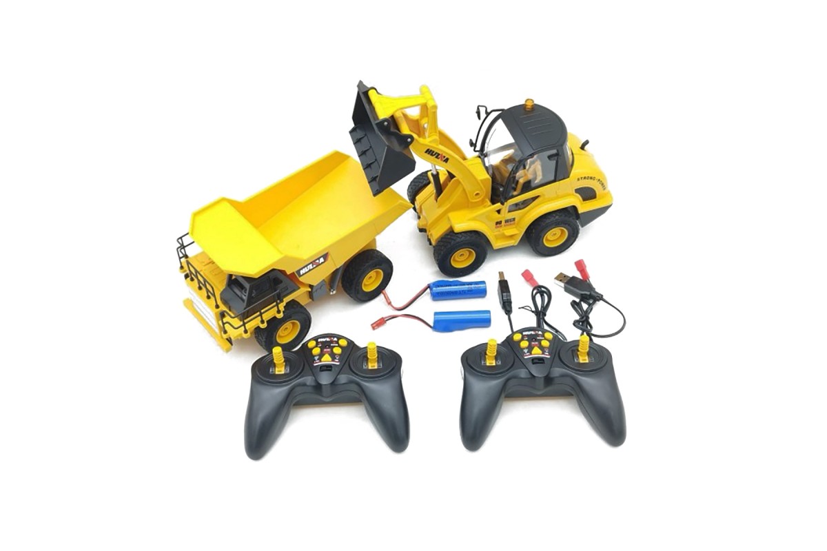 Радиоуправляемый набор бульдозер-погрузчик и самосвал Huina (свет, звук, акб, 1:24) - HN1515 - это набор строительных машин с дистанционным управлением для детей включает в себя бульдозер-погрузчик с дистанционным управлением и перезаряжаемой батареей, а также карьерный самосвал с дистанционным управлением и перезаряжаемой батареей. Кроме того, в этот набор входят два пульта дистанционного управления и два зарядных кабеля. Ваш ребенок достоин двойного удовольствия от игры с друзьями.