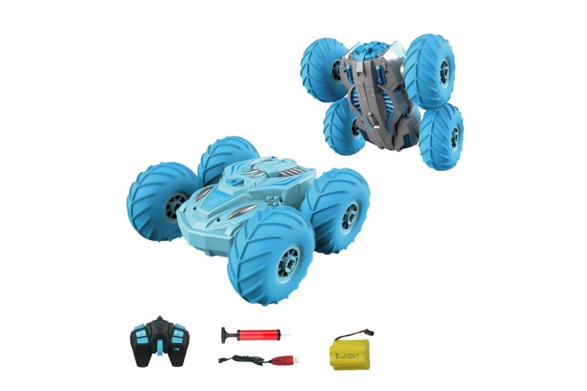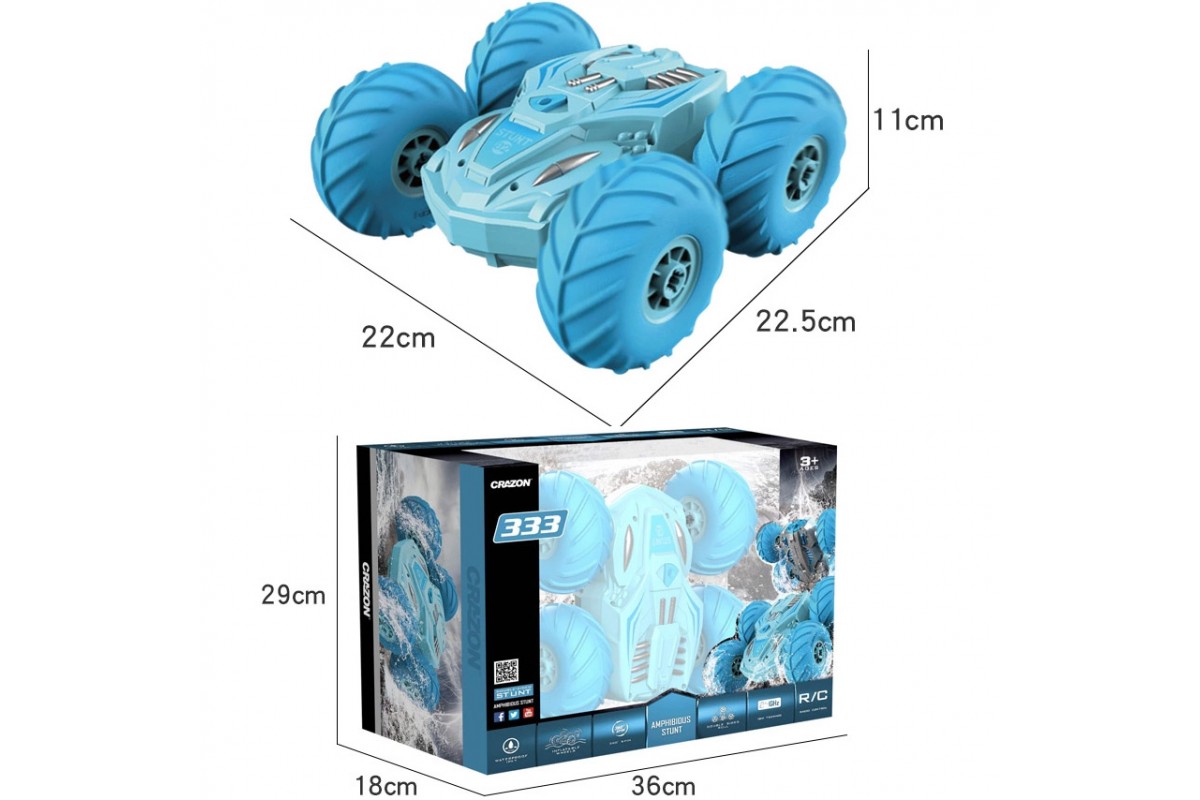 Радиоуправляемый перевертыш амфибия CRAZON (надувные колеса, насос) - 19SL02B - это необычный вездеход с надувными колесами на радиоуправлении отличается высокой скоростью и способностью преодолевать различные препятствия. Может ездить по грязи, снегу, песку и плавать по воде. Управляется при помощи удобного пульта с повышенным радиусом действия. Работает от емкого аккумулятора позволяющего амфибии-вездеходу работать около 20 минут на одном заряде. Является перевертышем и может ездить на любой из сторон.
