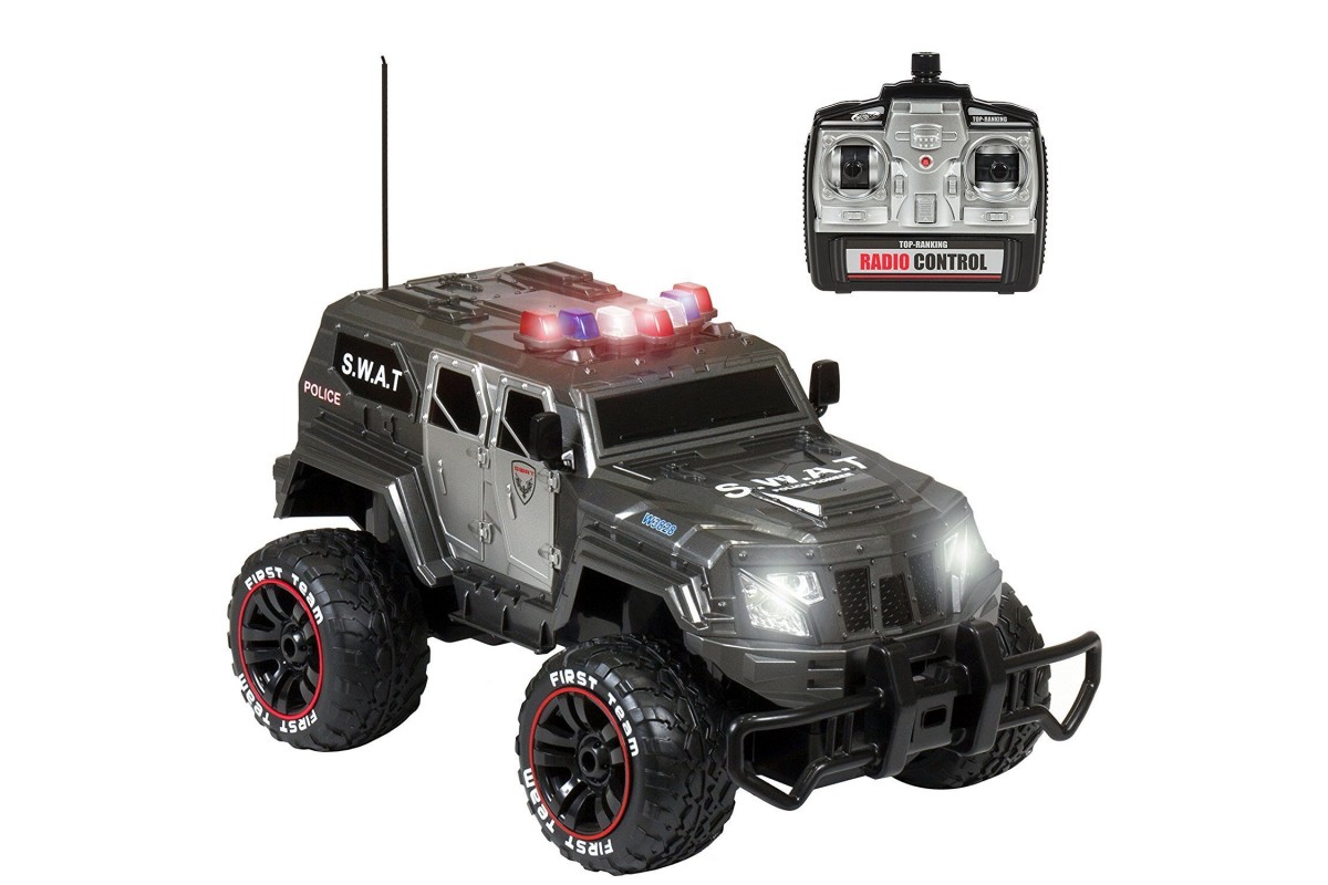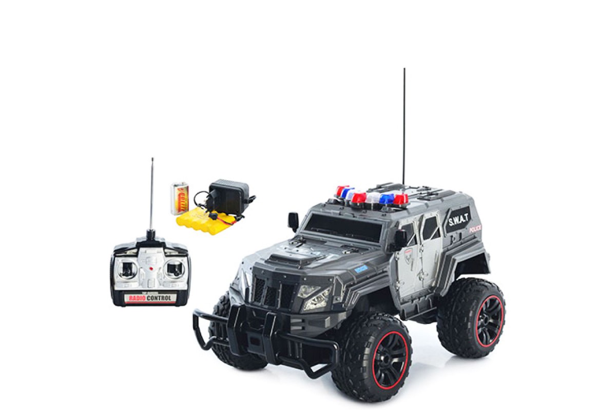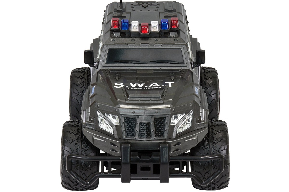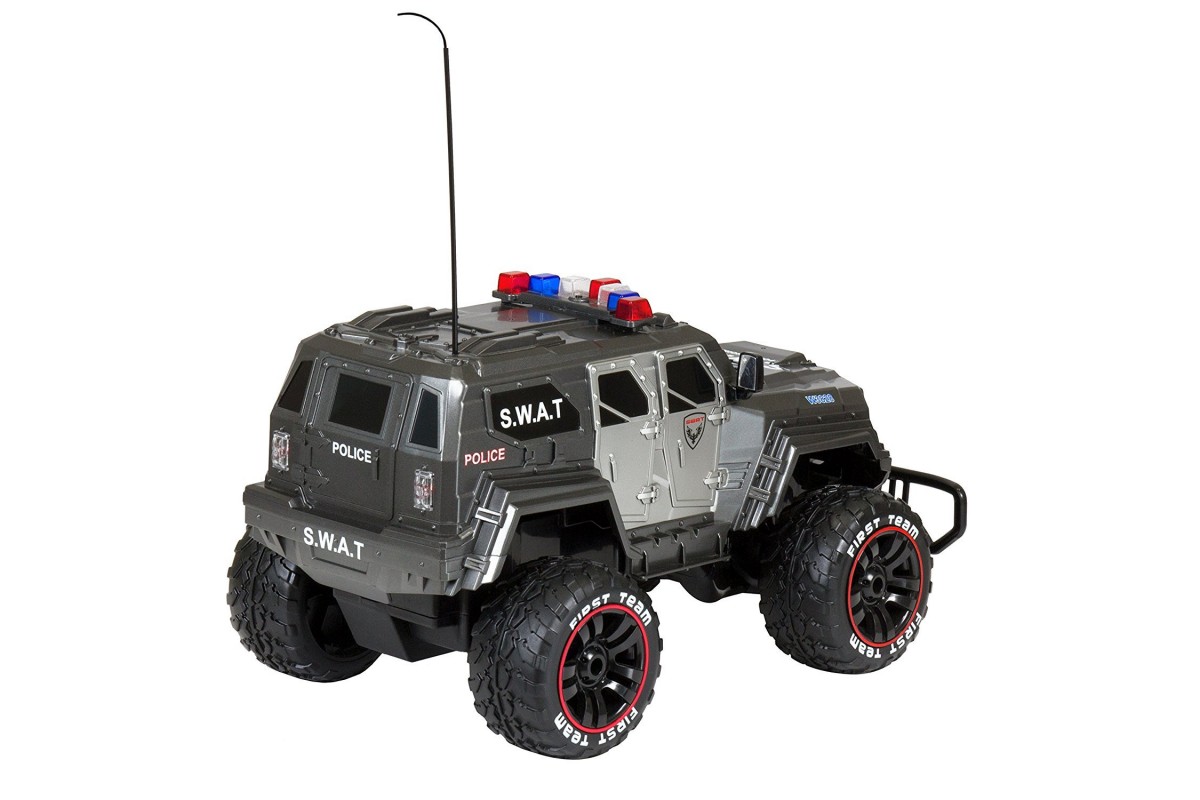 Радиоуправляемый полицейский джип Wineya SWAT 1:12 - W3828N - это мощный и большой (38 см) полицейский джип на радиоуправлении - игрушка, которая понравится не только ребенку, но и взрослому! Машина выглядит очень реалистично и даже брутально благодаря большим колесам, бамперу и расцветке. Машина ездит вперед и назад, совершает повороты направо и налево, останавливается. Включаются фары и проблесковые маячки. Если нажать кнопку, расположенную на крыше, то можно поменять цвет маячков.