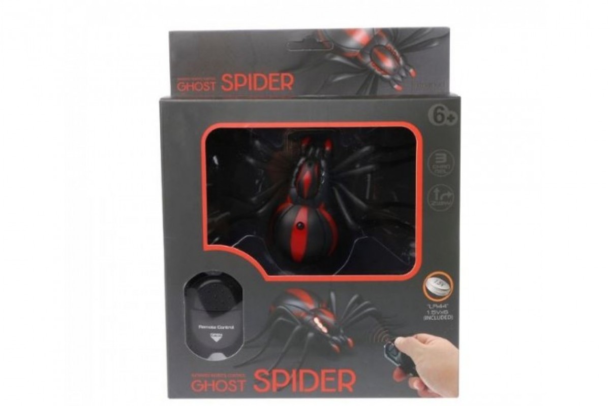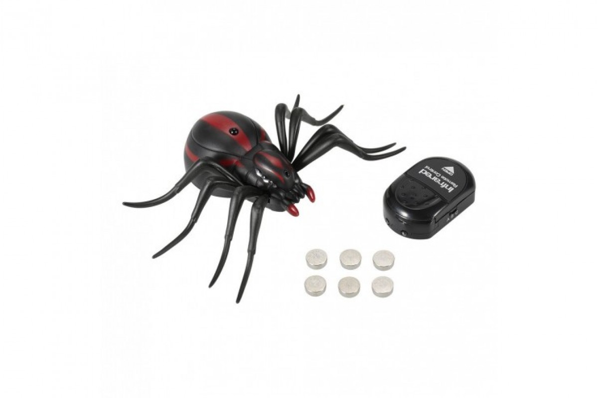 Красивый пластиковый паучок с гибкими лапками. С помощью пульта управления пауком можно управлять: передатчик ИК-сигнала, движение вперёд, поворот направо - круговое движение на 360°, демо-режим. Размер паучка: 8 х 3 х 15,5 см. Паук и пульт управления работают от батареек, которые идут в комплекте.