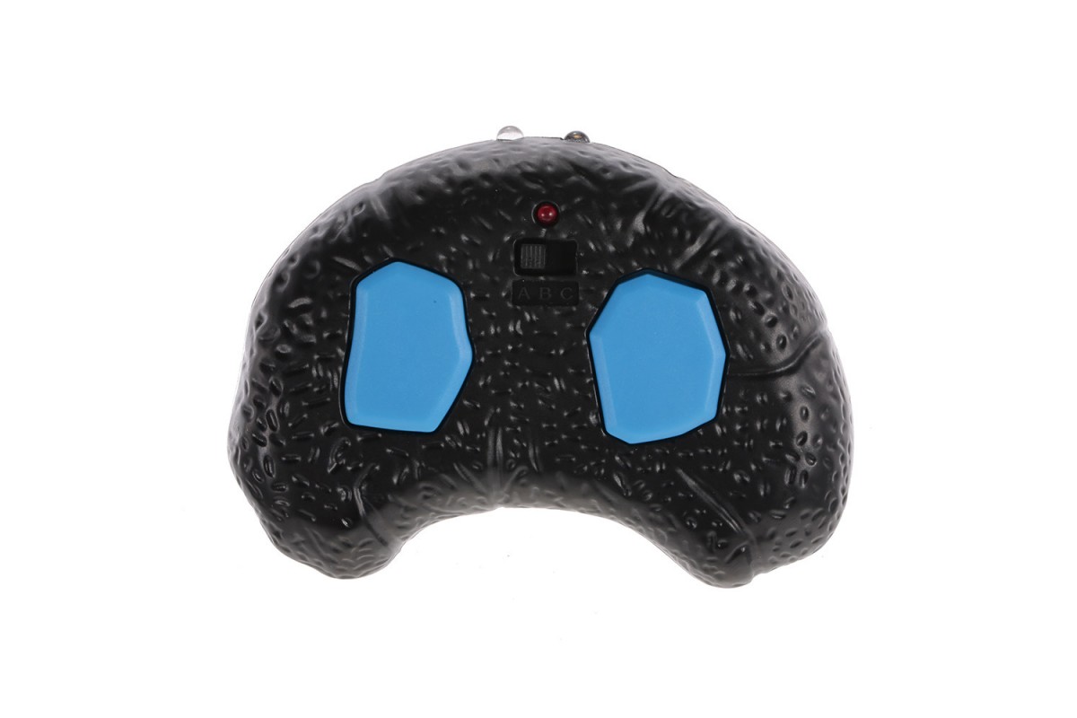 - Управление: работает от пульта (включается автоматически с включением игрушки) с попеременно мигающим LED-индикатором глаз (красный, зеленый, синий): двигается вперед и назад, передвигает лапками, раскрывает плащ, издает звуки.